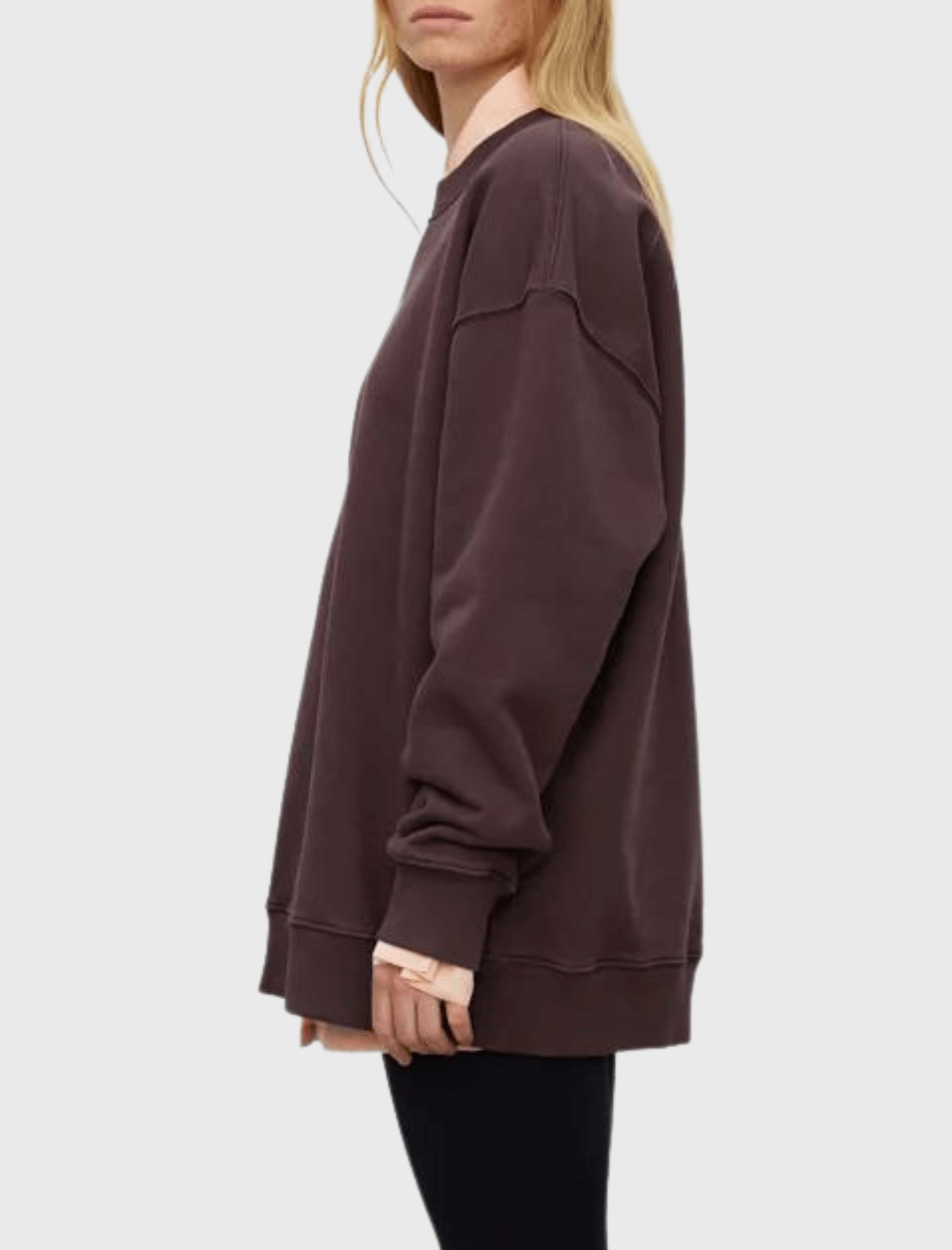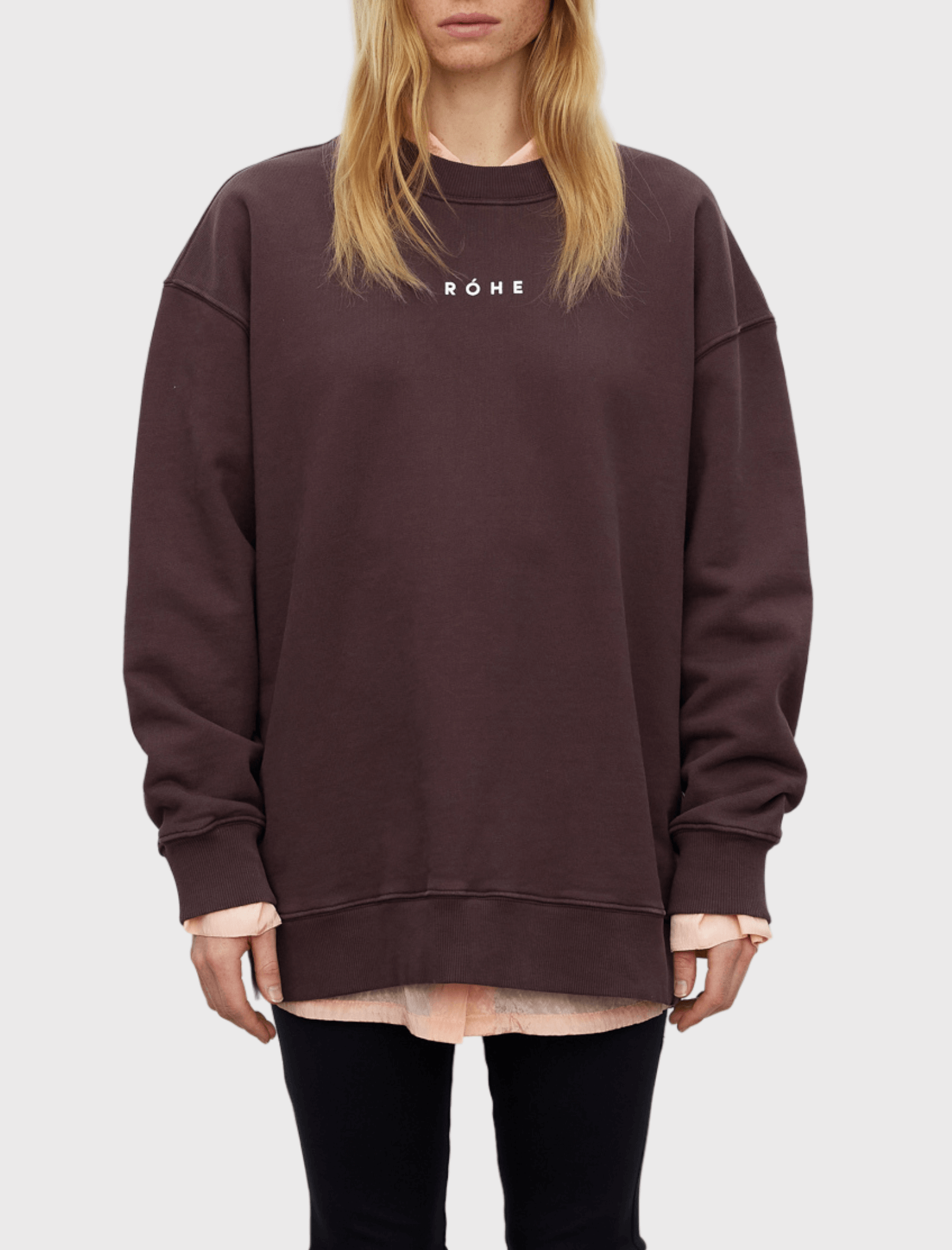 A classic oversized sweatshirt in this season's coveted colour. The rich chocolate hue is a must have in this french terry fabrication. The longline pullover has a ribbed collar neck line, and small logo print on the centre front. Pair with classic straight leg jeans or cropped leather pants for a elevated grunge vibes.