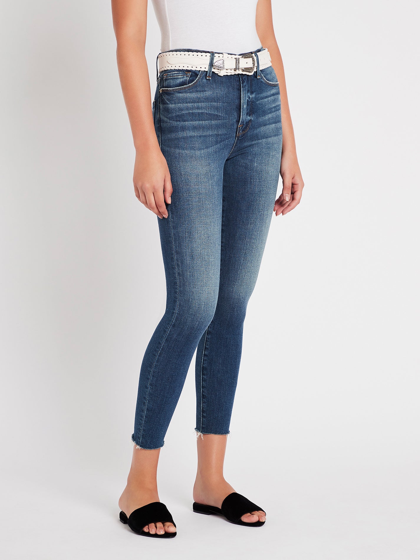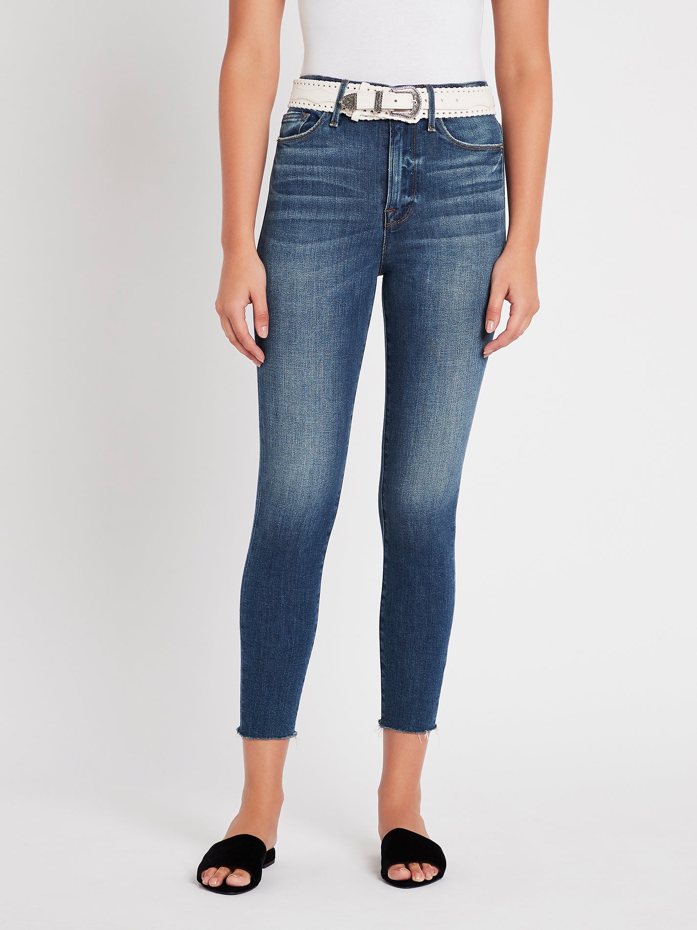 Kick off the weekend in comfort and ease with the Ali High Rise Cigarette Raw Edge Jean in Lupin by Frame Denim. These ultra high rise skinny jeans feature a vintage inspired wash with whiskering down the leg and are cropped in length with a raw edge finish. Team yours with easy tees and comfy knits for the ultimate weekend vibe.