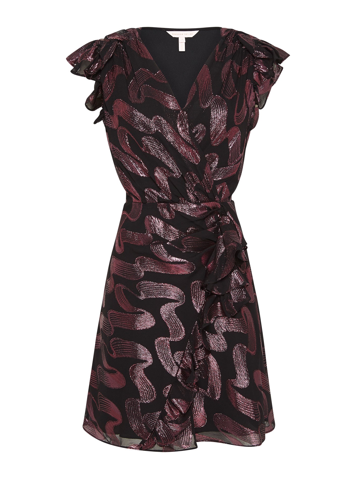 The Rebecca Taylor Sleeveless Ribbon Lurex Jacquard Dress has arrived to get you party season ready. Crafted from a silk and rich metallic blend this mini dress features a deep v-neckline with beautiful ruffle detailing adorning the sleeves and makes its way down the skirt. The subtle black and plum palette allows the lurex threading to be a subtly rich print for those many summer nighttime events.