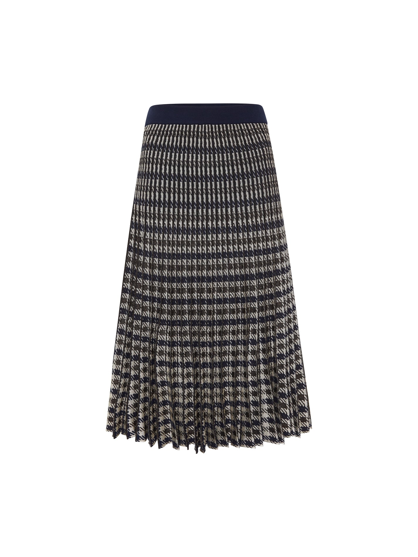 Add a bold classic to your wardrobe mix with the Baum Und Pferdgarten Cyrilla Skirt in Brown Blue Houndstooth. Crafted from an ultra soft lurx organic cotton knit blend, this midi skirt features an elasticated ribbed navy block waistband and is finished with beautiful pleats that glitter gold. Team back with the Baum Und Pferdgarten Calendre Cardigan in Brown Blue Houndstooth to complete the look.