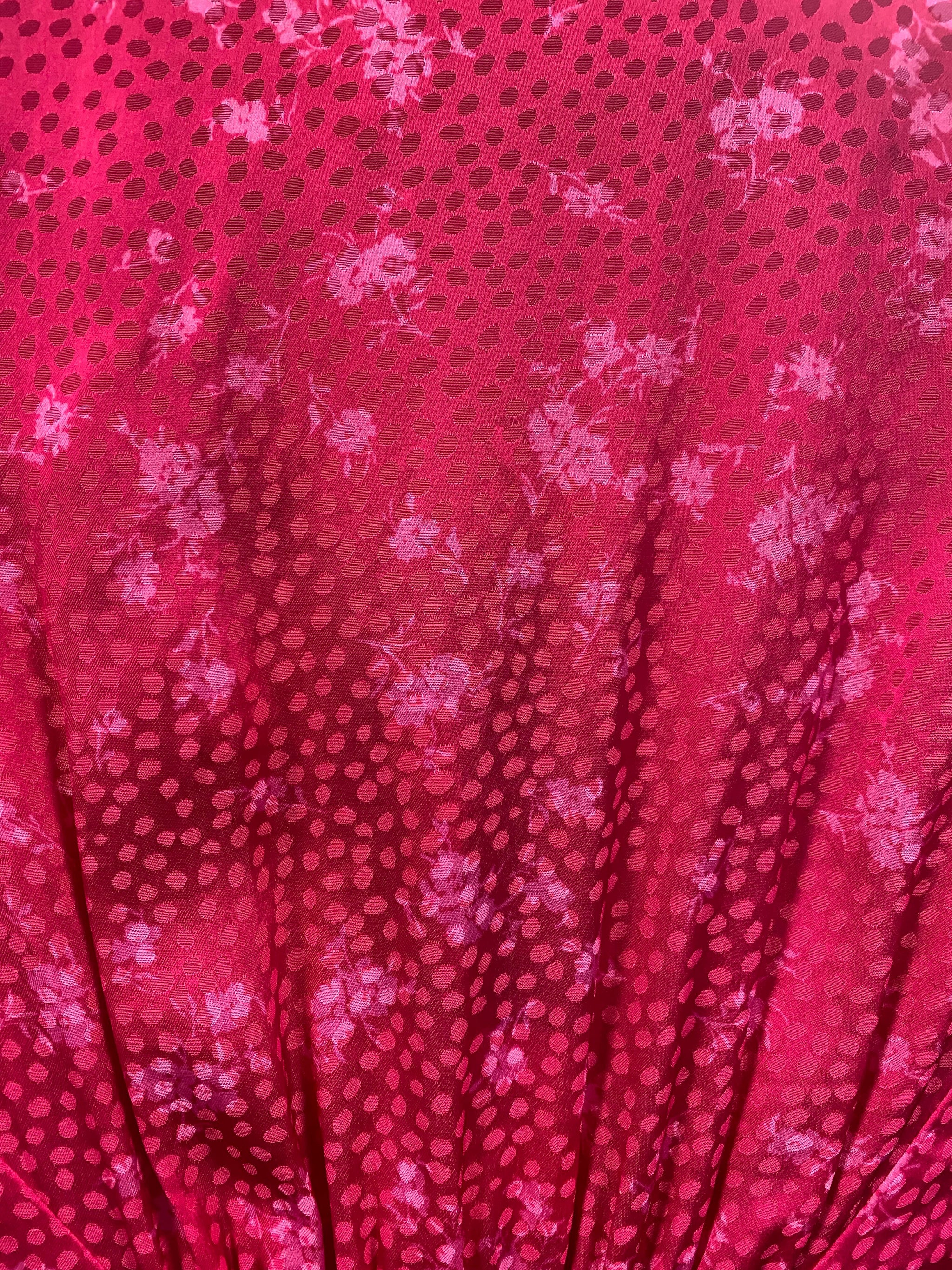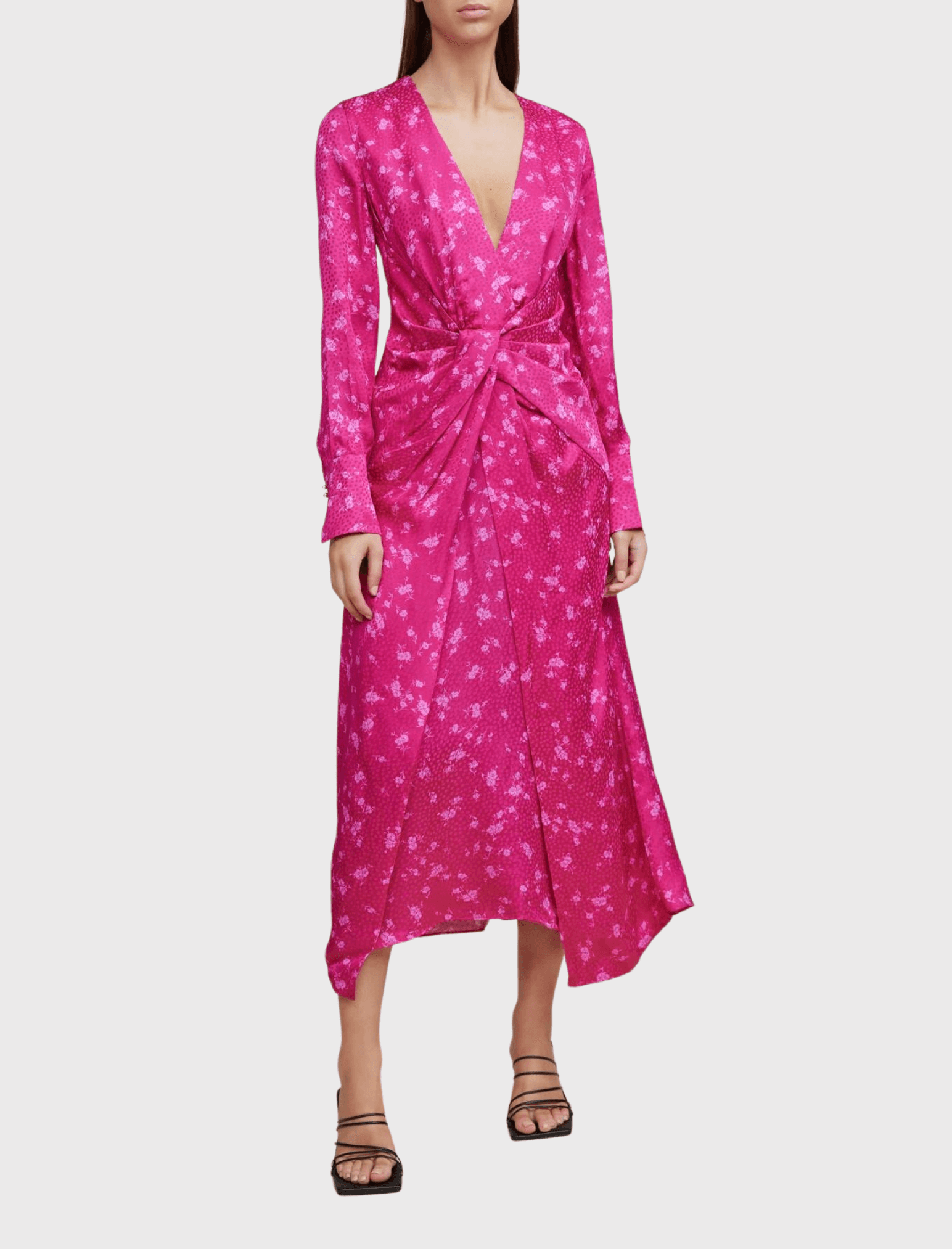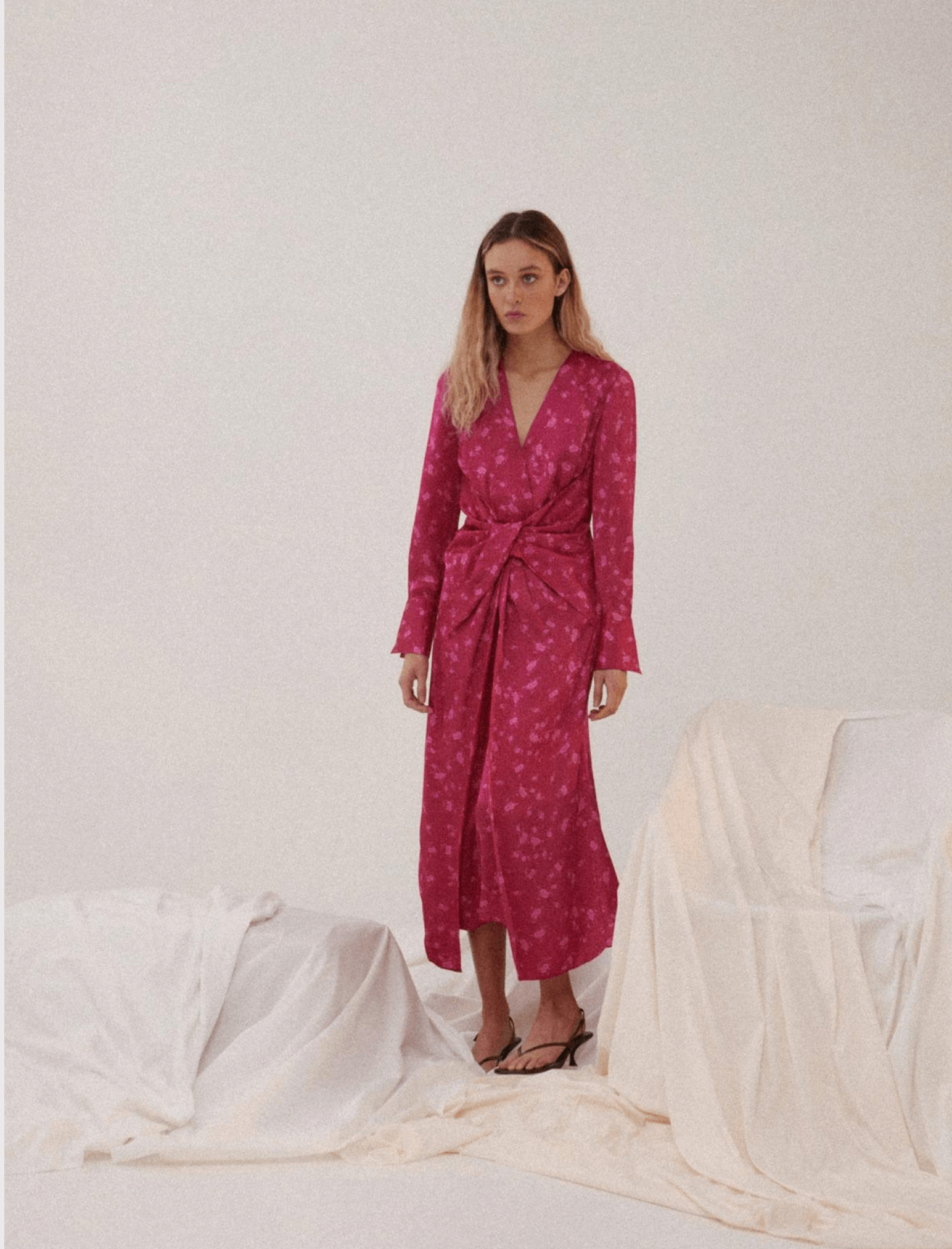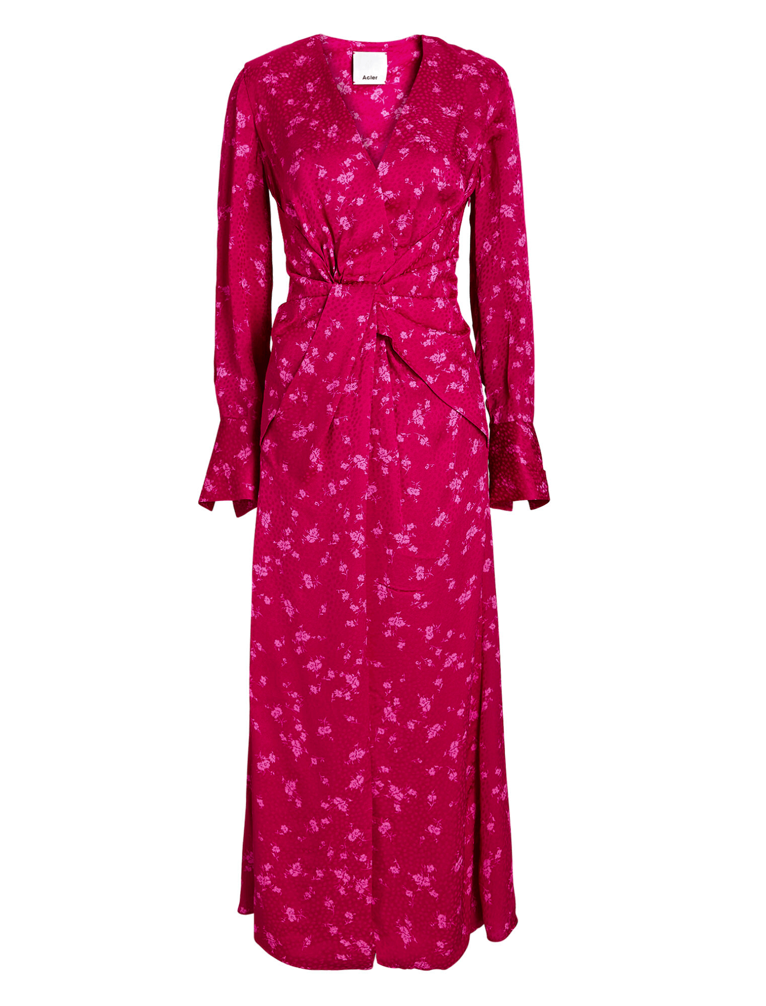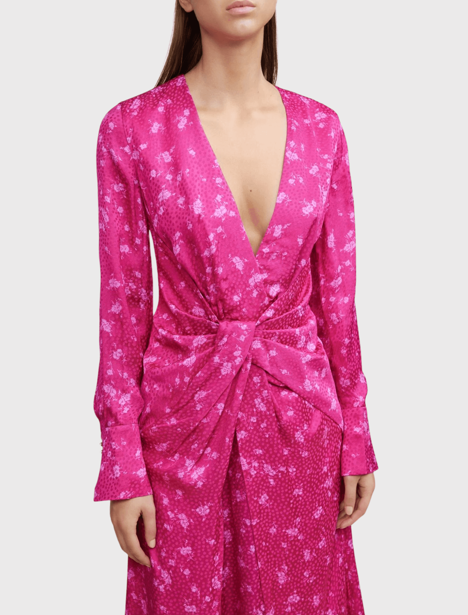 Acler's stunning statement dress for the season is without a doubt the Wetherby Dress in Fuchsia. This long sleeved, midi length dress is designed to drape around the body in a relaxed silhouette. Featuring a gorgeous plunging neckline, flute cuffed tailored sleeves with gold button detail and twist detail at the front. Side zip entry with a centre back elastic waistband for a comfortable fit. The bright pink fabric features a delicate mini floral print on top of a spotted jacquard design for a attention grabbing look this event season.