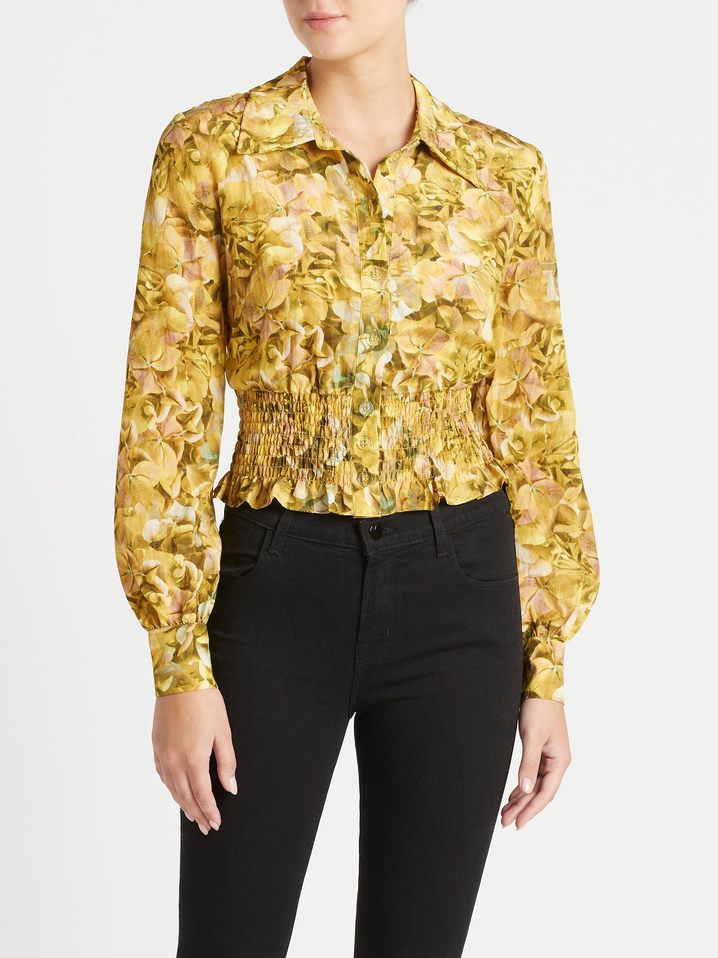Add a pop of sunshine to your wardrobe with the Baum Und Pferdgarten Maeko Shirt in Yellow Hydrangea. Constructed from a soft viscose blend this long sleeve shirt features Blouson Sleeves, a centre front button opening with classic collar and is finished with shirring at the waist for a super flattering finish. Team with high rise black pants and strappy white heels for easy weekend BBQ attire..