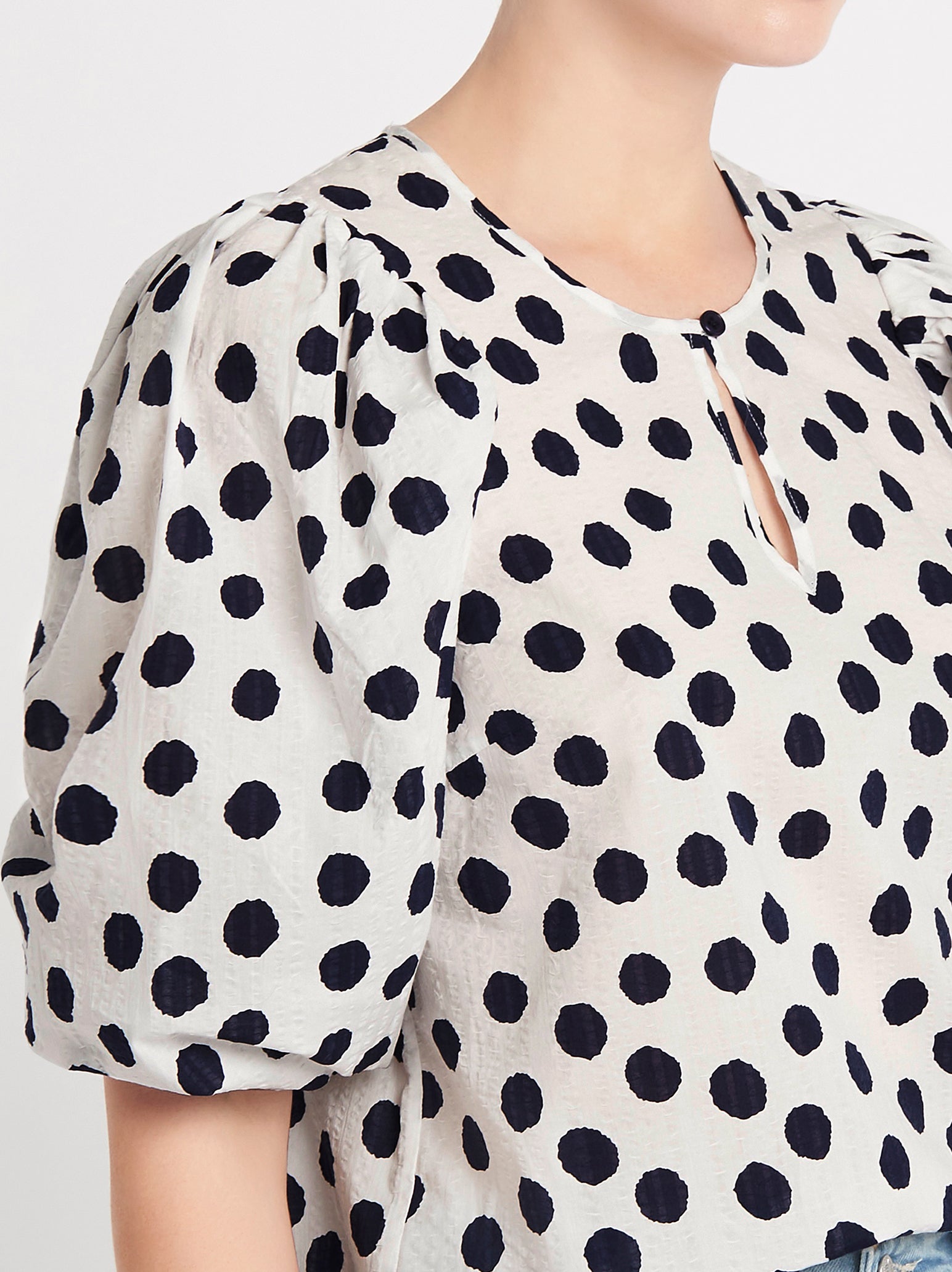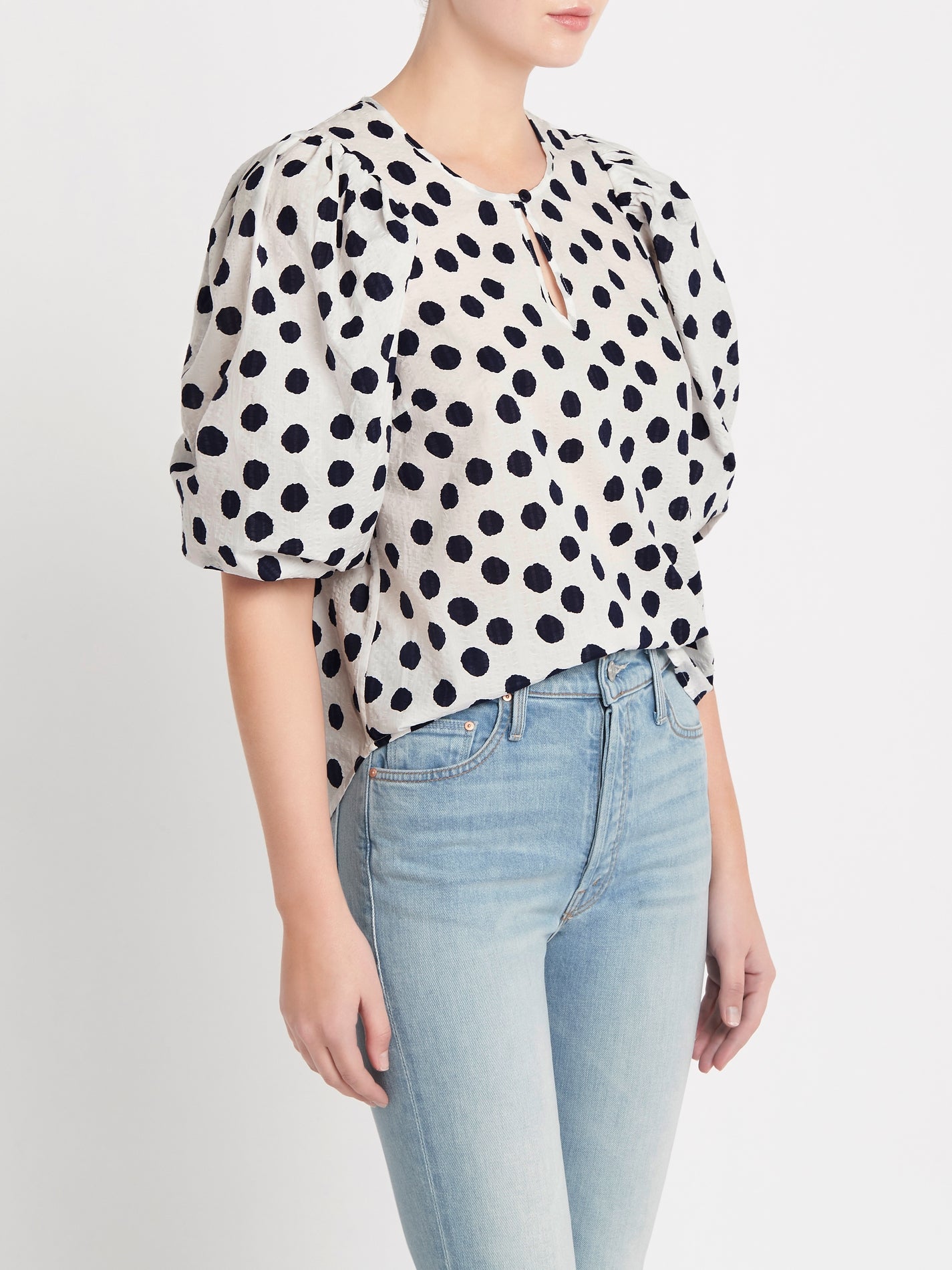 A short sleeve pop over style with puff detail, the feminine Miha Blouse from Baum Und Pferdgarten in Patriot Mega Dot is stable piece for your everyday wardrobe. The high neck is finished with a single button detail above a small keyhole opening. This textured 100% Organic cotton piece works well styled with kick flare denim and fresh white sneakers.