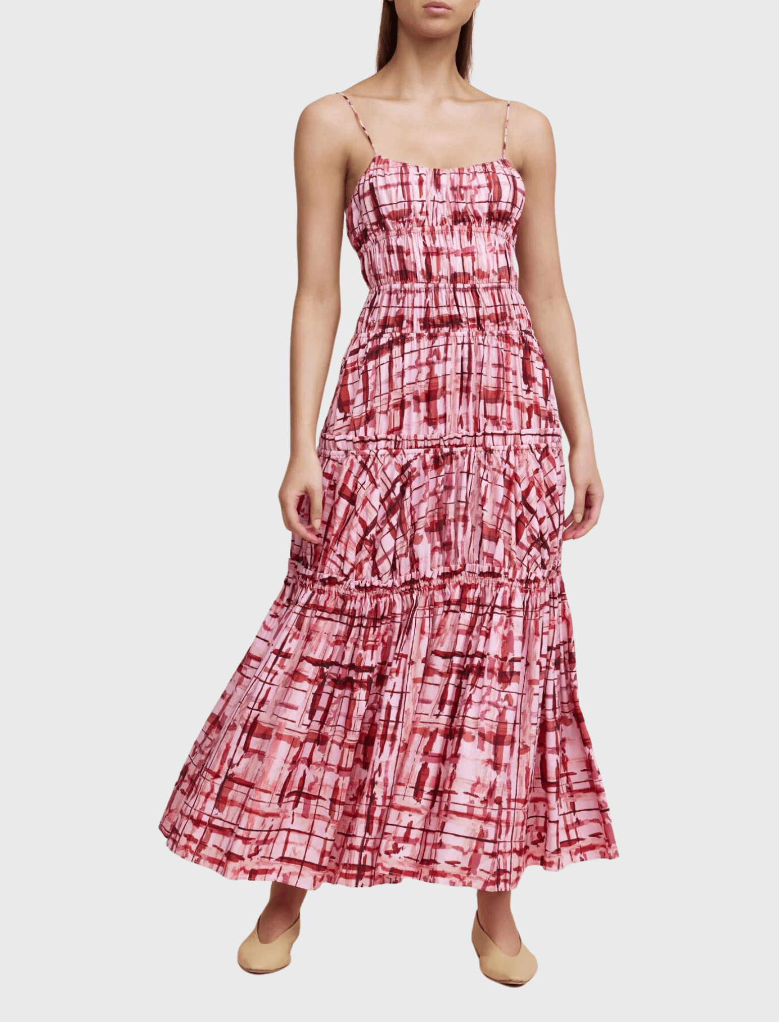 A standout print defines the Hansen Dress, adding a touch of visual intrigue and contemporary charm. The tiered fabrication towards the hem creates a graceful and flowing silhouette, allowing for effortless movement and an added element of sophistication.