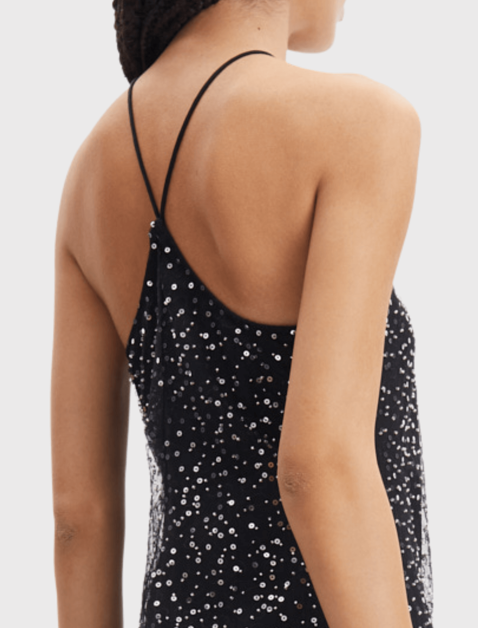 You'll sparkle like the night sky is the striking Ytzen party dress from Samsoe Samsoe. This midi dress is a reinvention of a classic halter style with thin spaghetti straps and a revealing cut away back shoulder. This gorgeous column shaped dress hits just above the ankle and is the perfect style for a chic party look this holiday season.