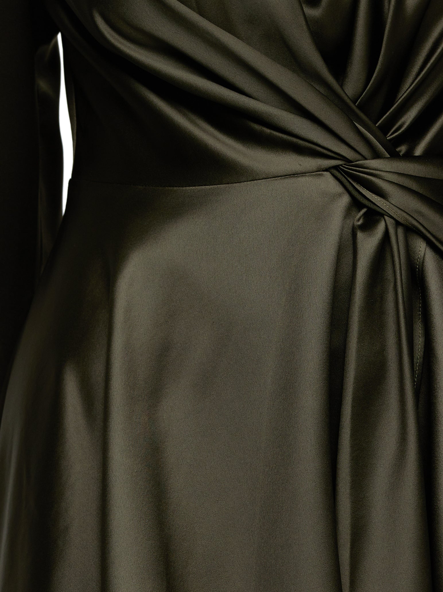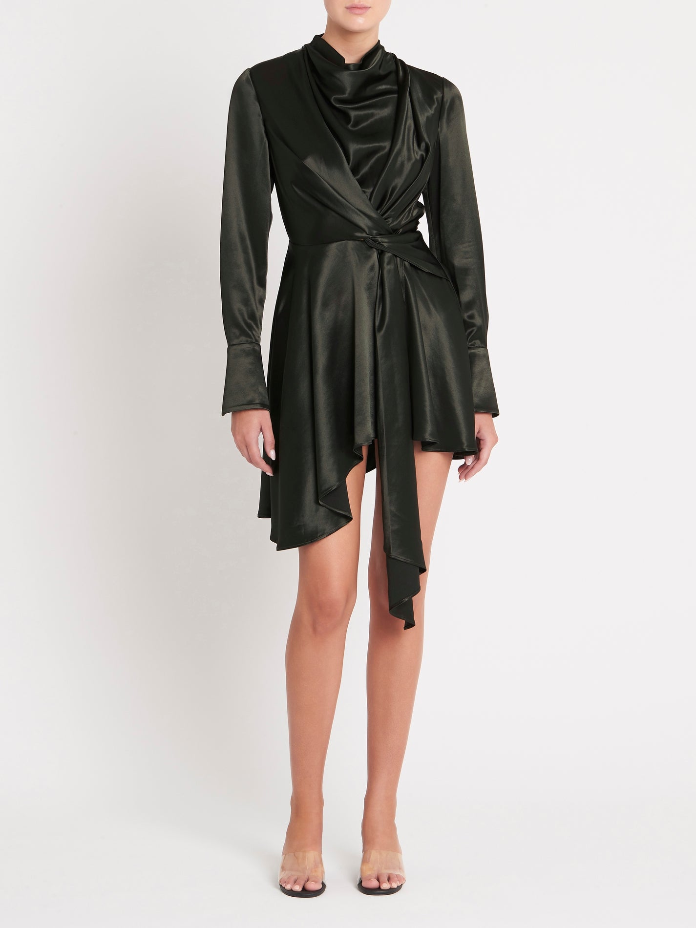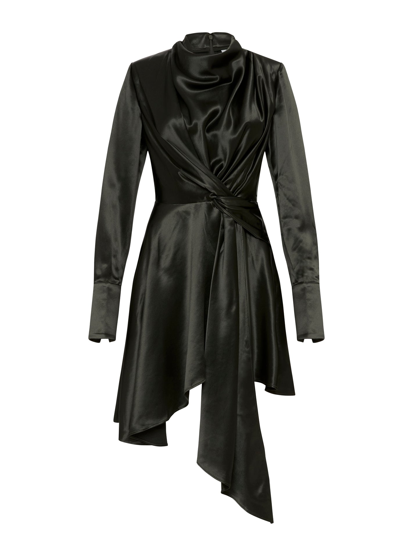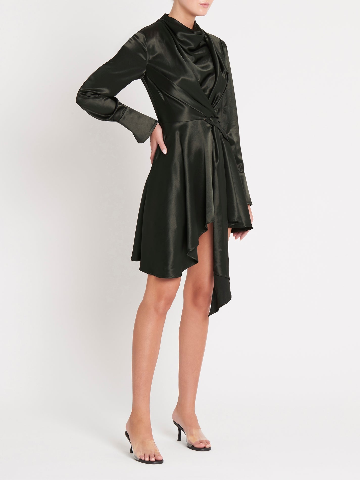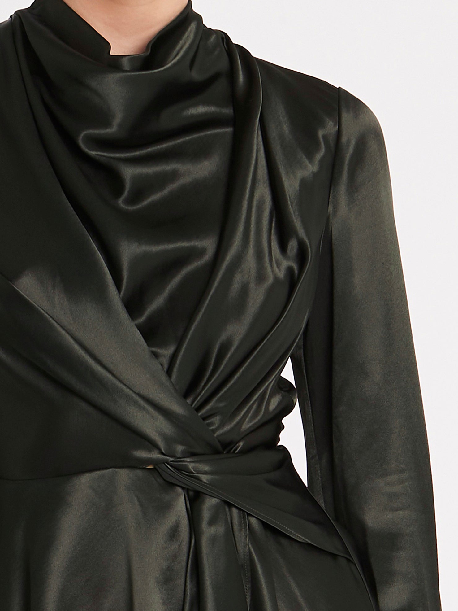 The Acler Simmons Dress in Forest Green is a shining delight inspired by nature. The fitted bodice has a mock cowl neck which flows down the body and gives way to a relaxed floaty skirt, featuring full length tailored sleeves with gold button detail. The silky fabric is artfully draped across the bodice and finished in a twist detail at the side of the waist.