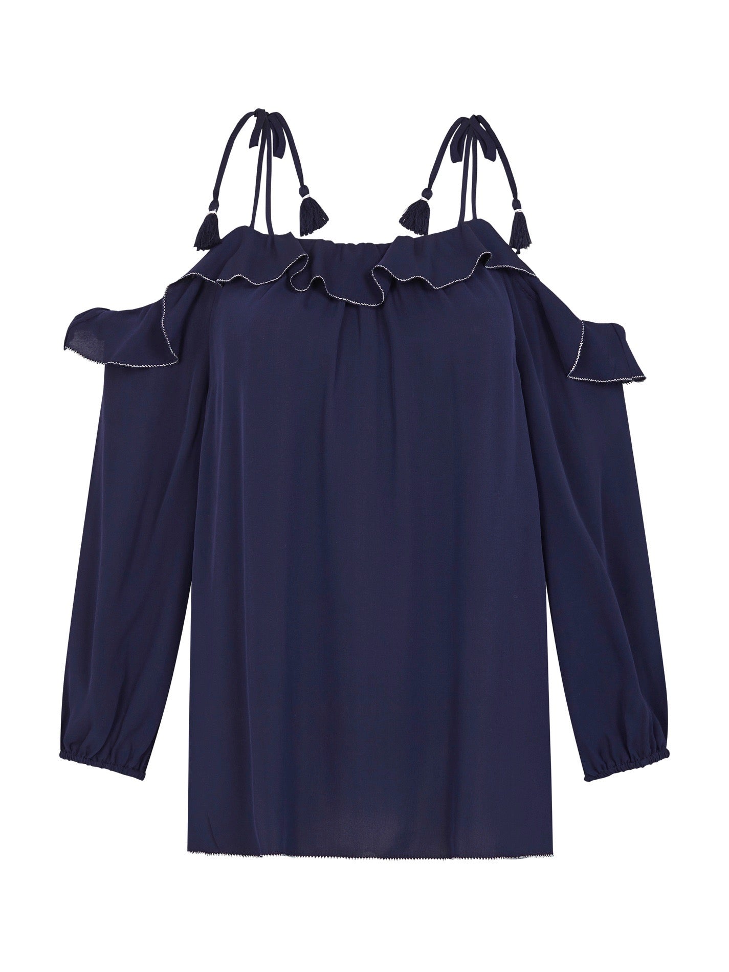 Add a touch of romance to your look with the Joie Eukene Blouse in Dark Navy. Constructed from an ultra soft silk this piece features a ruffled layer over the shoulder -baring neckline, three quarter length sleeves with a gathered cuff and knotted straps. Team this piece with a little black skirt and heels for the perfect date night look or with your favourite denim for easy weekend style.