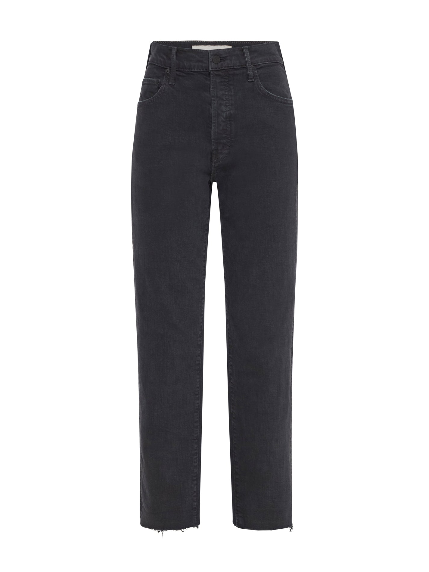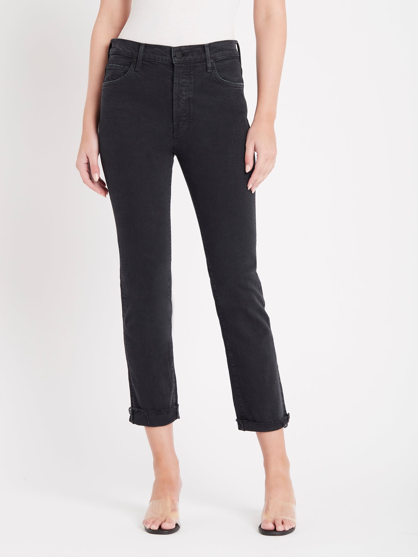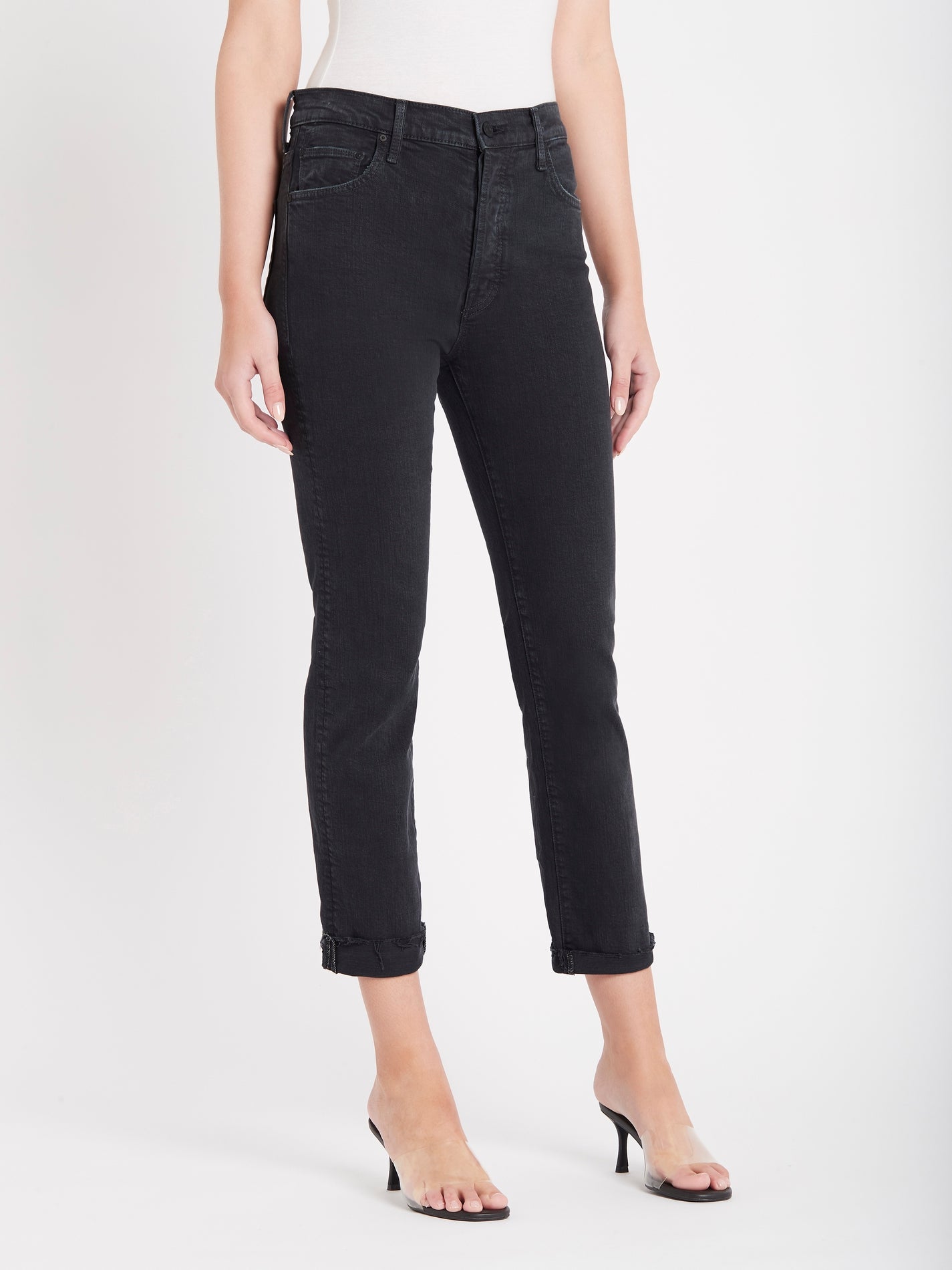 The Mother Denim Scrapper Cuff Ankle Cuff Jean in The Devil May Care Faded Black is made from 98% Cotton and 2% Elastane