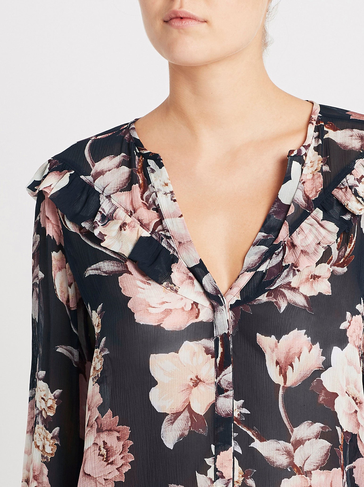 Soft and romantic, the Paige Amore Blouse in Evening Sand / Black is made from 100% silk to delight your skin. This button-up blouse has a ruffle detail, a gorgeous floral print, and a wide neck tie. It's love at first sight- it's the Amore Blouse.