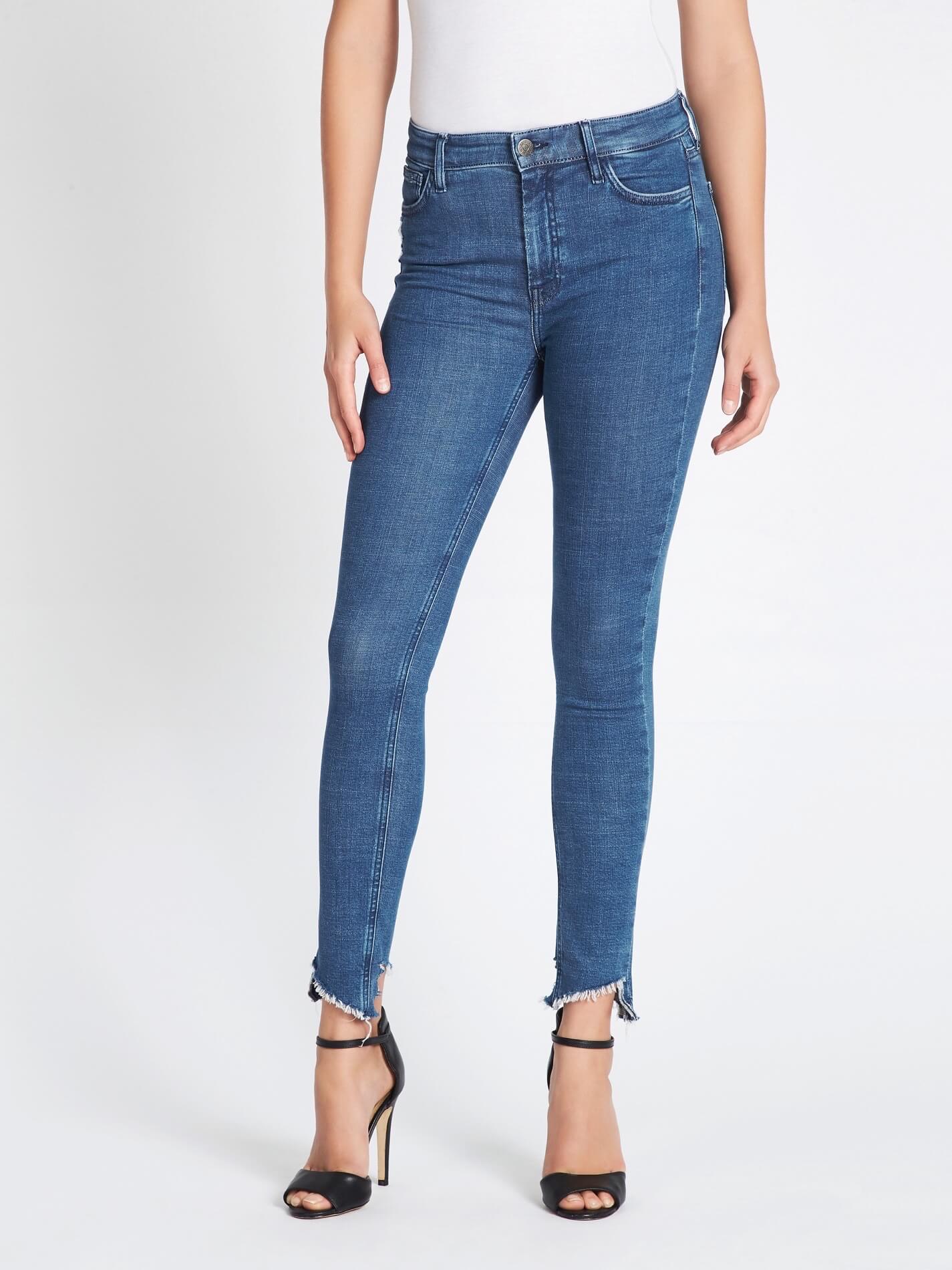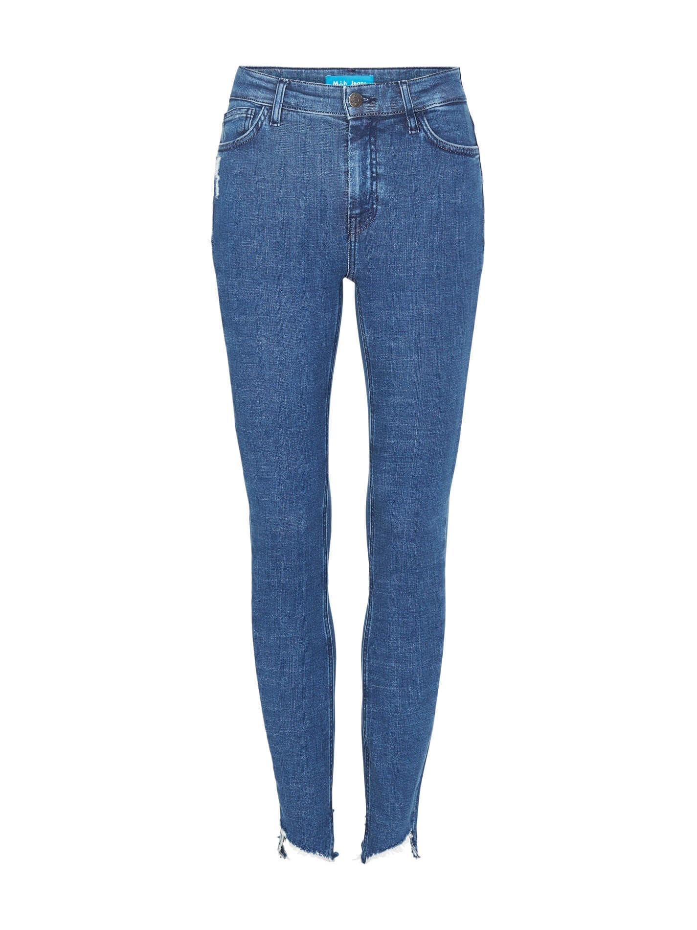 The M.i.h Bridge Jean in the wash Bluest is the perfect high rise jean with a twist. Constructed from a cotton blend stretch denim these jeans skinny leg jeans feature 5 pockets, a super long zip fly opening, silver hardware and have been finished with stagger cut hems that have been naturally frayed.