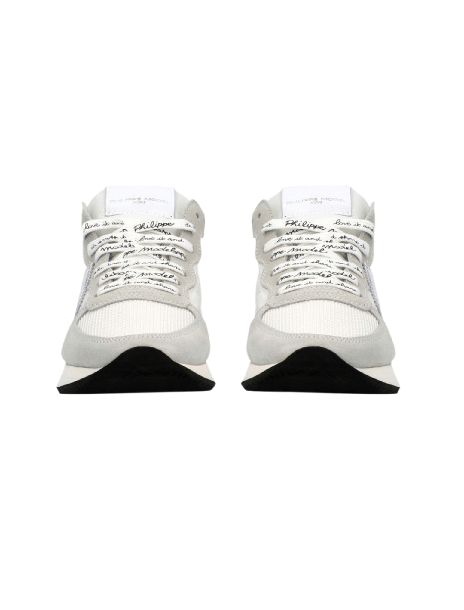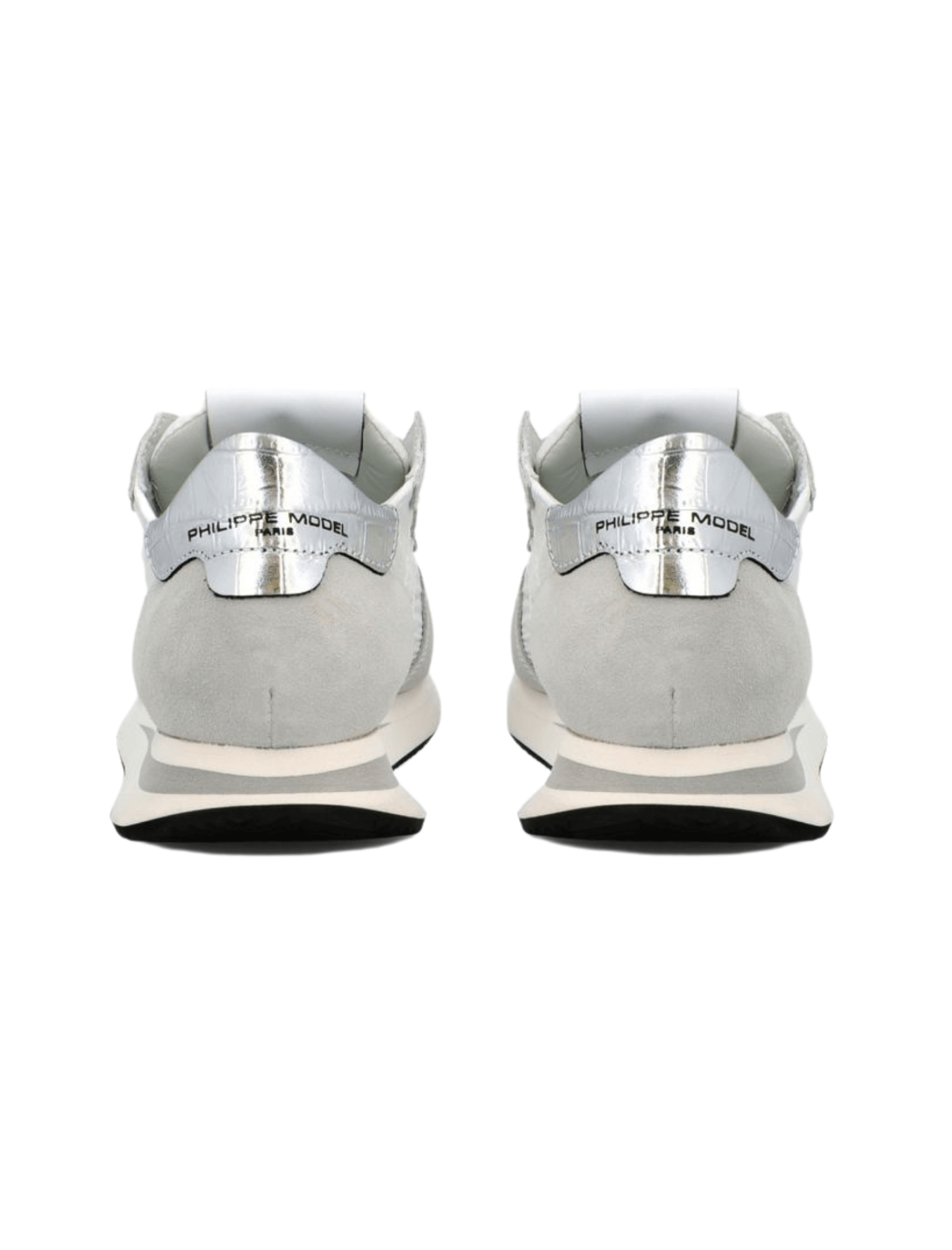 Step up your white sneaker game in the Philippe Model TRPX Low Sneaker in Croco Blanc. This iconic vintage inspired style has a upper panel made from suede with nylon mesh fabric and a silver crocodile effect print laminated calfskin heel tabs. The logo printed laces have a worn effect, the style is completed with a slight wedge heel ensuring the TRPX will always make your weekend outfit fresh.