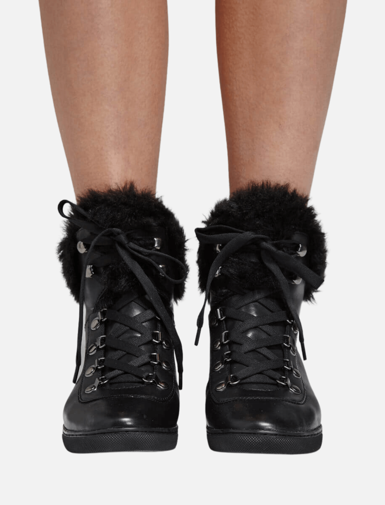 Crafted with arctic chic in mind, this shoe features a super soft faux-fur collar that adds a touch of elegance and coziness to a streetwise high-top sneaker design. The silver grommets and platform rubber sole add a touch of sophistication and durability, making these boots perfect for any winter adventure.