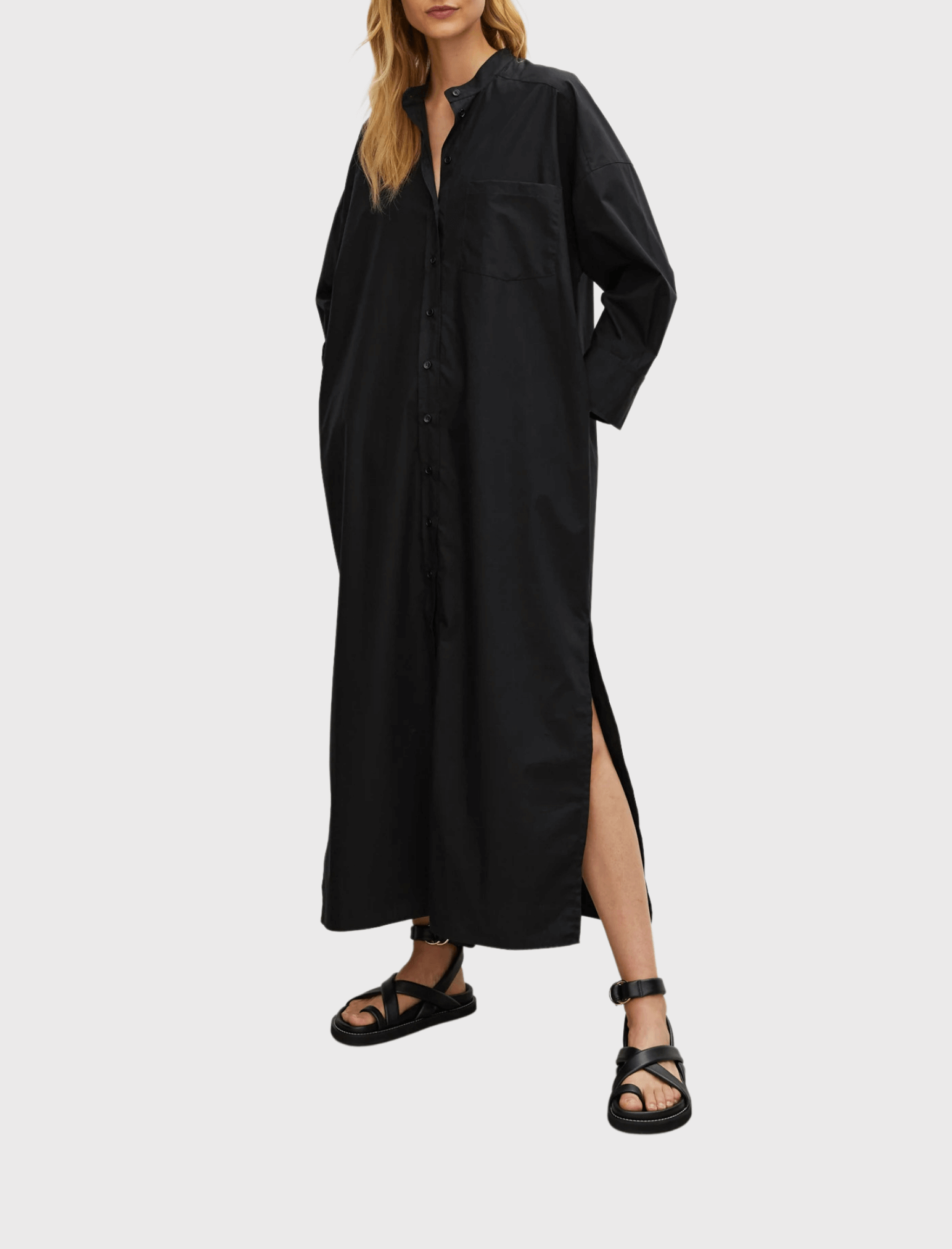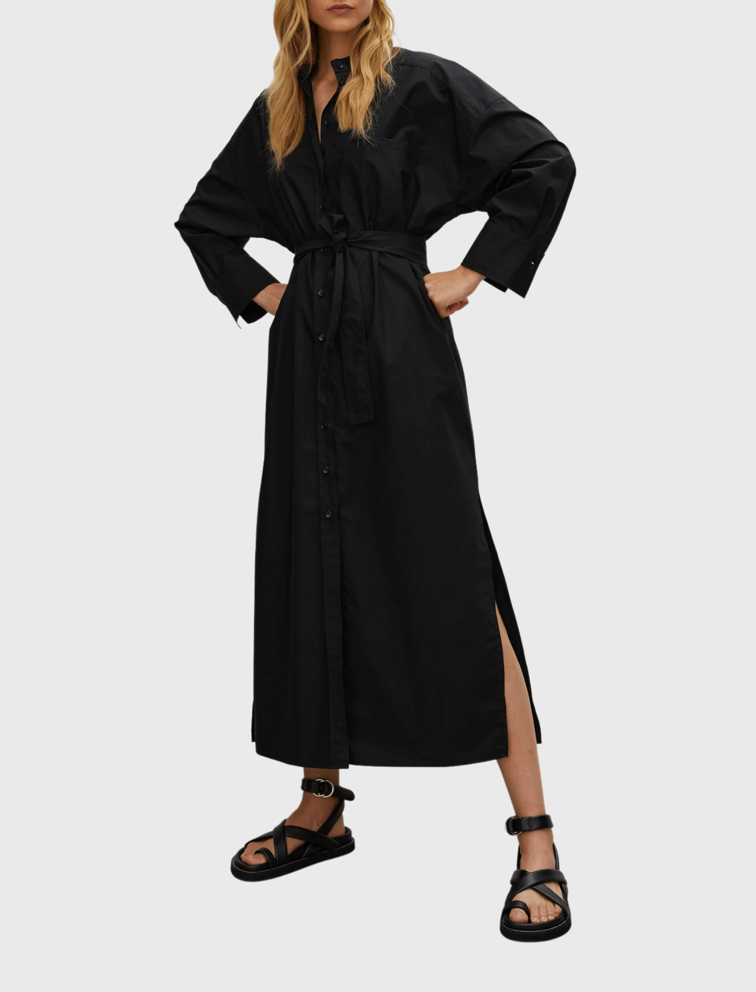 Timeless and modern, the Róhe Tiga Dress in Noir is the ultimate addition to any wardrobe. This easy and comfortable cotton midi dress features a removable waist belt, a centre front button opening, bracelet length cuff sleeves and is finished with a side slit at the hem.