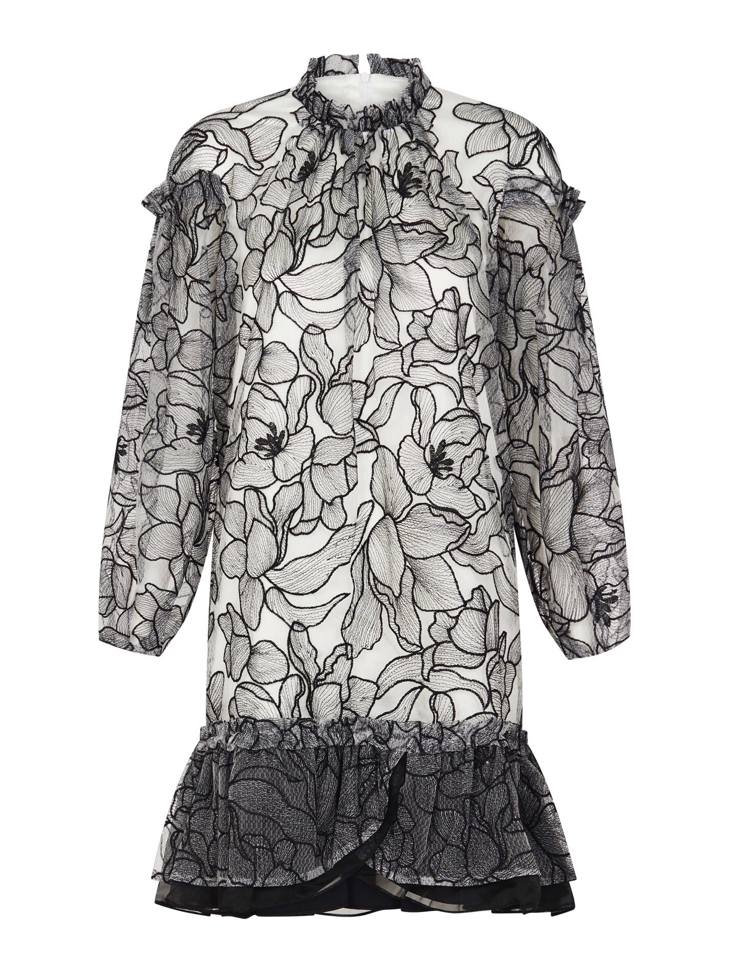The Floral Factor Dress from Three Floor is a retro inspired shift dress with a sheer sleeve detail. Constructed from a sheer organza covered with black floral embroidery design the dress has a high Elizabethan collar, frill cuffed sleeves and a frill trimmed hemline. Invisible back zip closure.