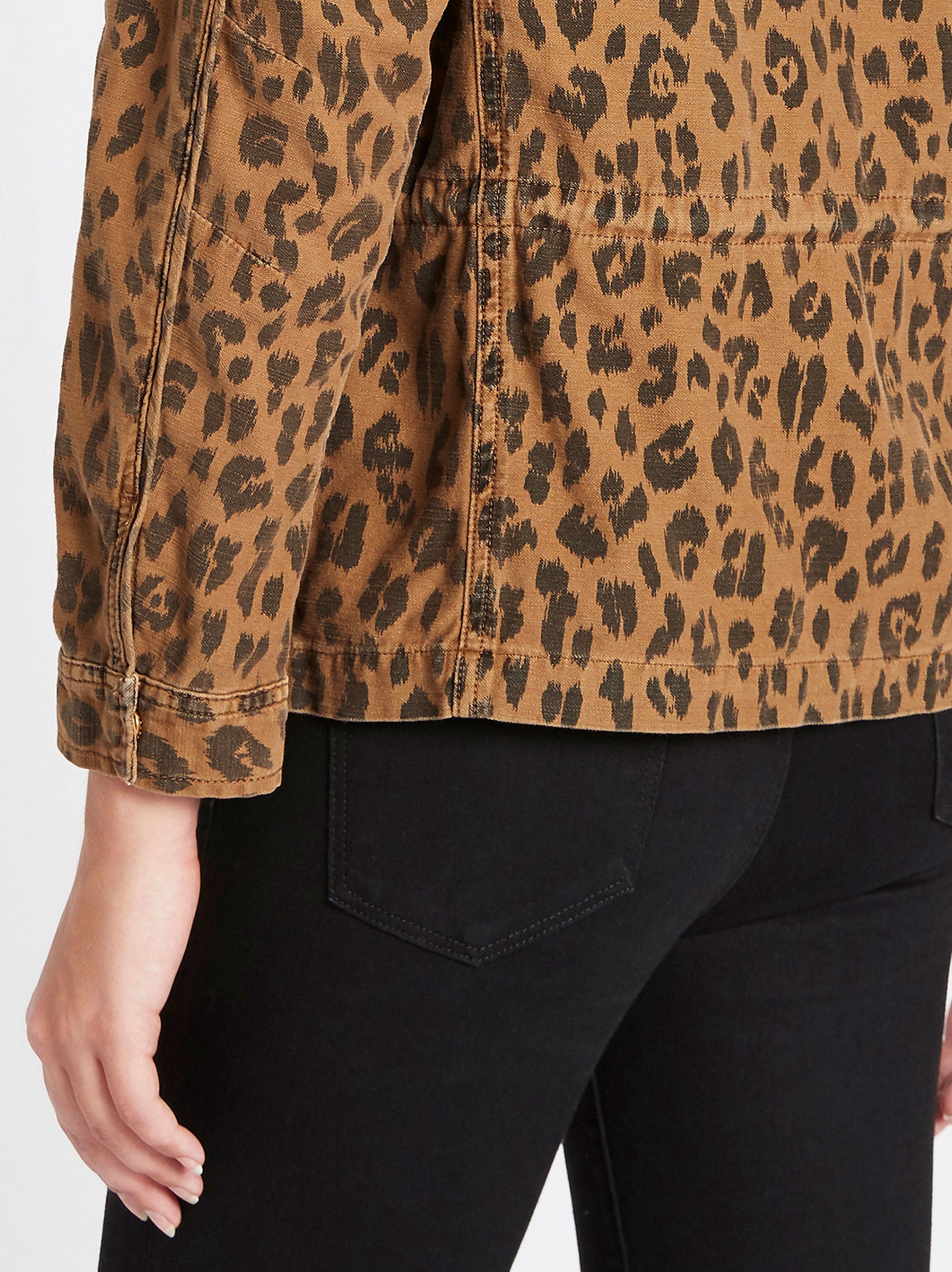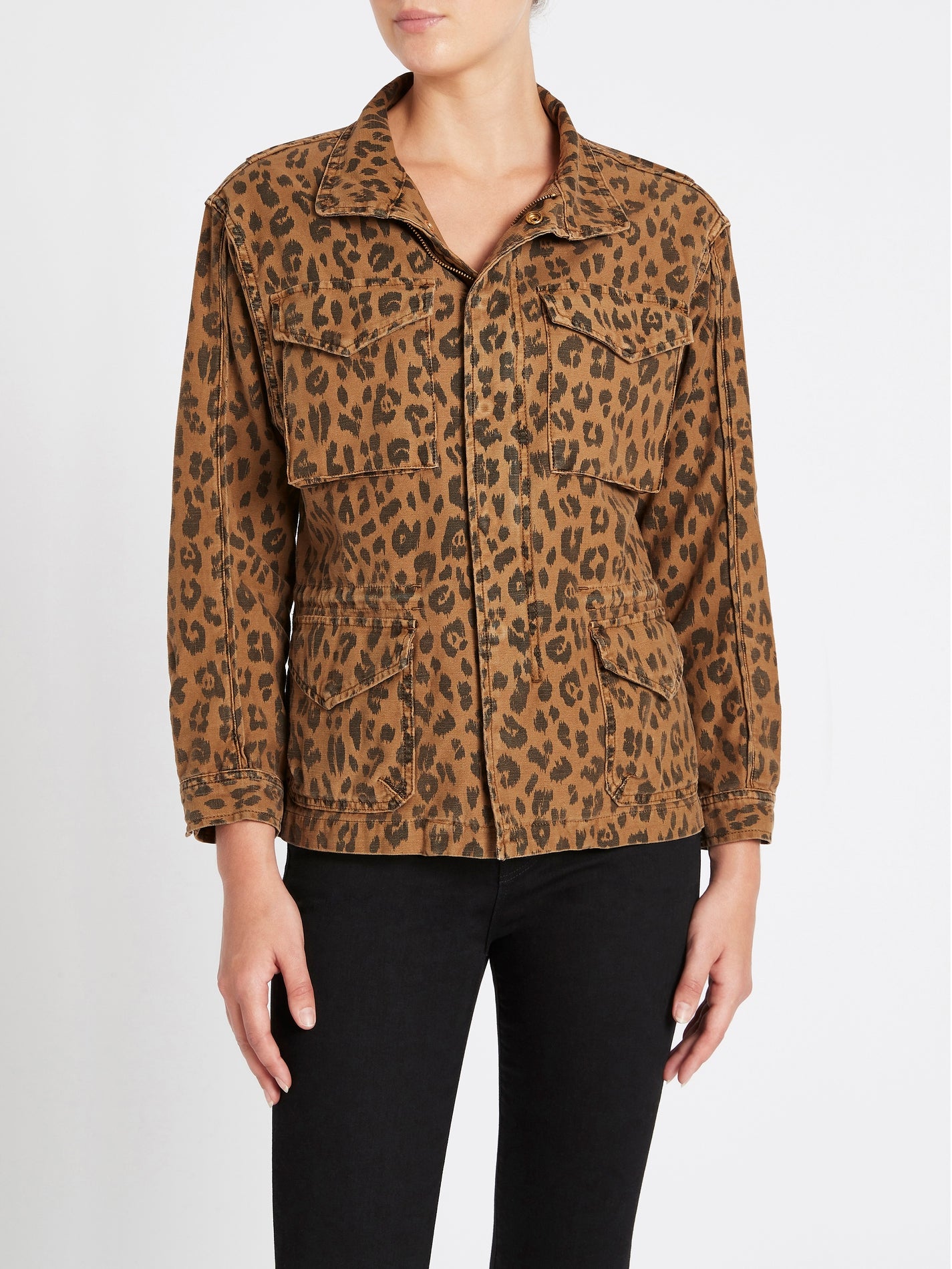 The Frame Denim Spring Cheetah Service Jacket in Cheetah Cargo is made from 100% Cotton