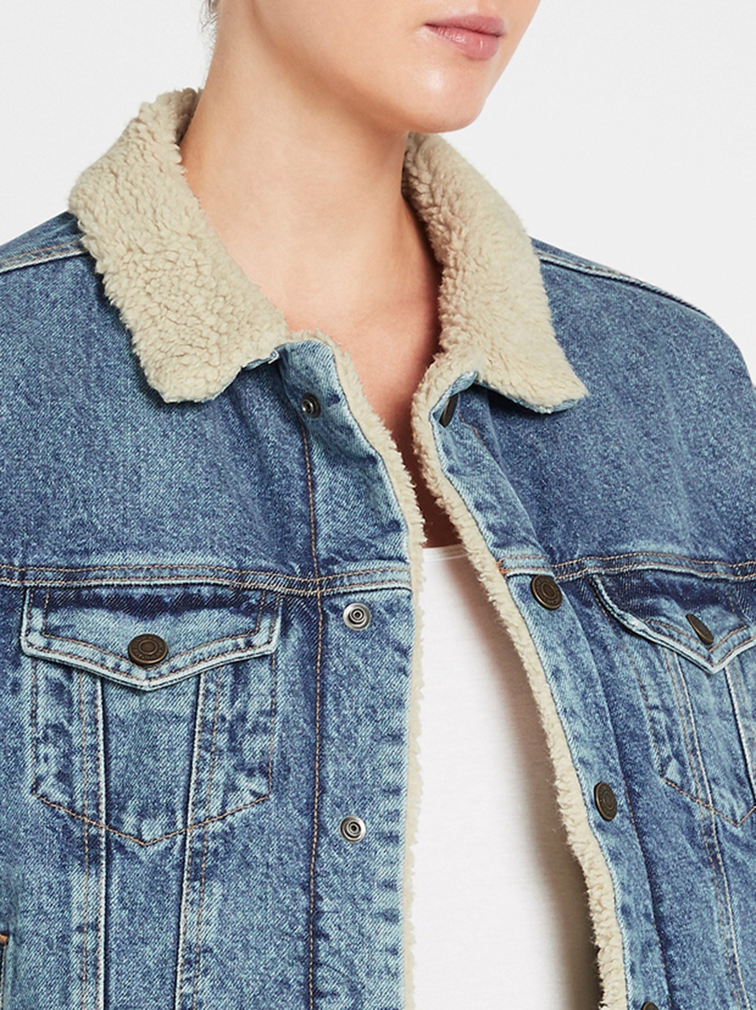 Take the much loved denim jacket into winter with the American Vintage Wipy Denim Jacket in Stone Salt & Pepper. With a classic blue denim outer and super warm faux shearling inner this must have piece features a centre front opening with snap button closure and is finished with breast and side pockets. Wear over a light knit with high rise black denim for easy winter style.