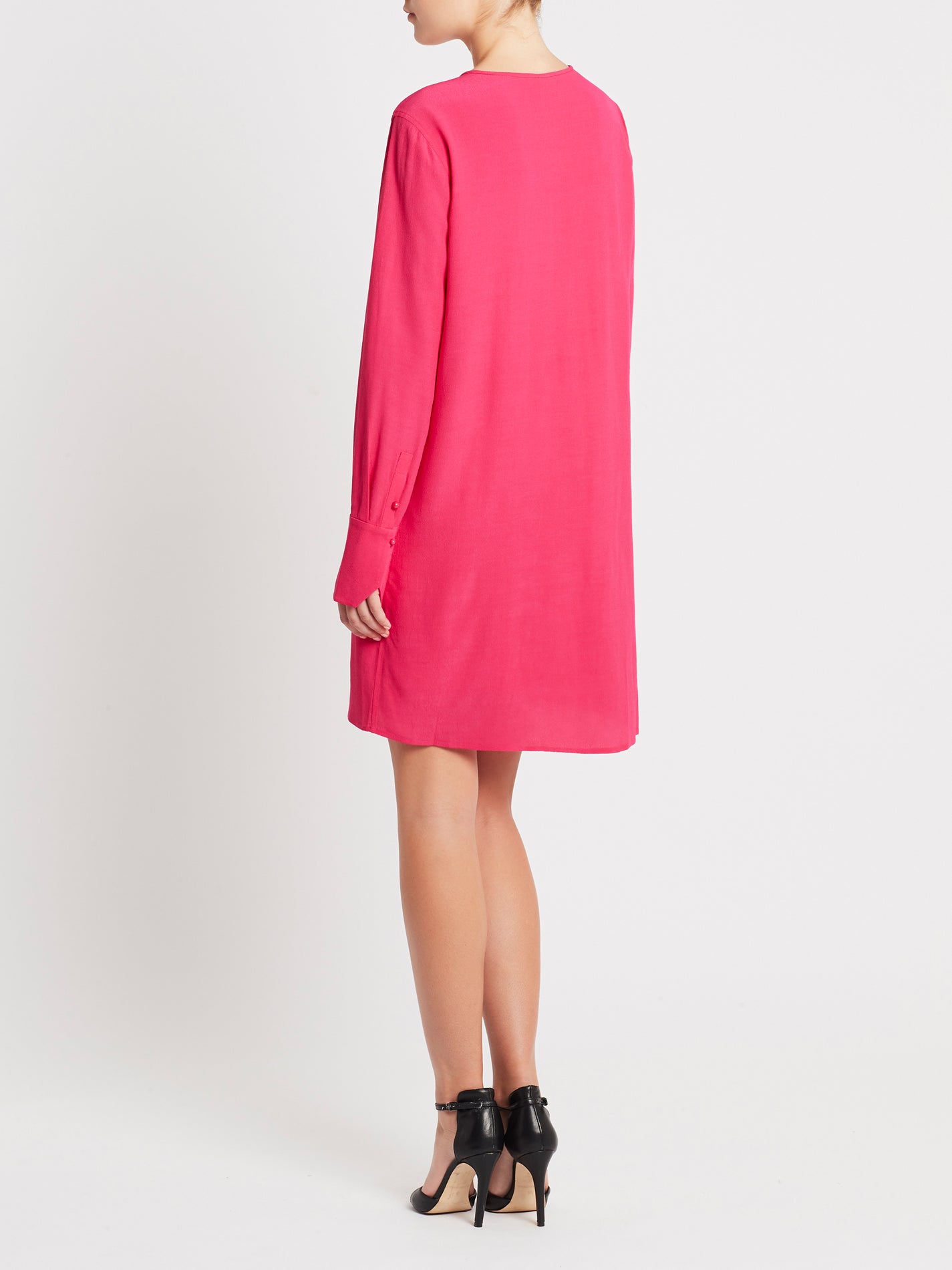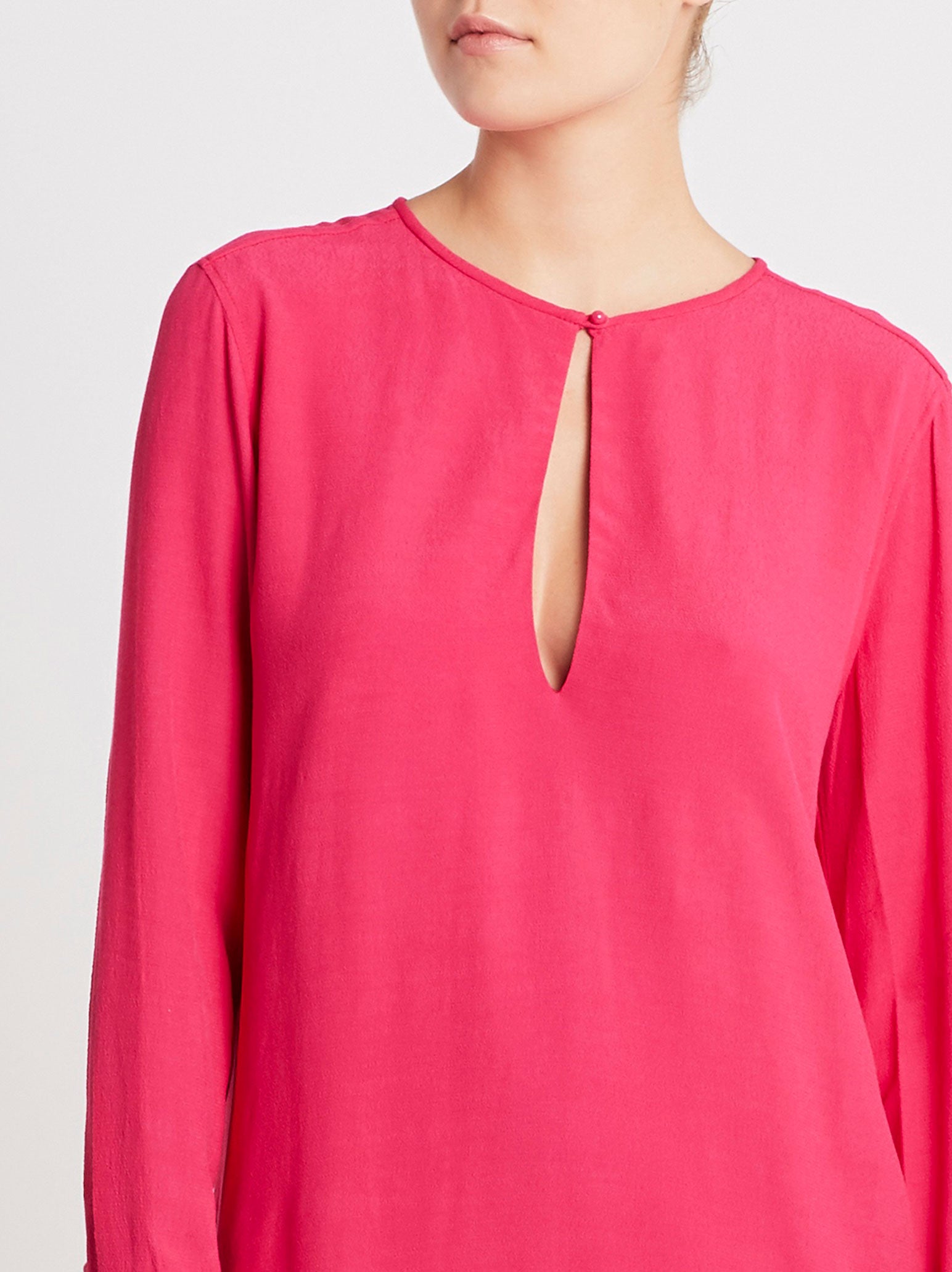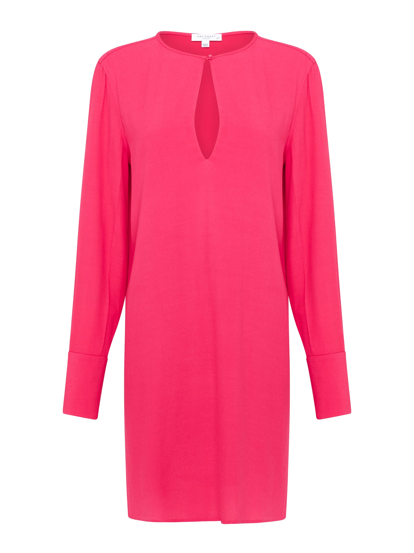 Think Pink with the Bonnie Dress from Equipment, in the stunning shade of Carmine. This relaxed drapey dress has a rounded neckline, long sleeves, and a keyhole cut with button closure on the chest. Constructed from mixed fabrics, this dress refuses to go unnoticed.