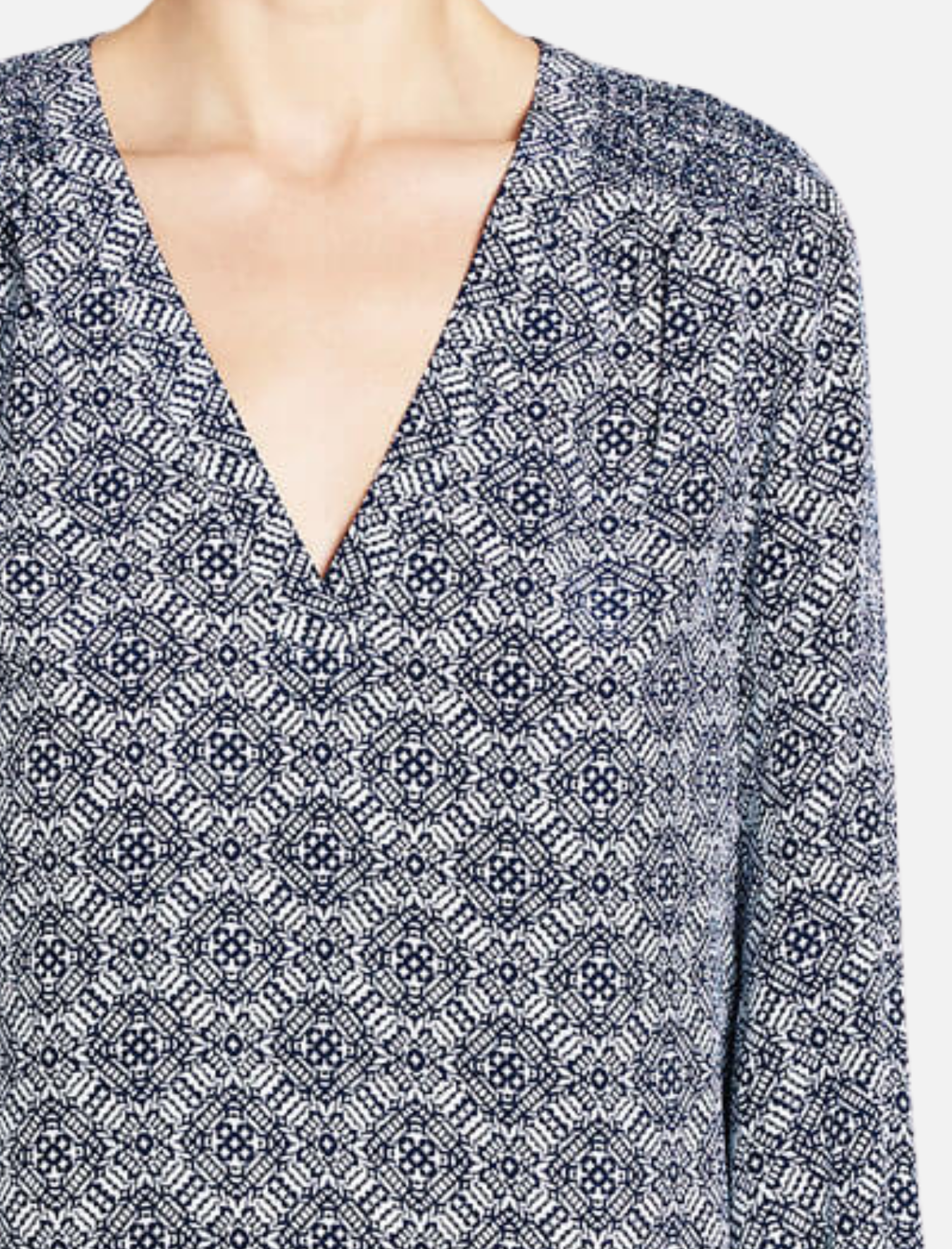 Made from the softest silk, the Axel Blouse by Joie is a blue and white graphic printed piece. A relaxed fit, it features 3/4 length sleeves with elasticated cuffs and shoulder pintucking, and is a V Neck top.