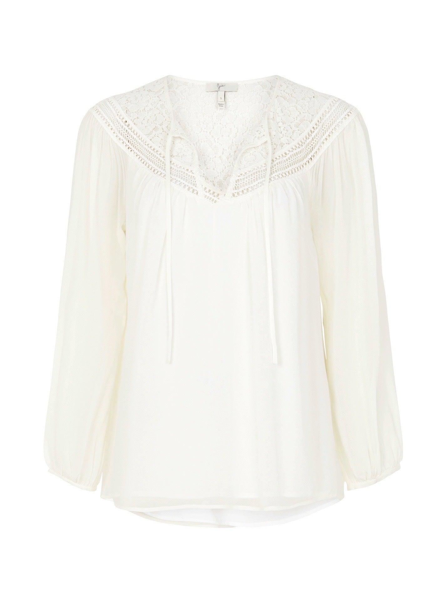The Joie Belleville Blouse in Porcelain is made from 100% Silk / Lace: 46% Rayon 29% Cotton 25% Nylon / Lining: 100% Polyester