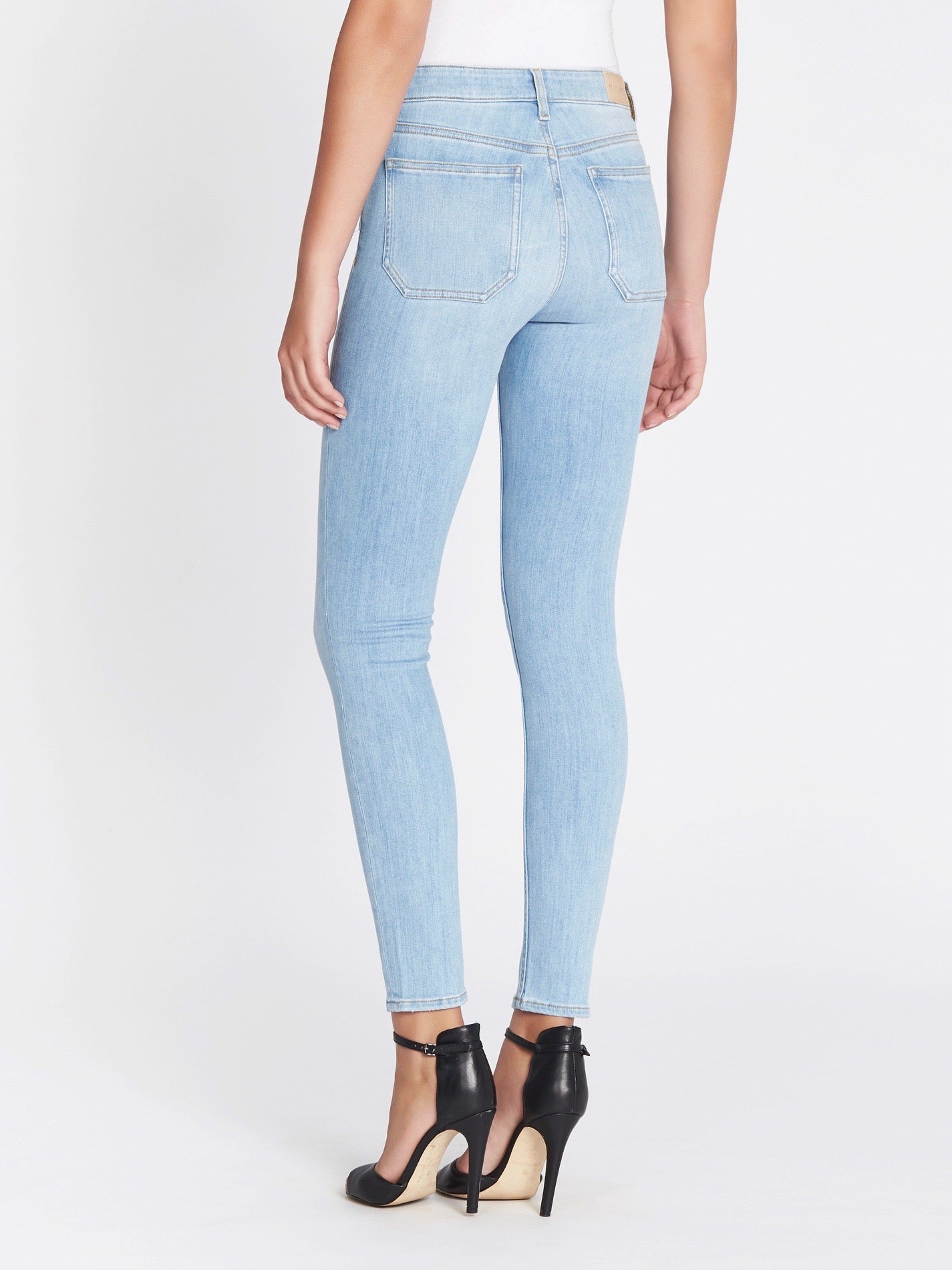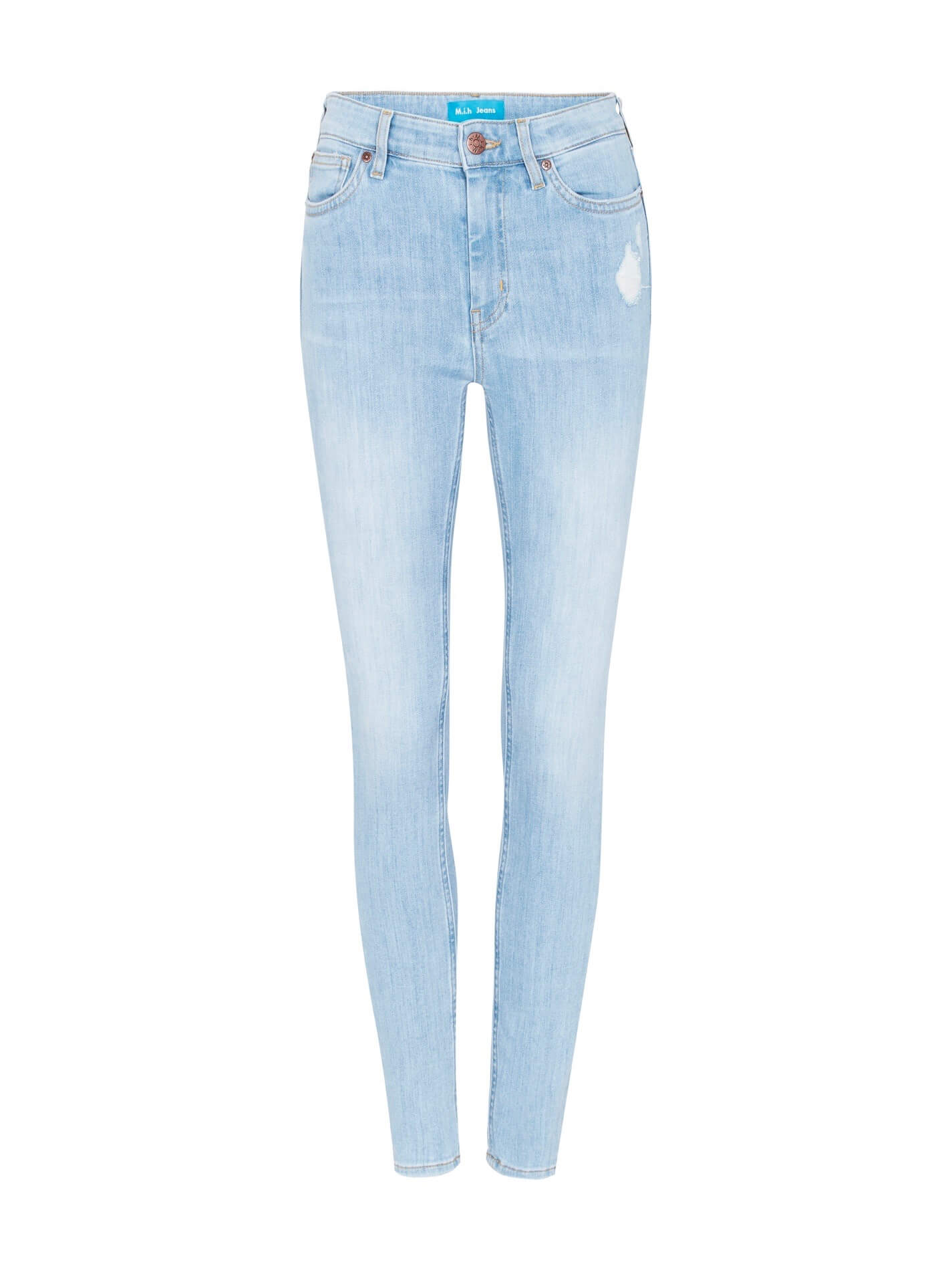 The M.i.h Bridge Jean in Jackie is the perfect skinny leg high rise jean coming in a classic sky blue. Constructed from a super comfortable, stretch cotton blend these jeans feature a single button zip fly closure, front and back pockets, bronze hardware and is finished with a small distressed patch at the left hip.