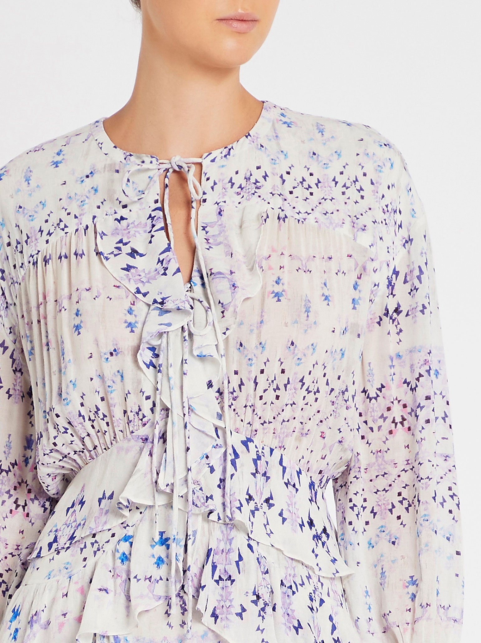 Indulge in the bohemian vibes with IRO's Persica Dress in Blue. This ethereal dress is the perfect combination of flowy and feminine, with its long, billowing sleeves and layered frill detailing, creating an effortlessly chic peasant-style look.