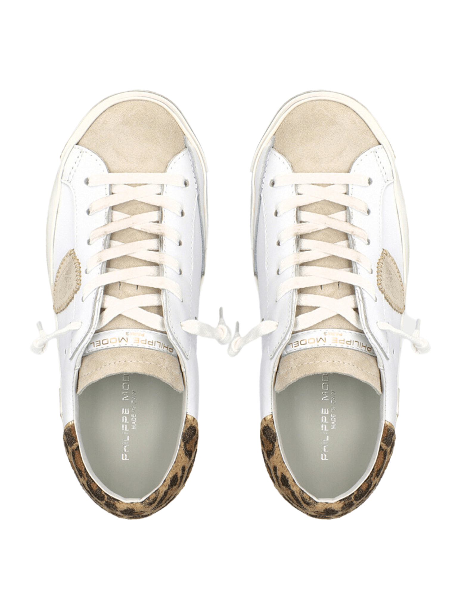 The Philippe Model PRSX Low Sneaker in Leo Blanc Brun (Leopard White Brown) is made from a Leather Upper, Leather Inner and Rubber Sole