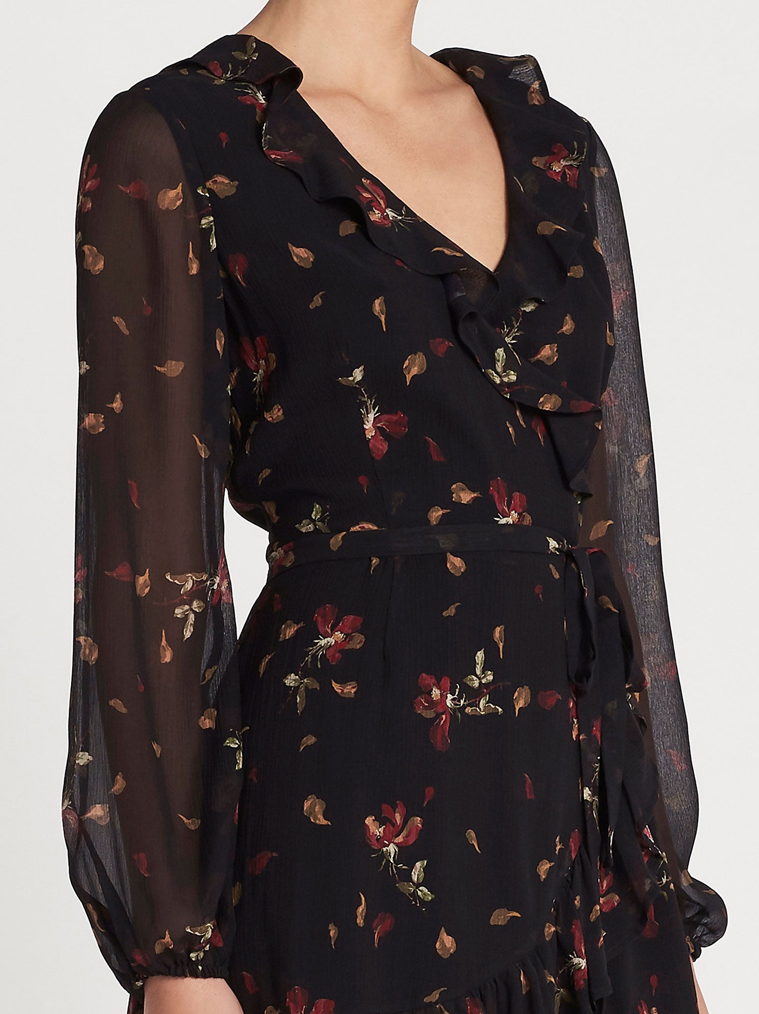 The Paige Shawna Dress in Black / Dark Rust Falling Floral is made from 100% Silk, Lining: 100% Rayon