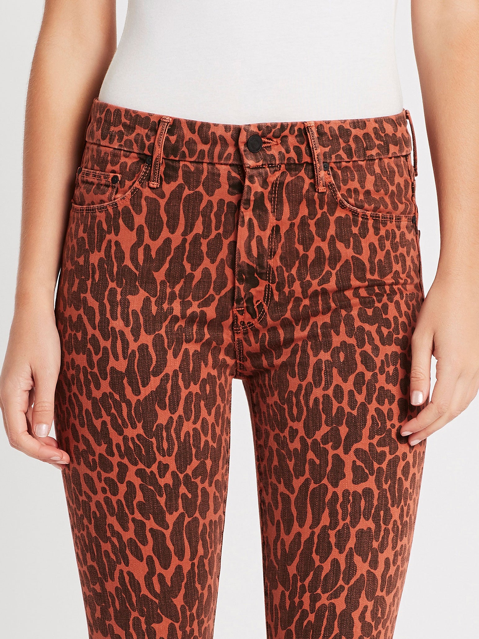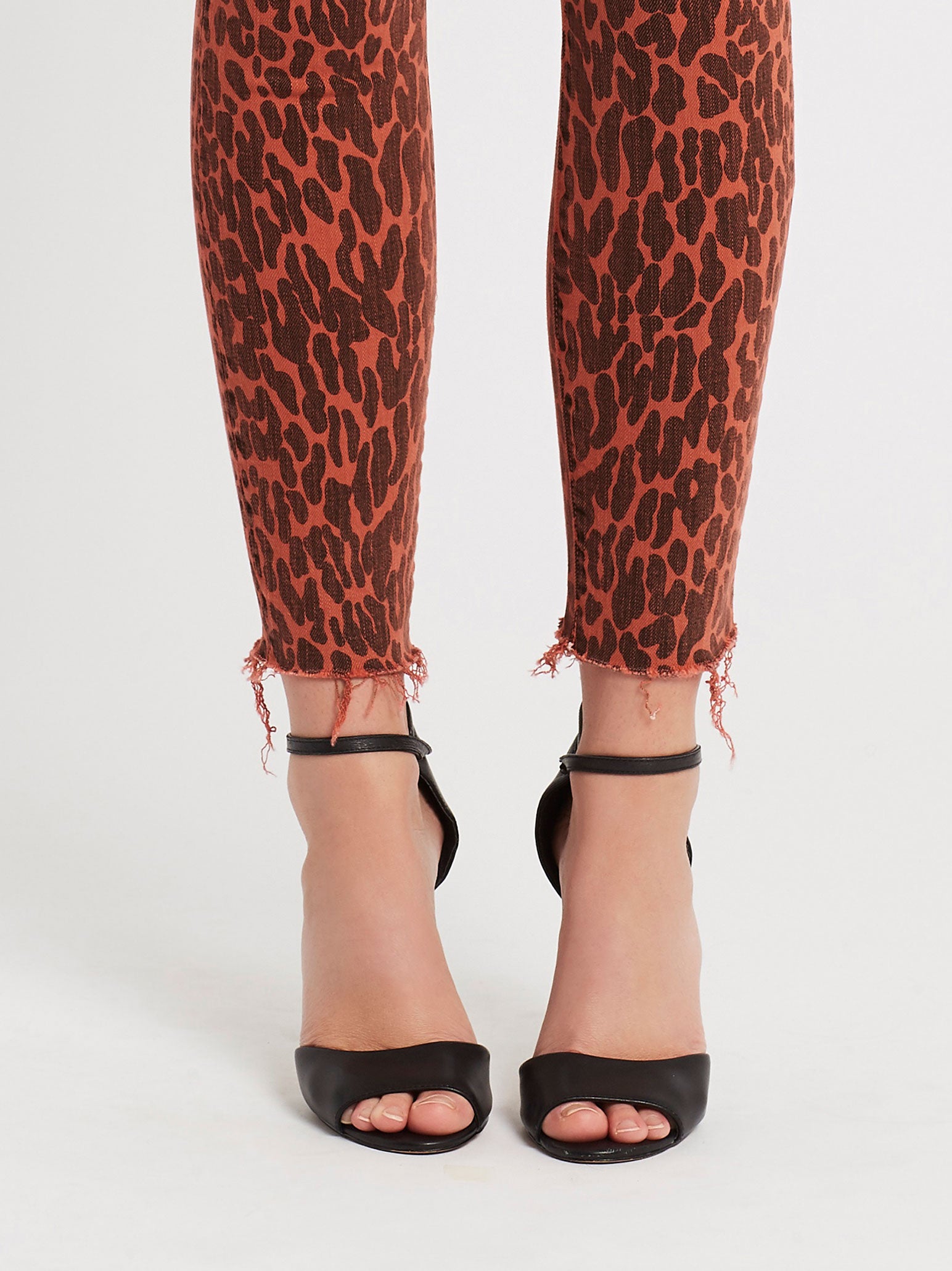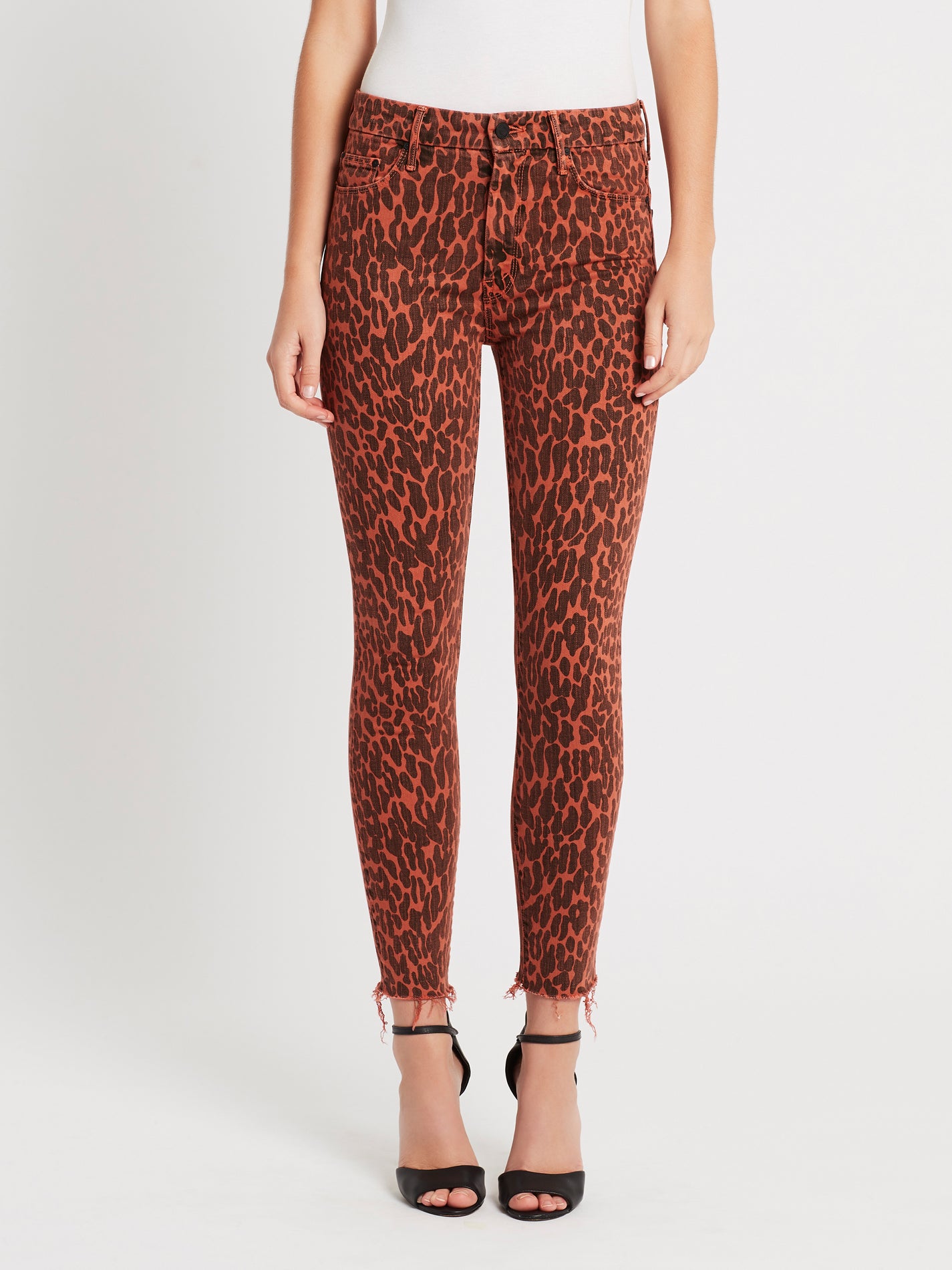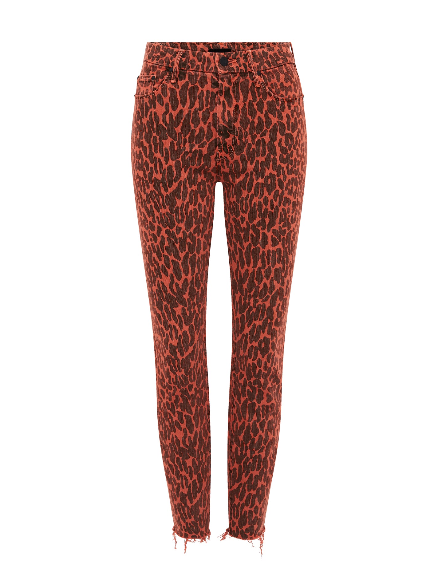 Bring out your wild "Can't be Tamed" side with Mother's High Waisted Looker Ankle Fray Jean in Animal Attraction. Contructed in an ultra smooth cotton blend these high rise red and spotted jeans feature single button zip fly closure, black metal hardware details with front and back pockets and are finished with a raw cut frayed hemline. Wear yours with your favourite band tee for an ultra rocker chic weekend look.