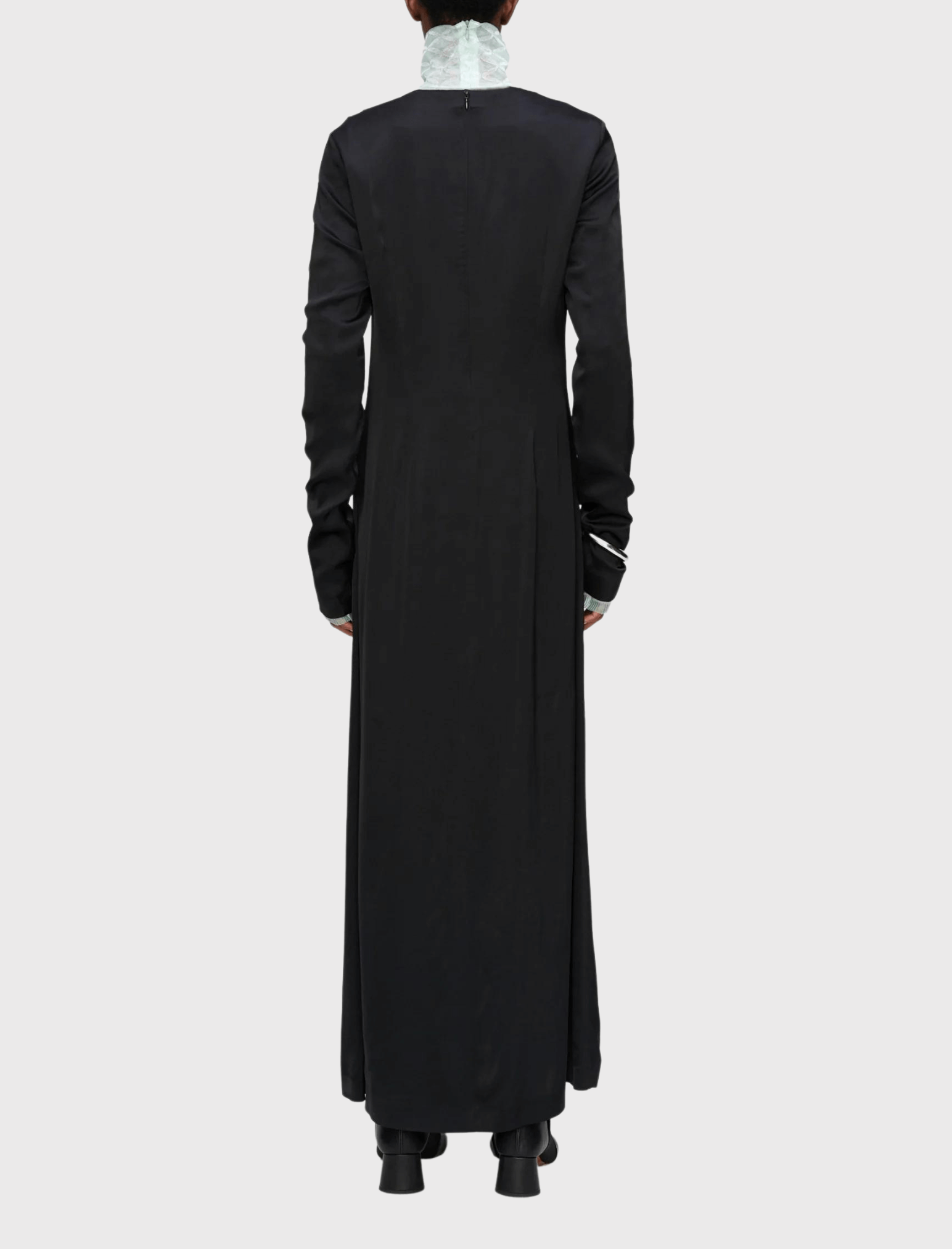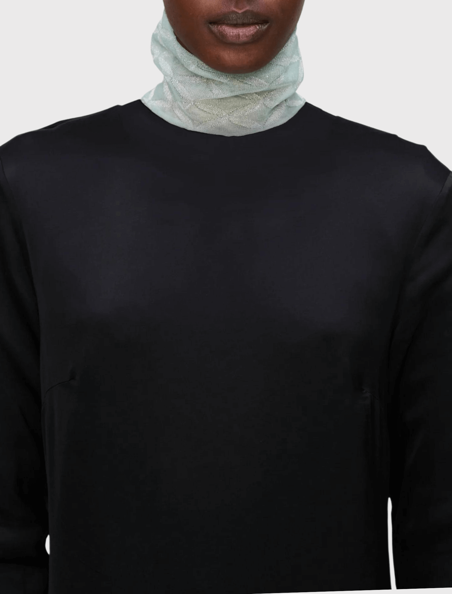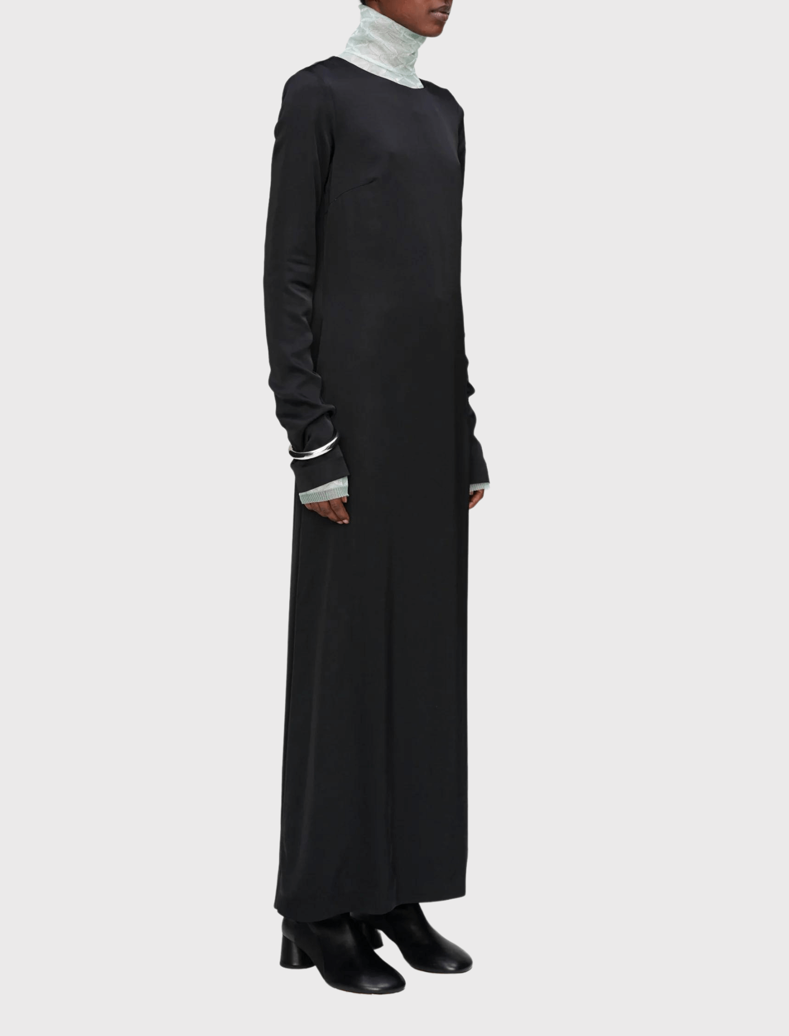 Stunning elegance is embodied by this classic satin cocktail dress. The Surya Dress in Noir from Amsterdam based fashion house Róhe is made from a sumptuous Italian stretch fabric. The striking shilouette is perfect for making a dramatic entrance at you next event, in these floor length long sleeved gown.