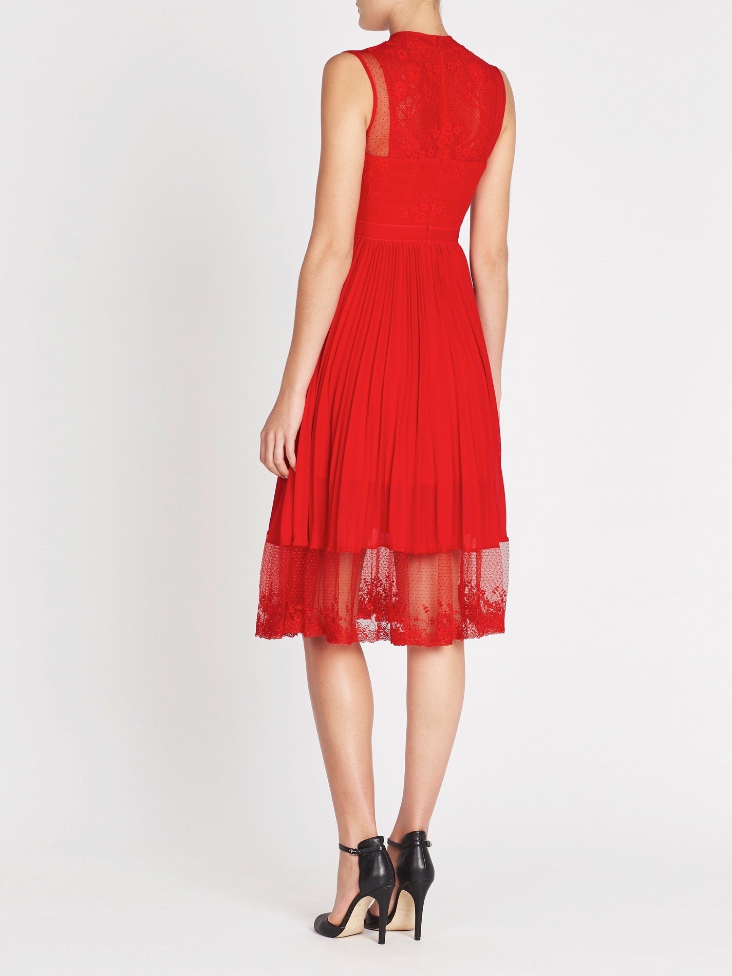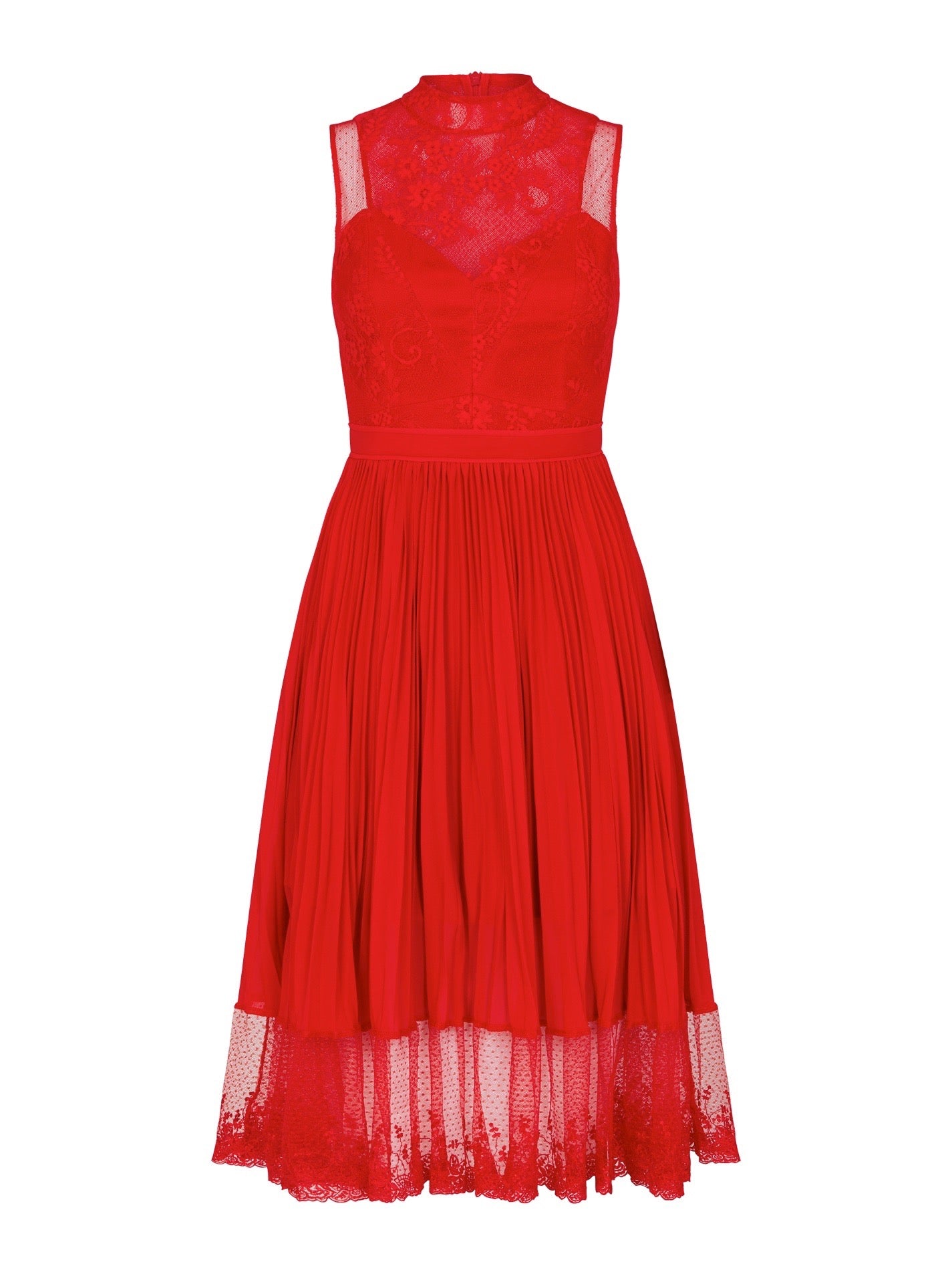 Knock them dead in the Three Floor Cherry Ripe Dress. This stunning red dress features a graphic inspired lace paneled bodice with a high neckline and sheer cut away shoulders details. The bodice transforms into a pleated A-line style skirt with a sheer lace hemline finish. Invisible back zip closure.