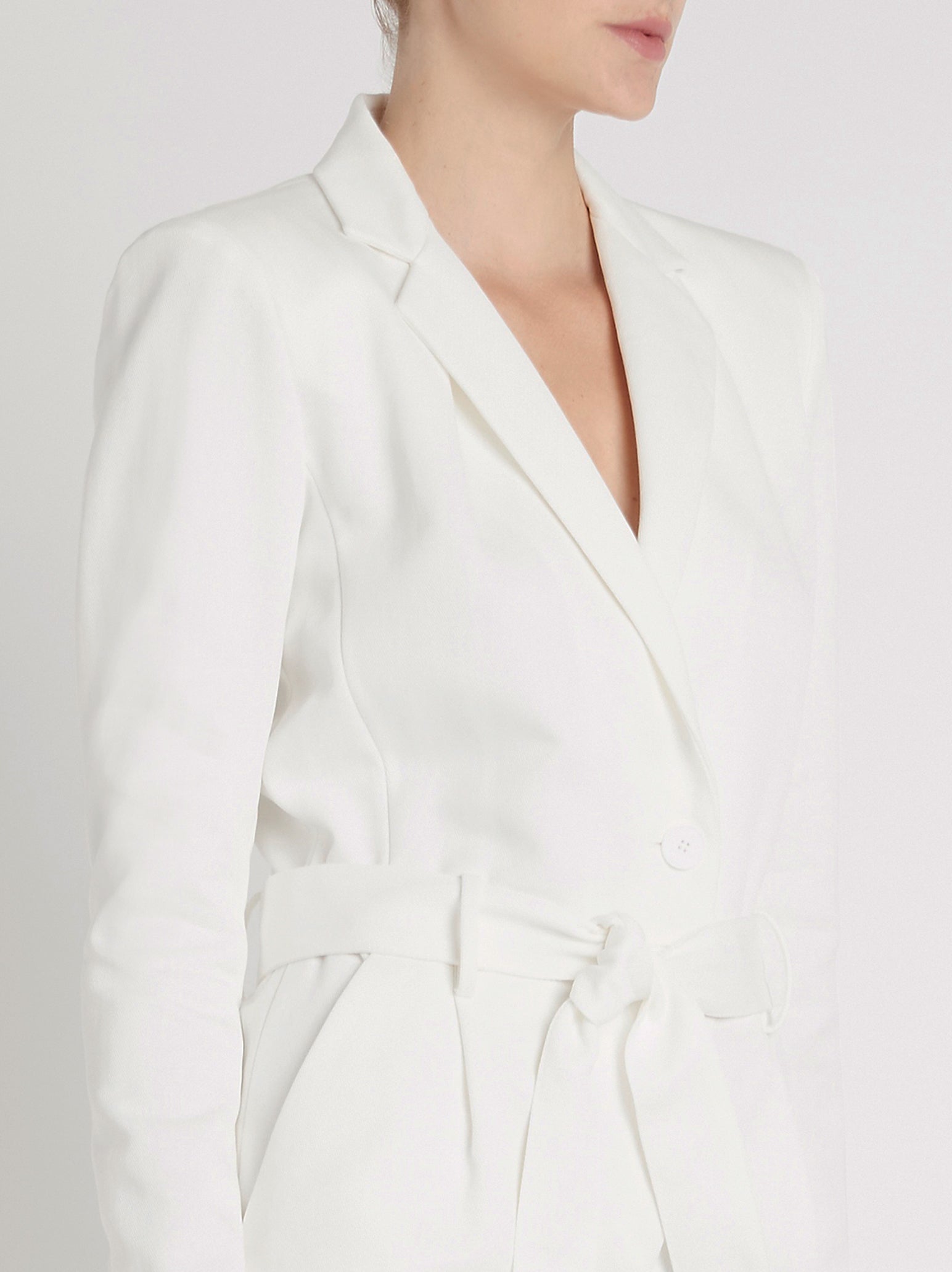 The much loved classic white blazer gets a modern update with the IRO Hana Playsuit in Ecru. Constructed from a cotton and linen blend this playsuit features a classic lapel collar, V neckline, front button closure and self tie waist. Team with a simple white heel and gold accessories for perfect elevated style.