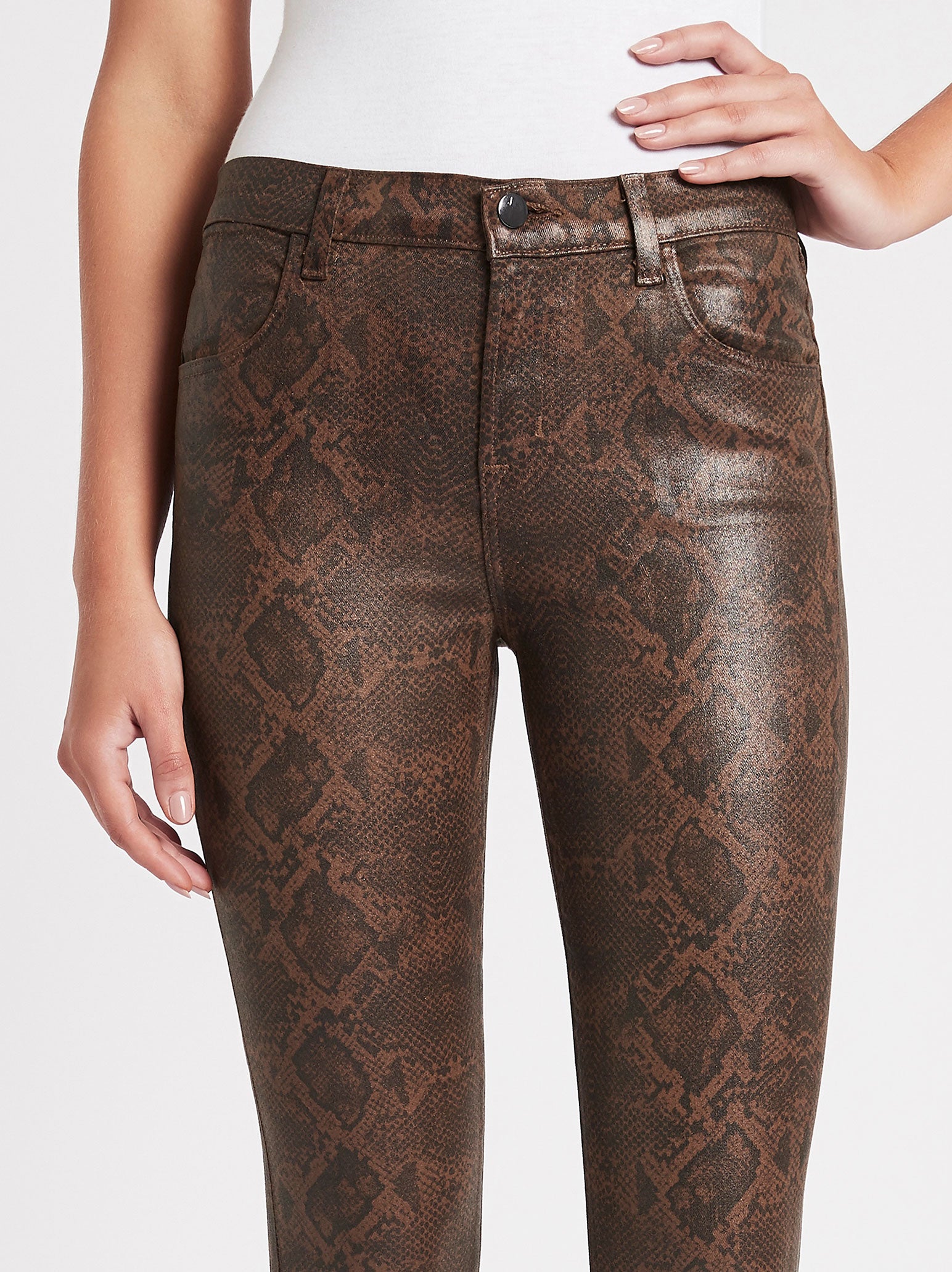 Take a walk on the wild side in the J Brand Alana High Rise Crop Skinny Jean in Dark Eclair Coated. The much loved Alana Jean features a high rise, single button zip fly closure, front and back pockets and a cropped hem. This snake print coated style is an easy way to elevate a simple black tee and is perfect paired with a black leather boot.