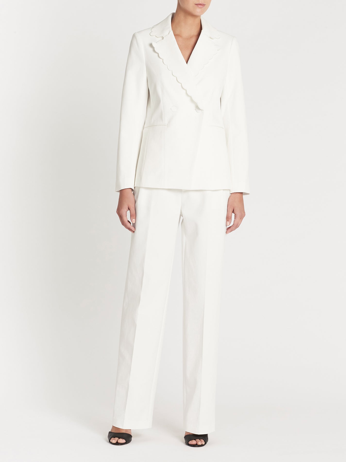 A modern and feminine blazer, Frame's Scallop Jacket in Off White is a tailored sleek style with a scalloped collar. Pair with the Frame Denim Scallop Soft Trouser in Off White to complete the suit