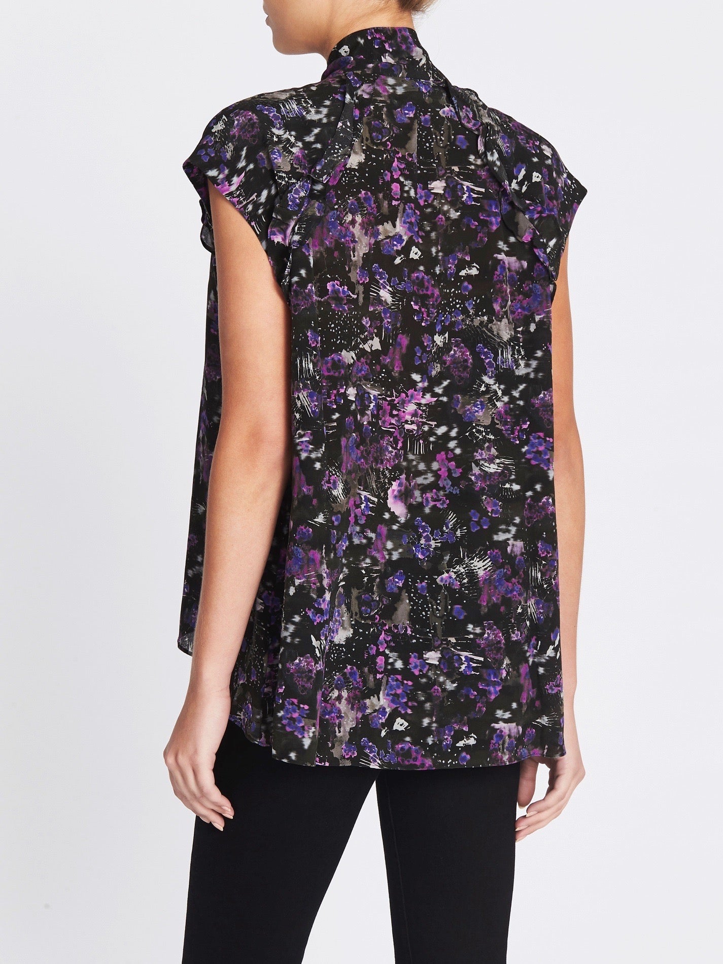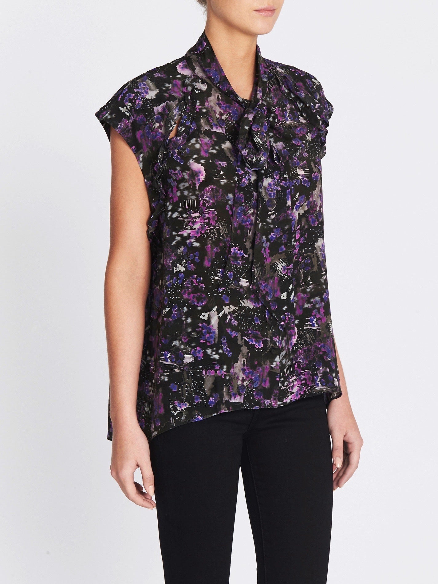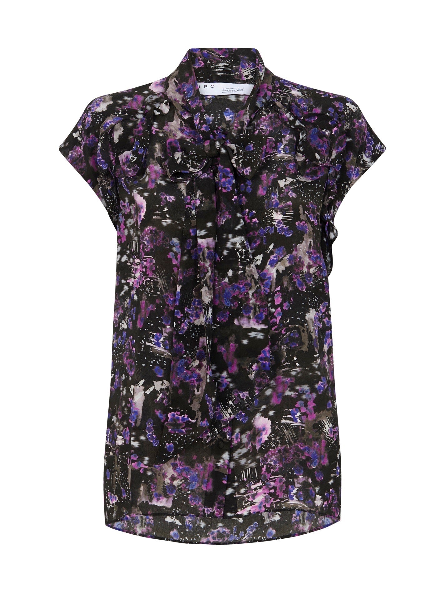 Add some florals to your wardrobe with the IRO Equal Top. Constructed from an ultra soft silk, this purple floral printed blouse features short cap sleeves, raglan seams at the shoulder with subtle opening and ruffle detailing, a tie neckline and is finished with a curved hemline.