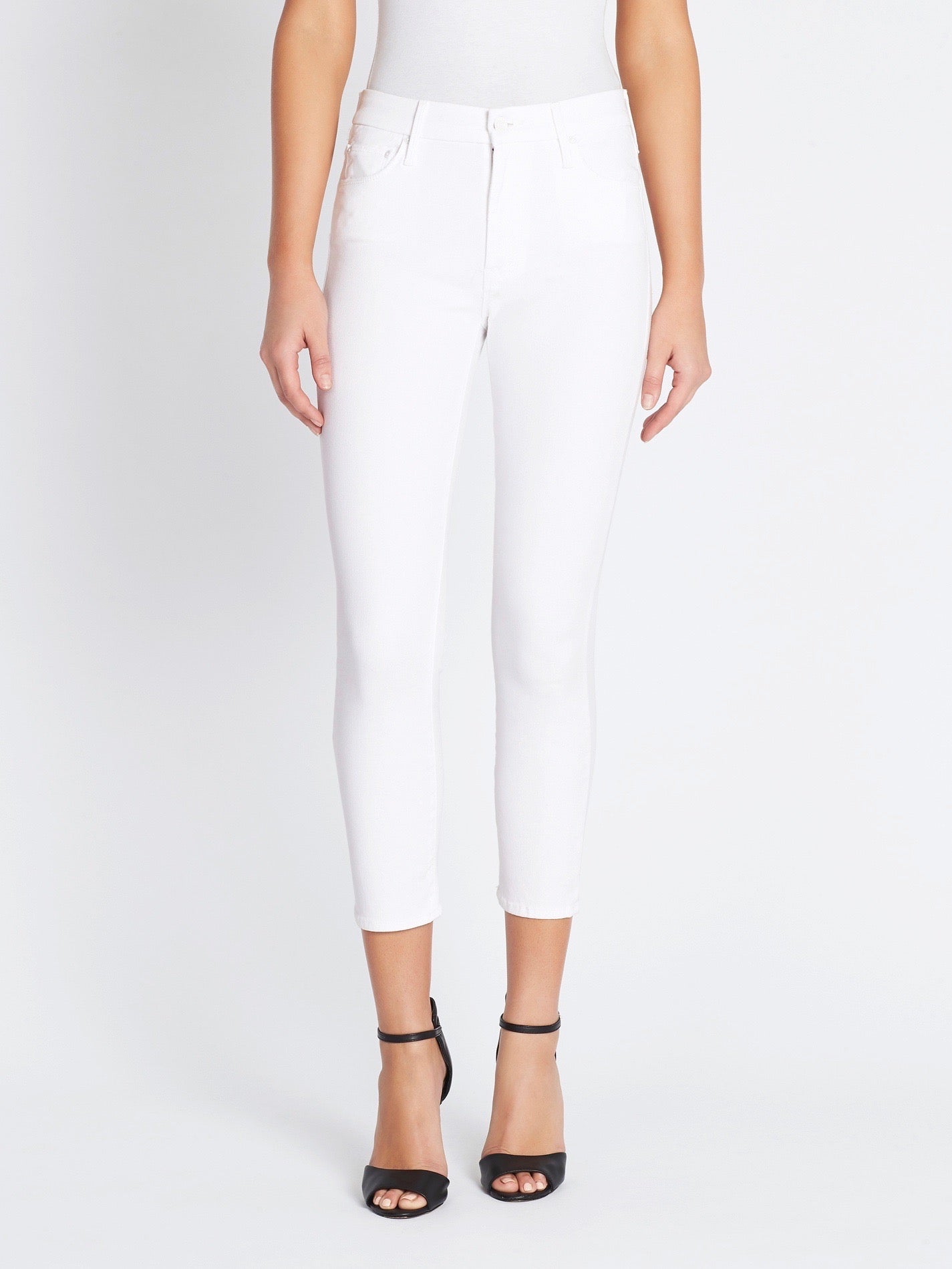 The Mother Denim Looker Crop Jean in Glass Slipper are the perfect figure hugging white skinny leg jeans. Constructed from a stretch cotton these mid-rise jeans feature front and back pockets, white hardware and a cropped finish. The feather-light cotton blend offers superior comfort and stretch, so you can move freely throughout your day in these stylish jeans.