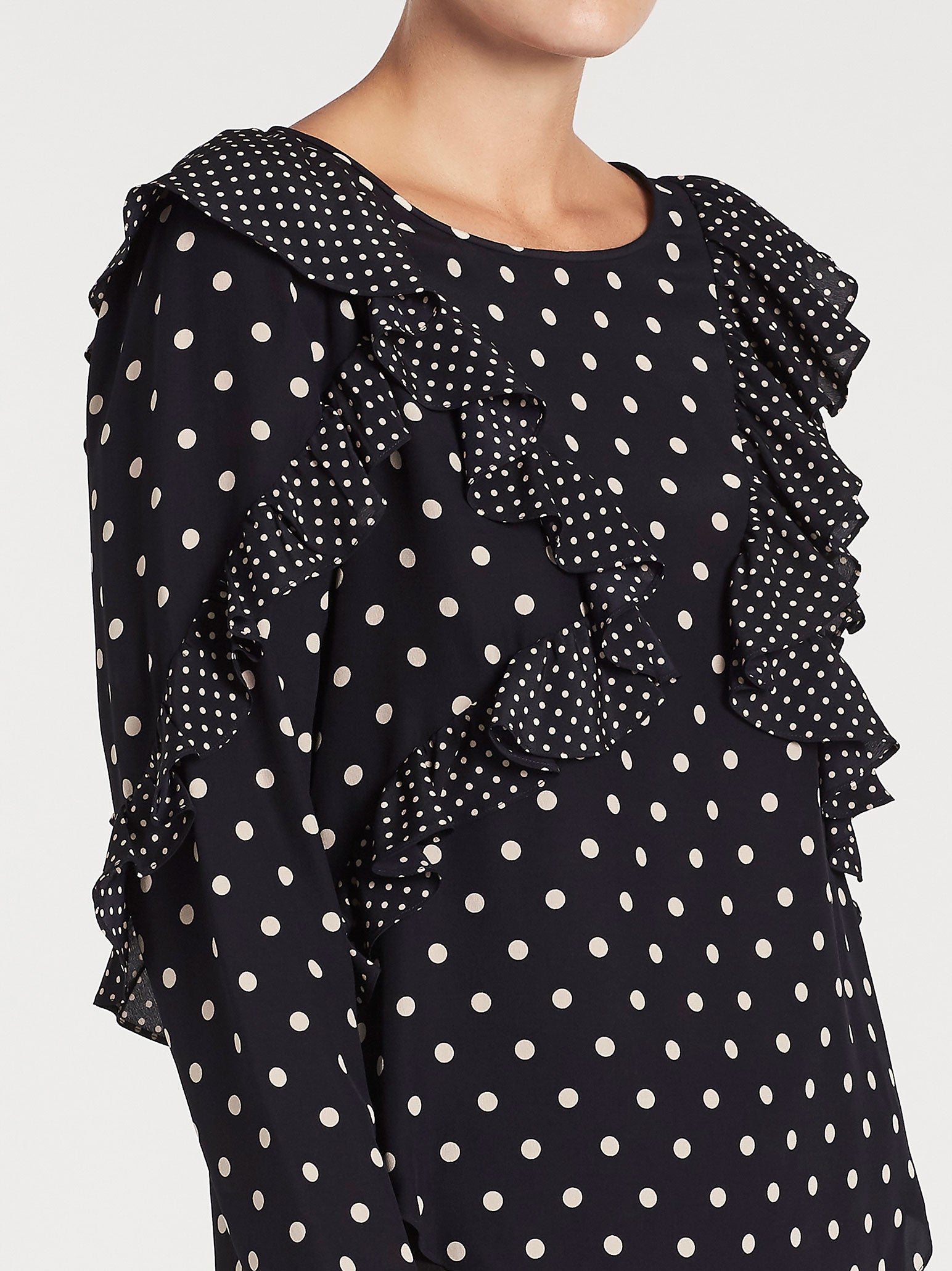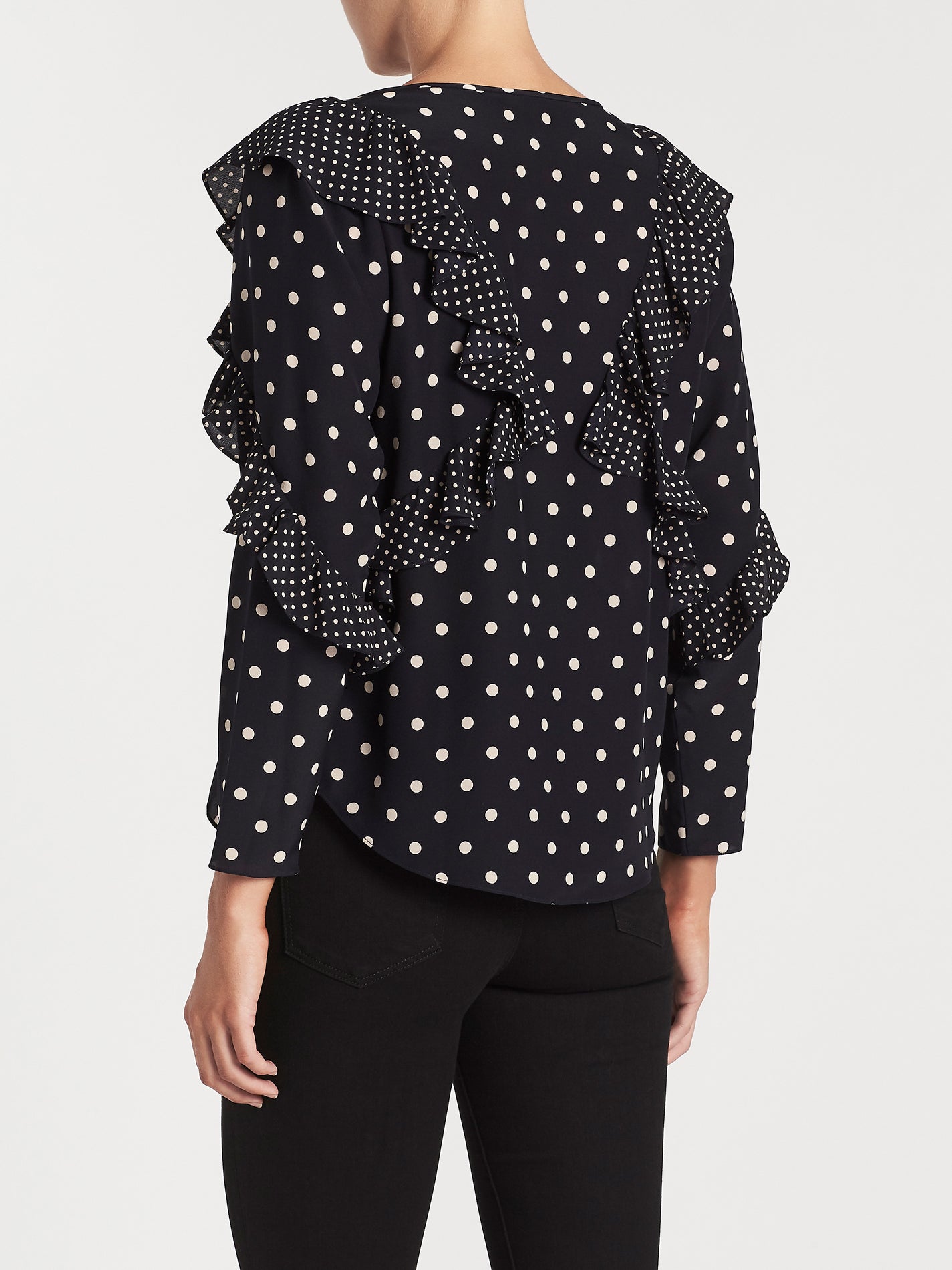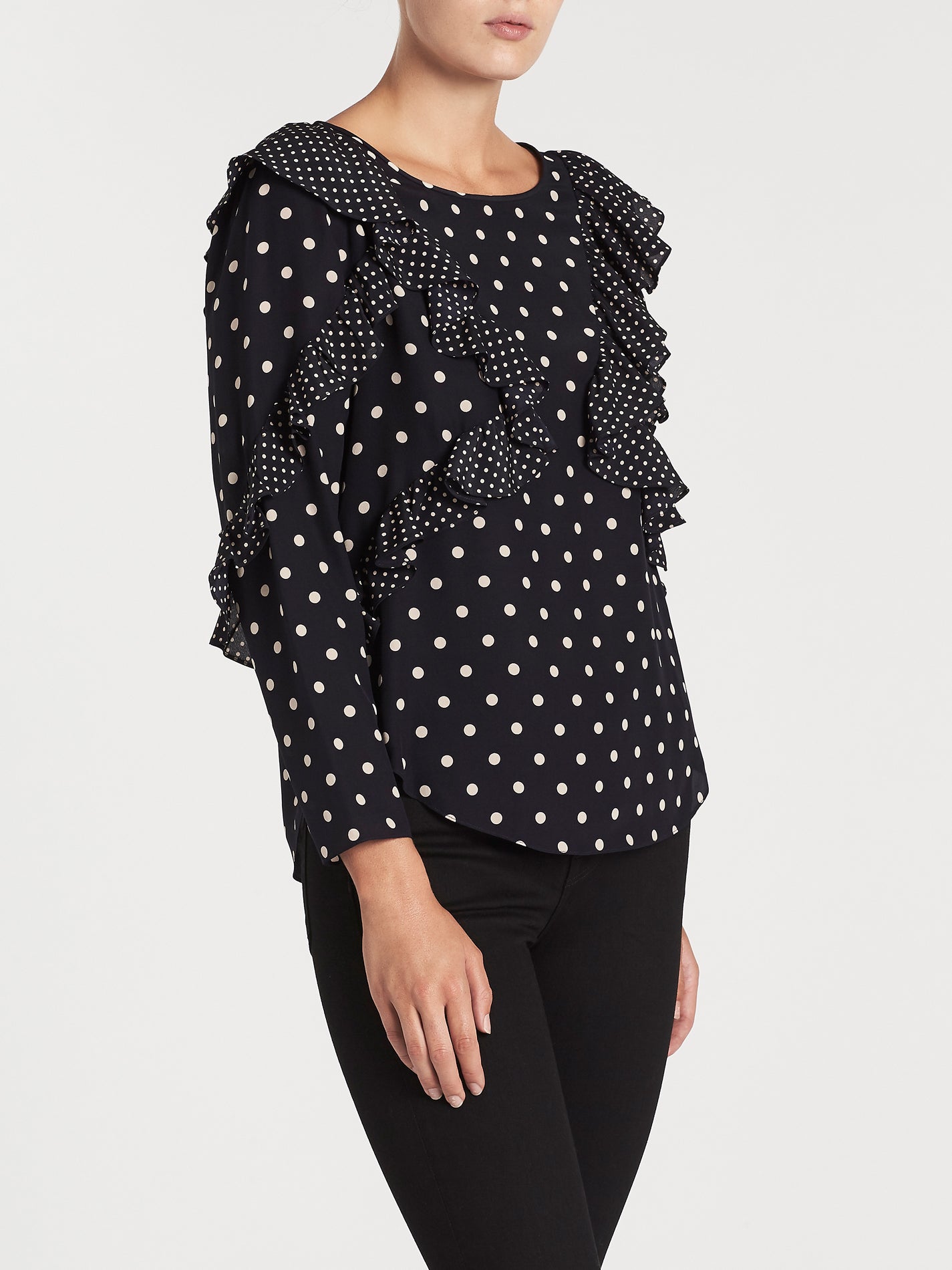 The Rebecca Taylor Long Sleeve Dot Ruffle Top in Navy is made from 100% Silk
