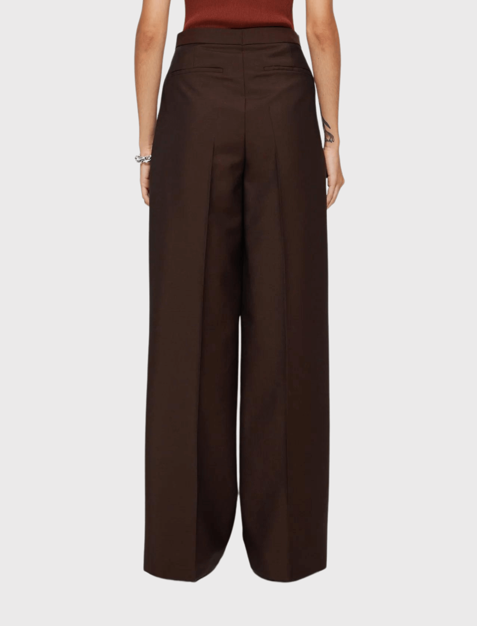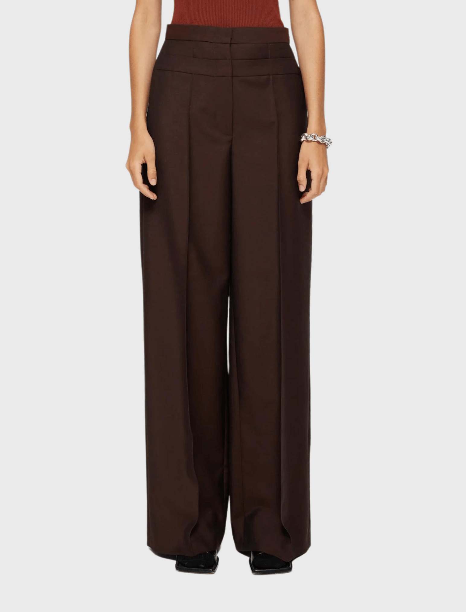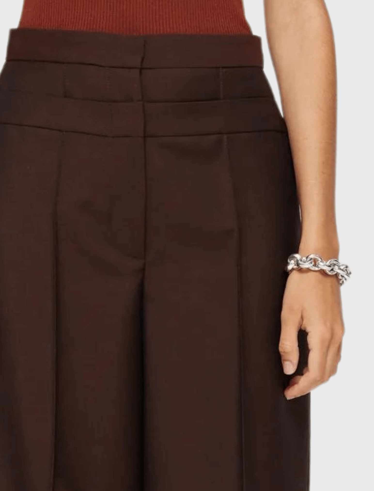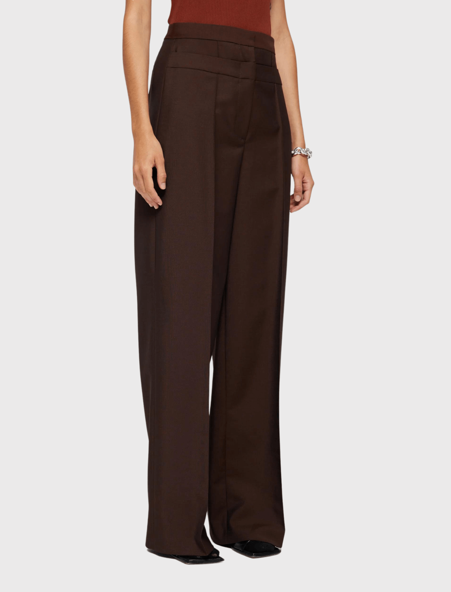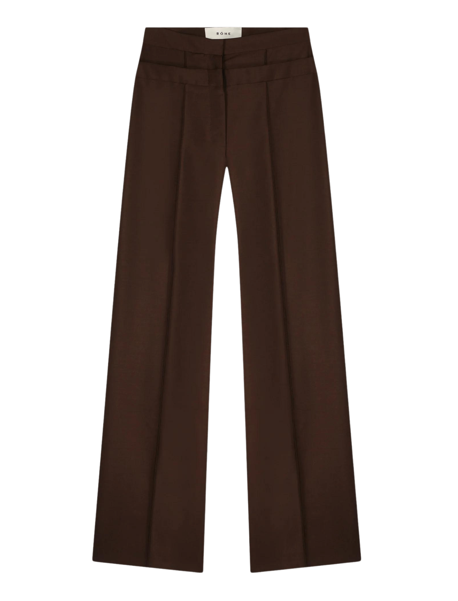 The Róhe Stevie Double Waistband Trouser in Chestnut is made from 73% Traceable Virgin Wool and 27% Wool Mohair.