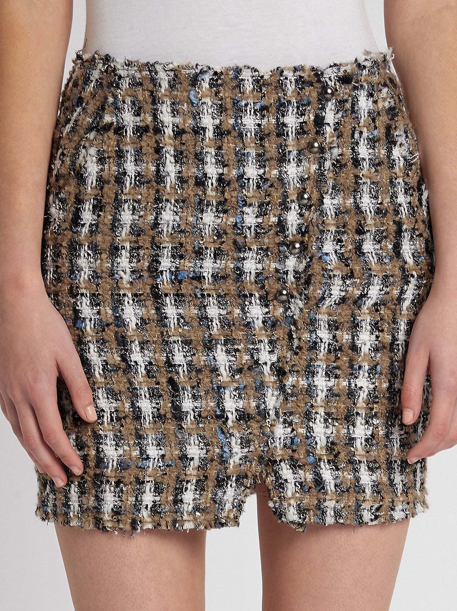 IRO deliver you a bold wardrobe statment with the Hunch Skirt in Beige Multi. This plaid tweed mini skirt features metallic embelishments with asymmetric detail and two pockets putting a fun spin on a must have classic. Team with a simple tee and ankle booties for an easy everyday look.