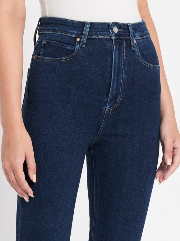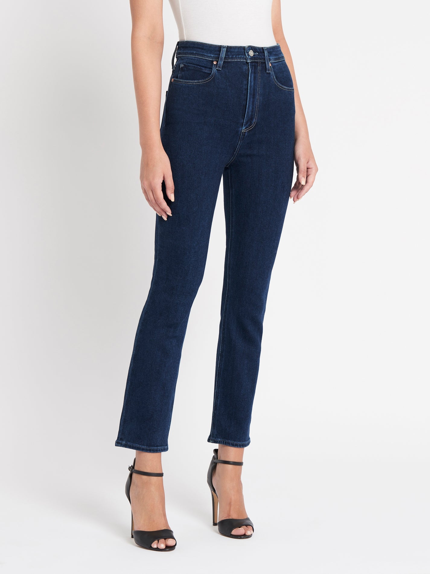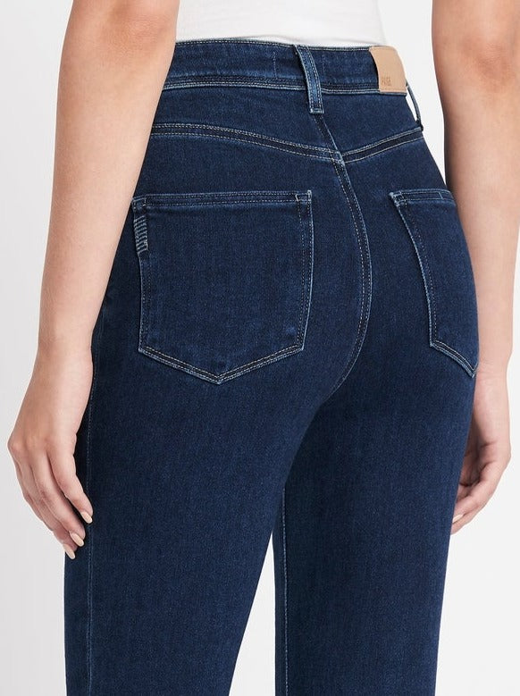 Nail the retro chic look with the Paige Ultra High Cindy Rise Jean in the dark blue wash California. Constructed from the much loved Transcend vintage, cotton blend fabric these jeans have a super soft feel and stretch throughout for added comfort. With a high rise a single button zip fly closure these denim jeans are an absolute wardrobe classic.