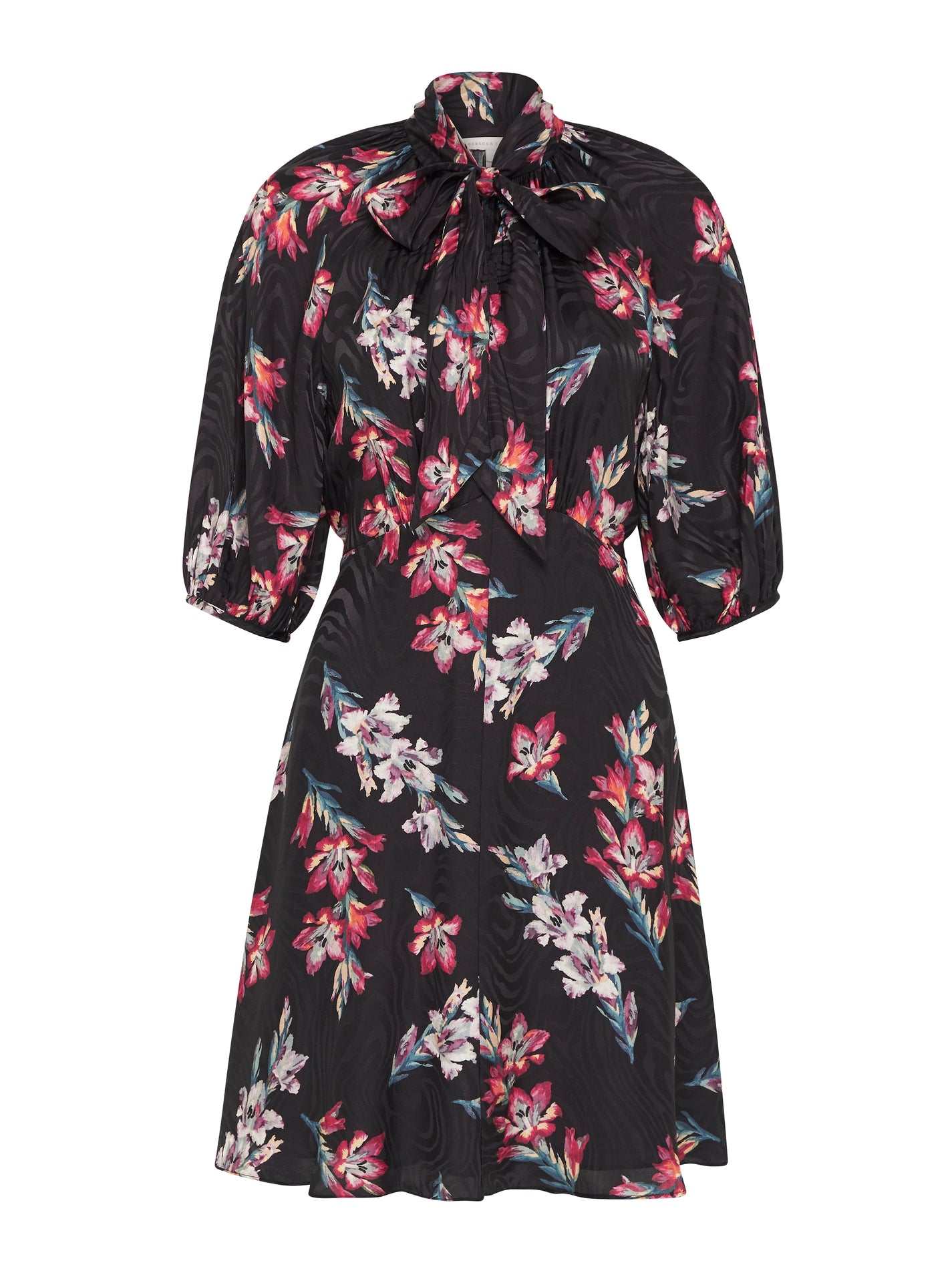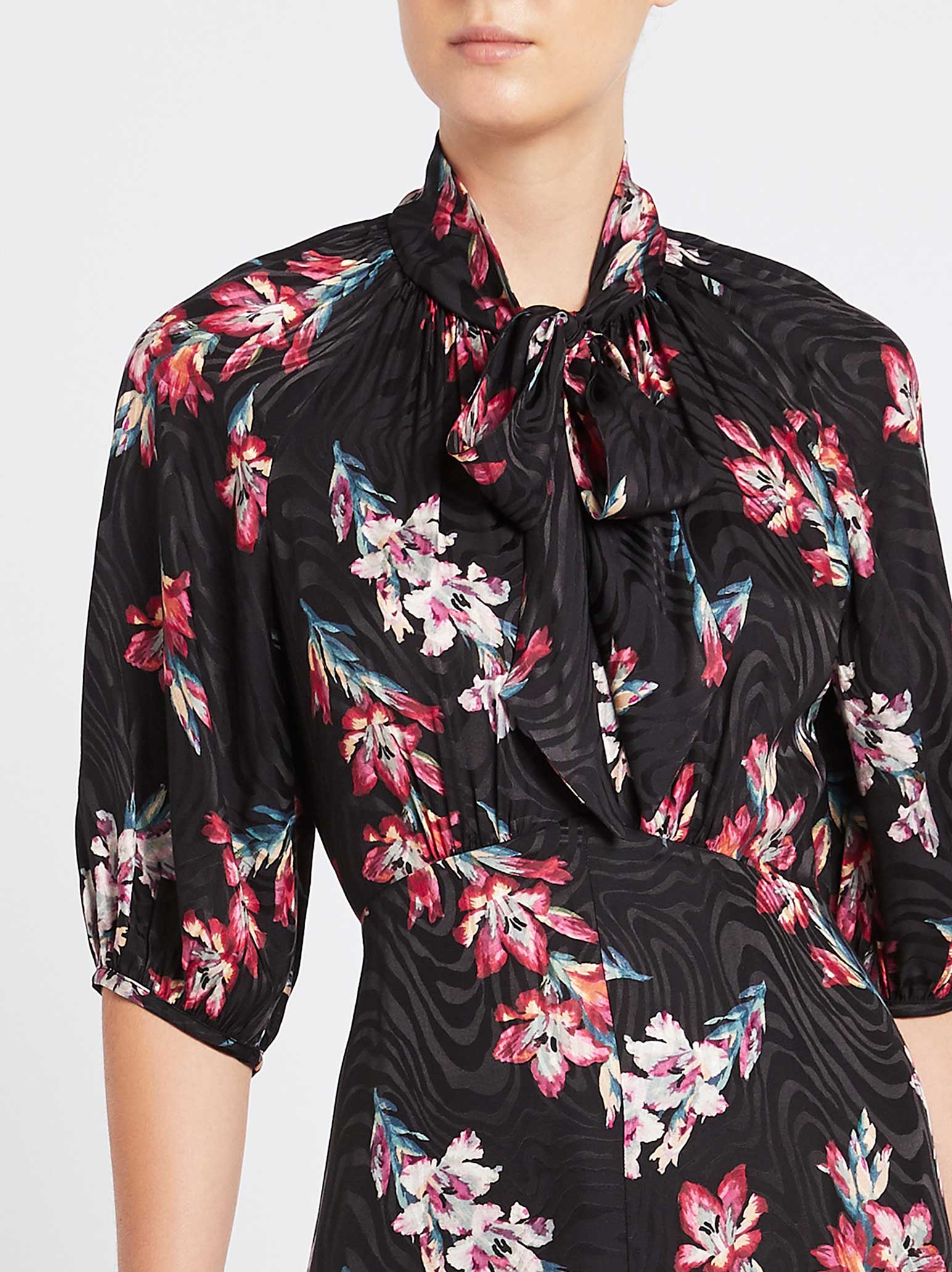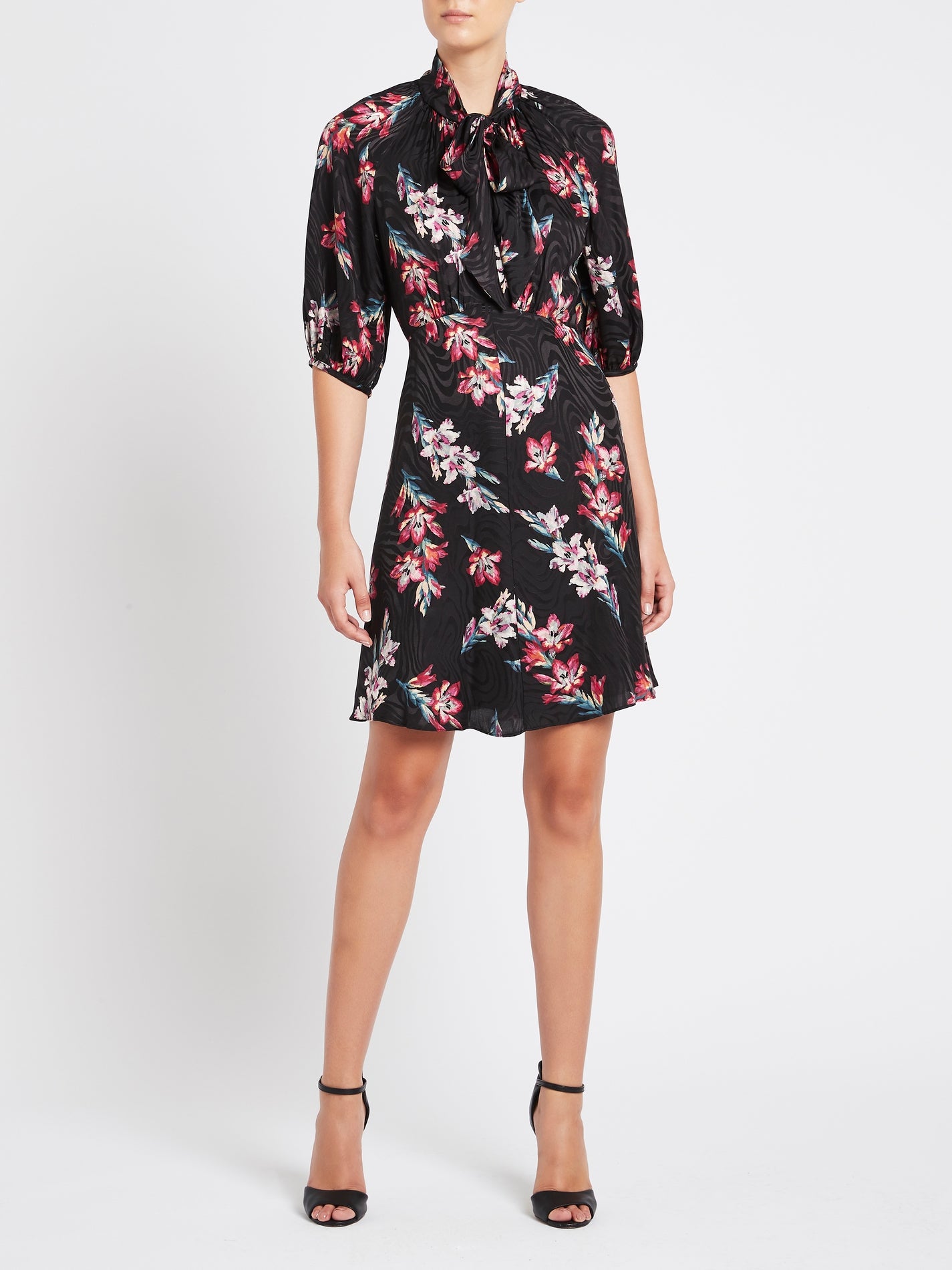 Who doesn't love receiving flowers? The Rebecca Taylor Noha Silk Dress in Black Combo is your daily delivery of fresh blooms, with a swirl jacquard fabrication and balloon sleeves, the Noha Silk Dress features a bow-tied neckline, and the all over Noha Floral print. Feel fresh and floral when you step out in this stunning silk number.