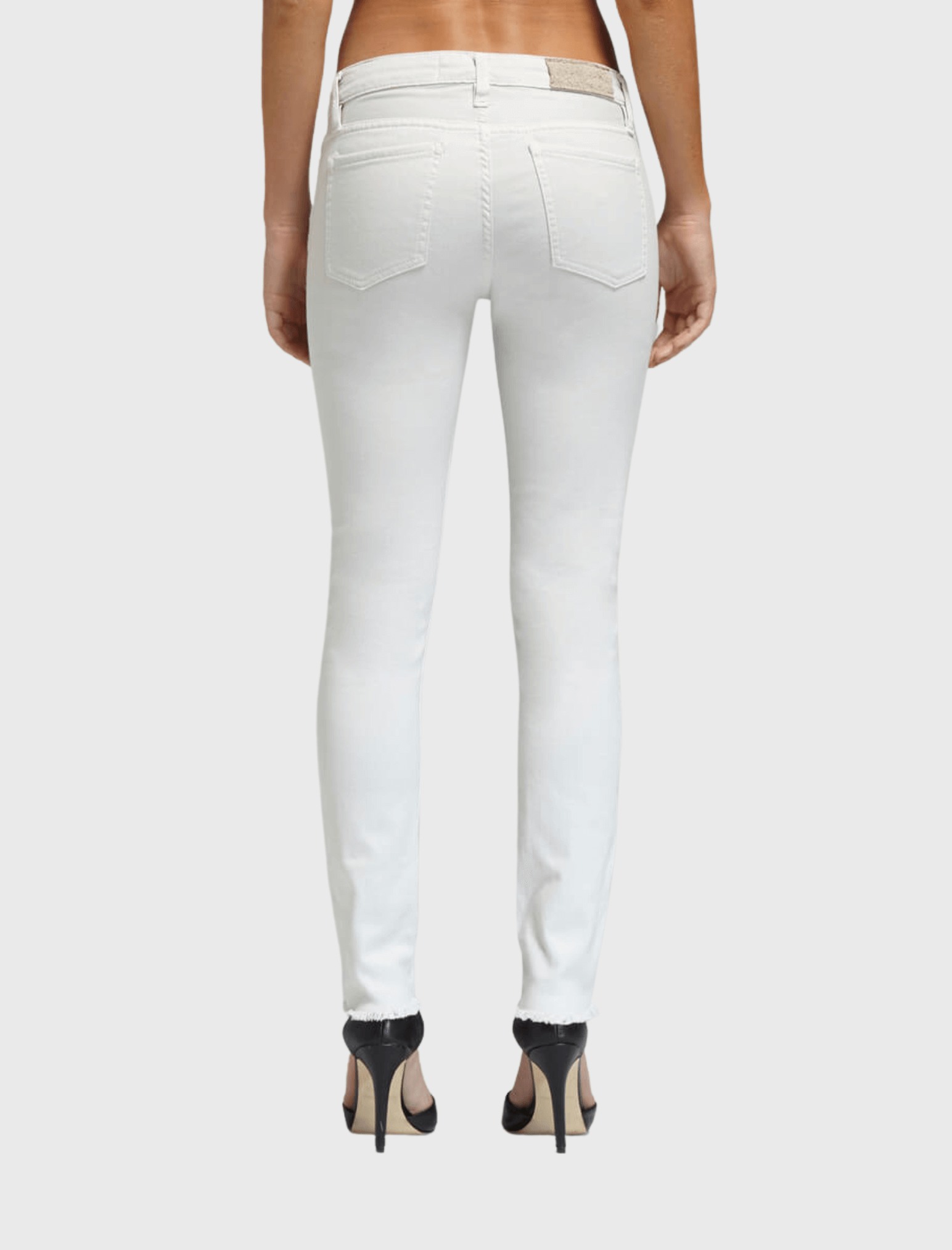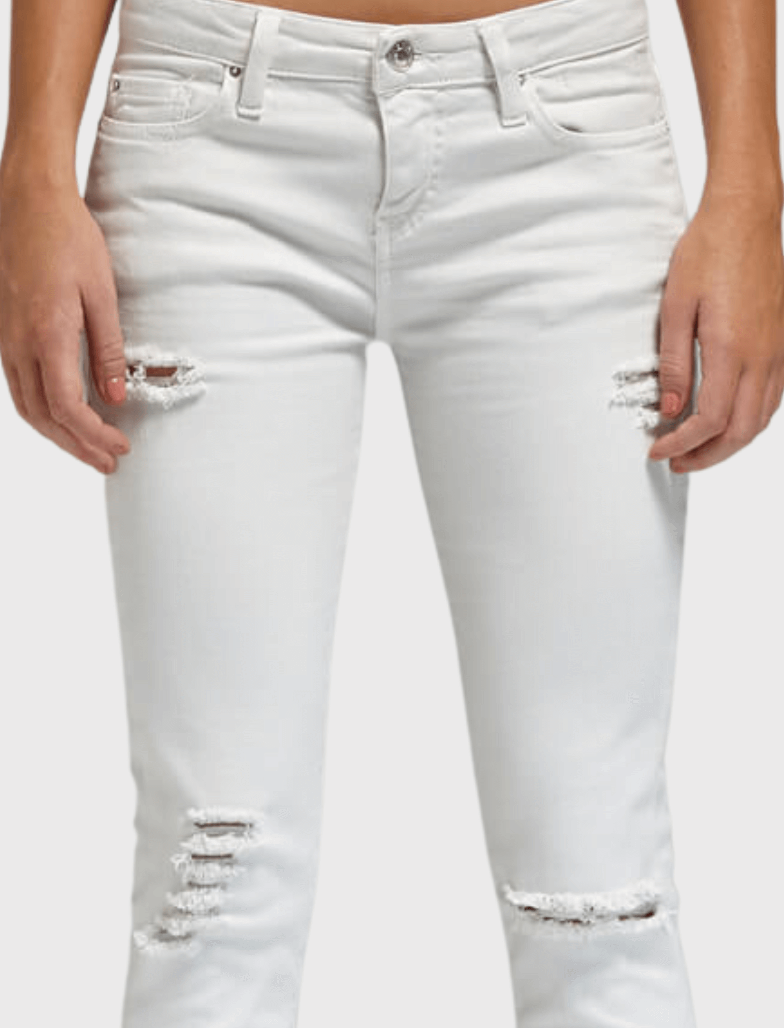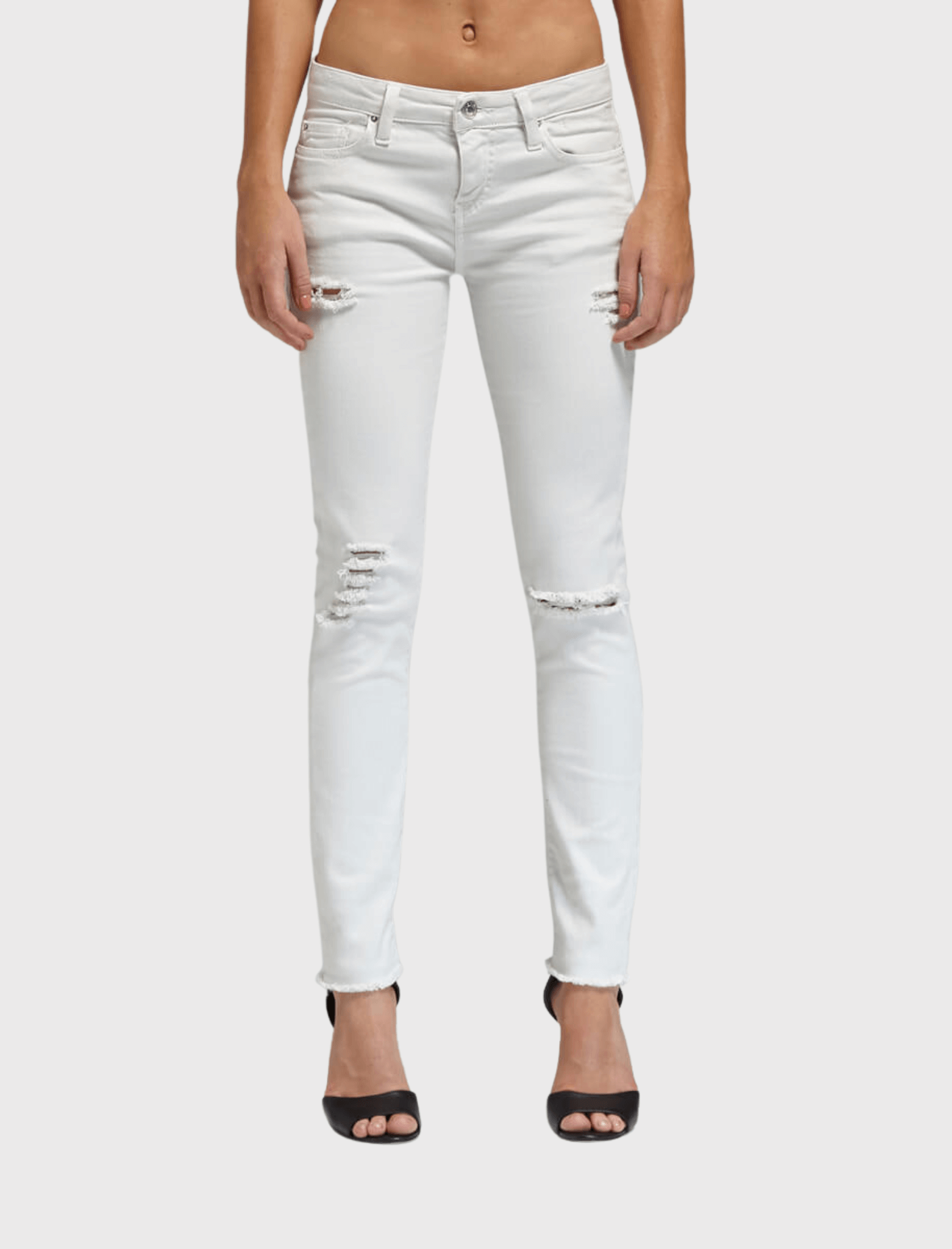 Shining with silver hardware, the Jarod Adjuste Distressed Jeans from premium denim brand IRO Jeans are a skinny legged jean. Shown here in the colour Chalk, these jeans have a low rise of 8 inches, are detailed by raw edged, cropped hems and are distressed along the thighs and knees.