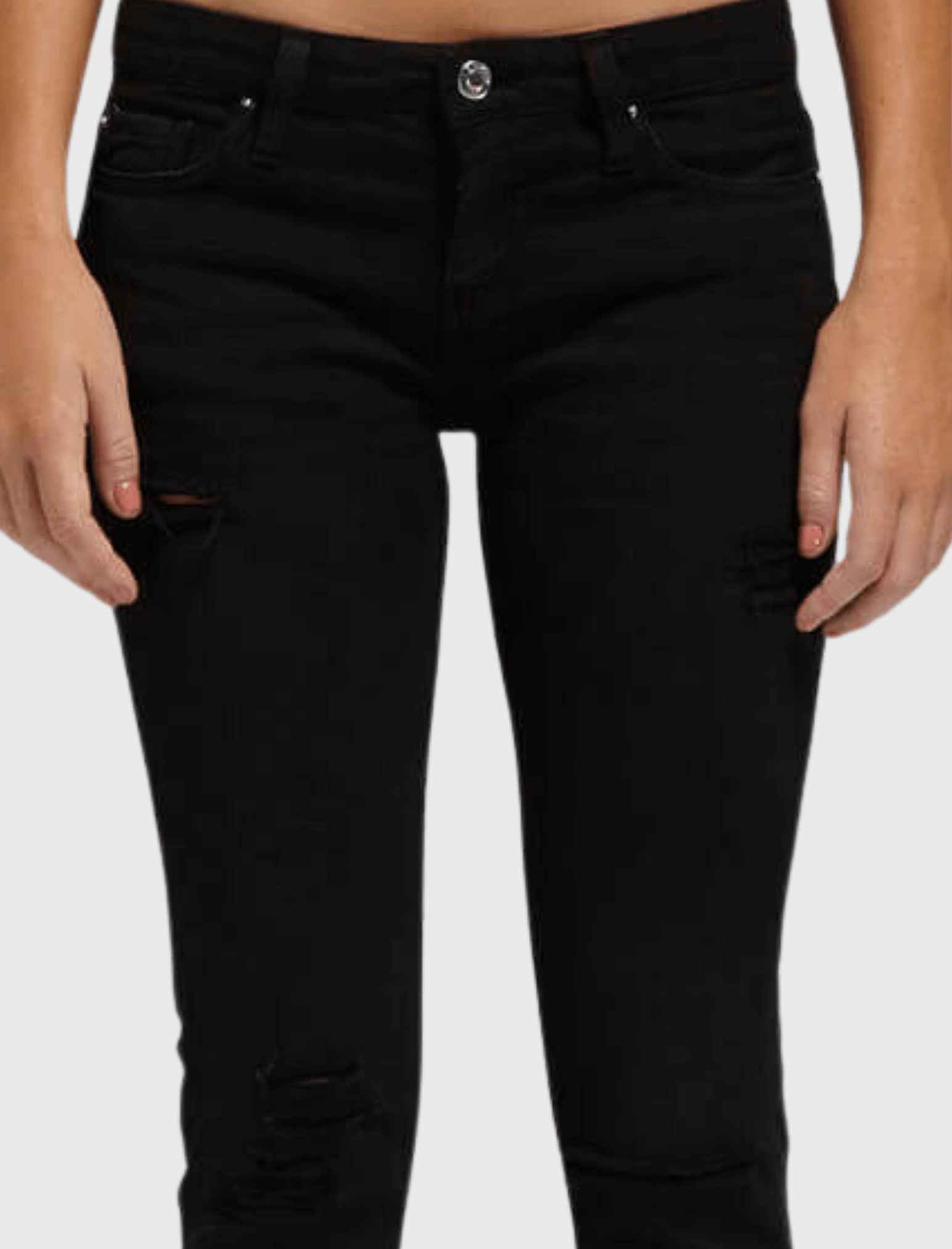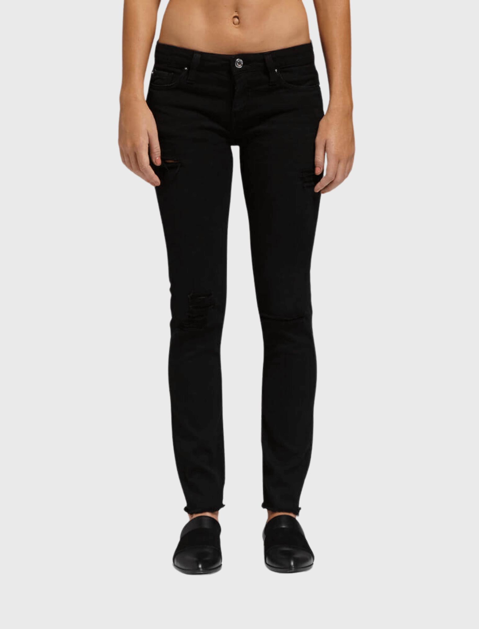 Shining with silver hardware, the Jarod Adjuste Jeans from premium denim brand IRO Jeans are a skinny legged jean. Here in Black Denim, these jeans have a low rise of 8 inches, are detailed by raw edged, cropped hems and are distressed along the thighs and knees.