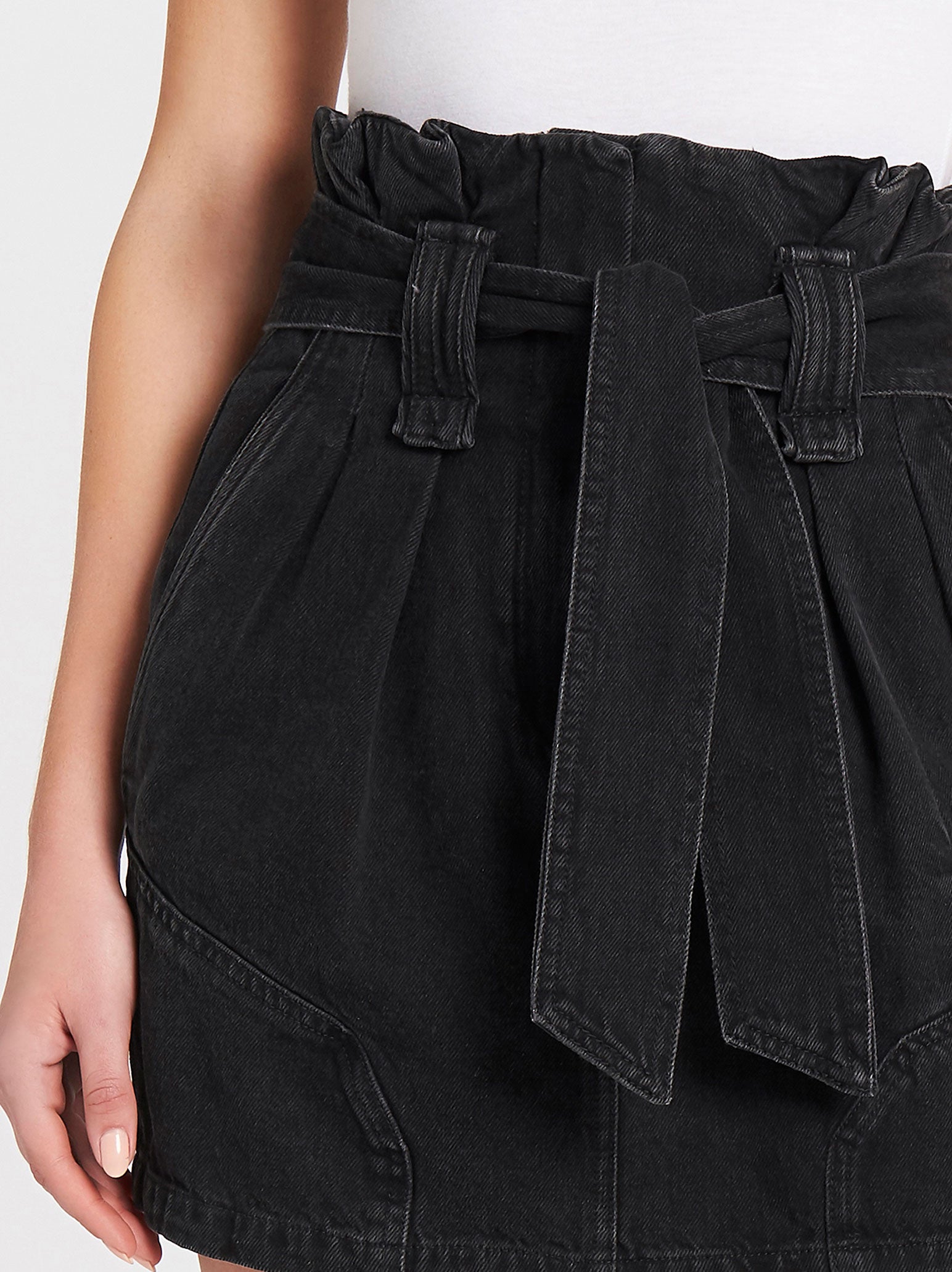 The Hovy Skirt by IRO in Black Denim is an easy addition to your warm weather wardrobe. Constructed from a structured cotton this mini skirt features a gathered waistband with a tie belt and side pockets.