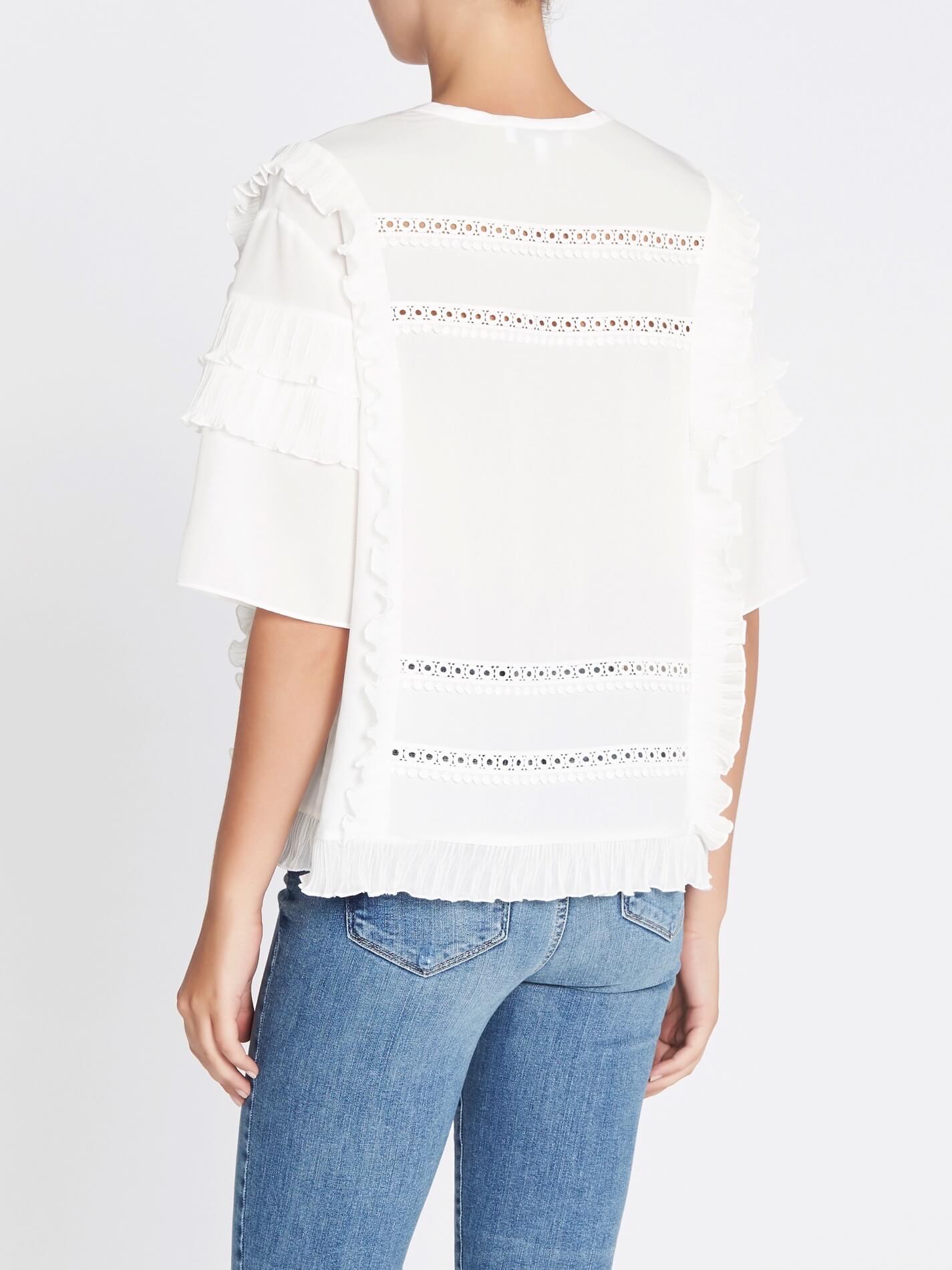 The classic white blouse gets a romantic touch with the IRO Cauland Top in Ecru. Constructed from a lightweight fabric this piece has a v neckline, wide 2/4 length flounce sleeves and ruffle details at the sleeves, chest and hem. Wear yours tucked into a black mini skirt with strappy heels for the perfect date night look.