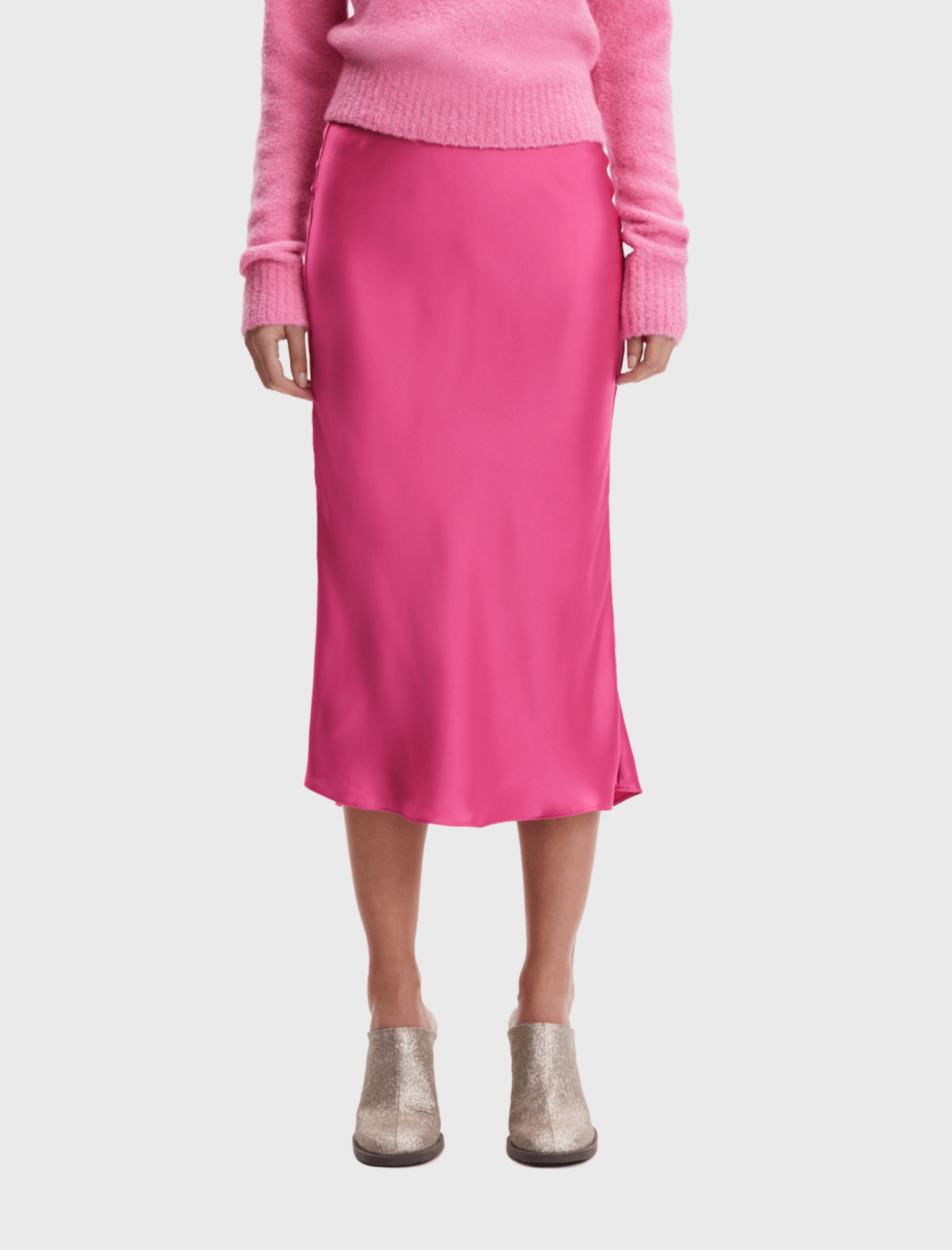 The Samsoe Samsoe Agneta Satin Midi Skirt in Fandango Pink fit true to size