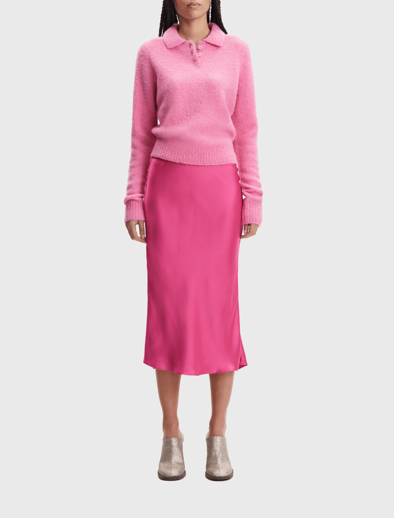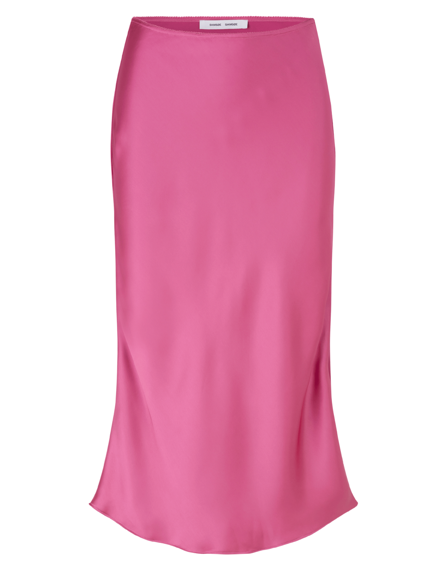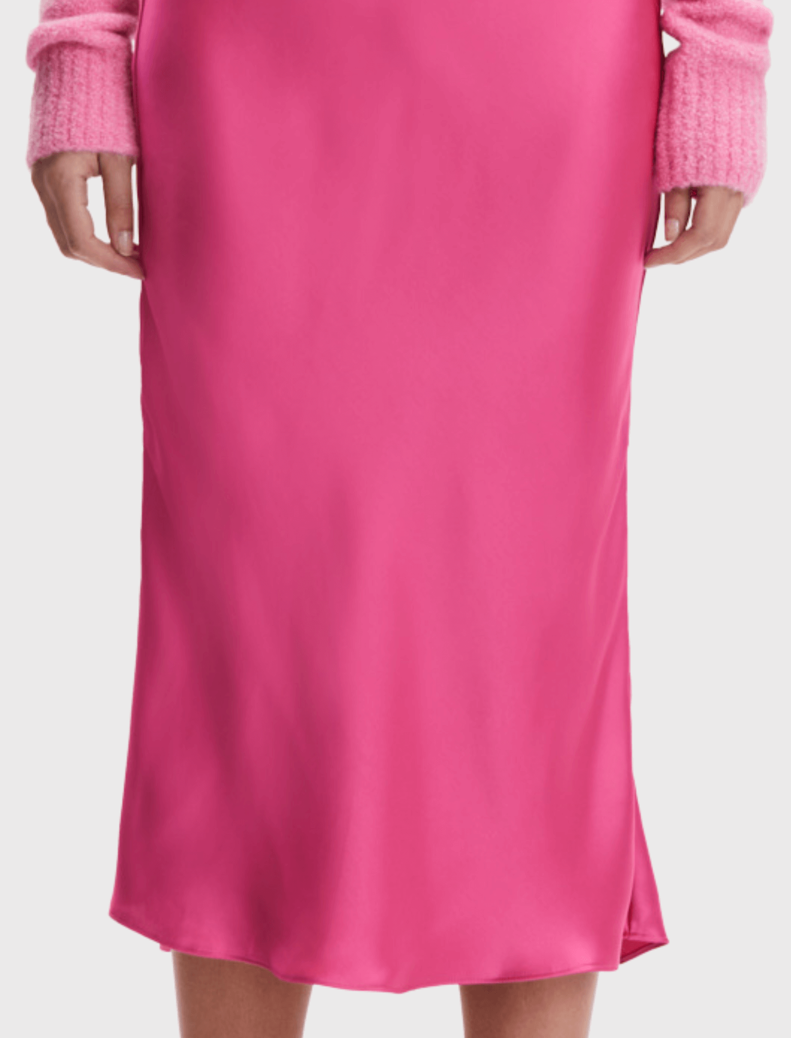 The Samsoe Samsoe Agneta Satin Midi Skirt in Fandango Pink is made from 58% Recycled Polyester & 42% Polyester