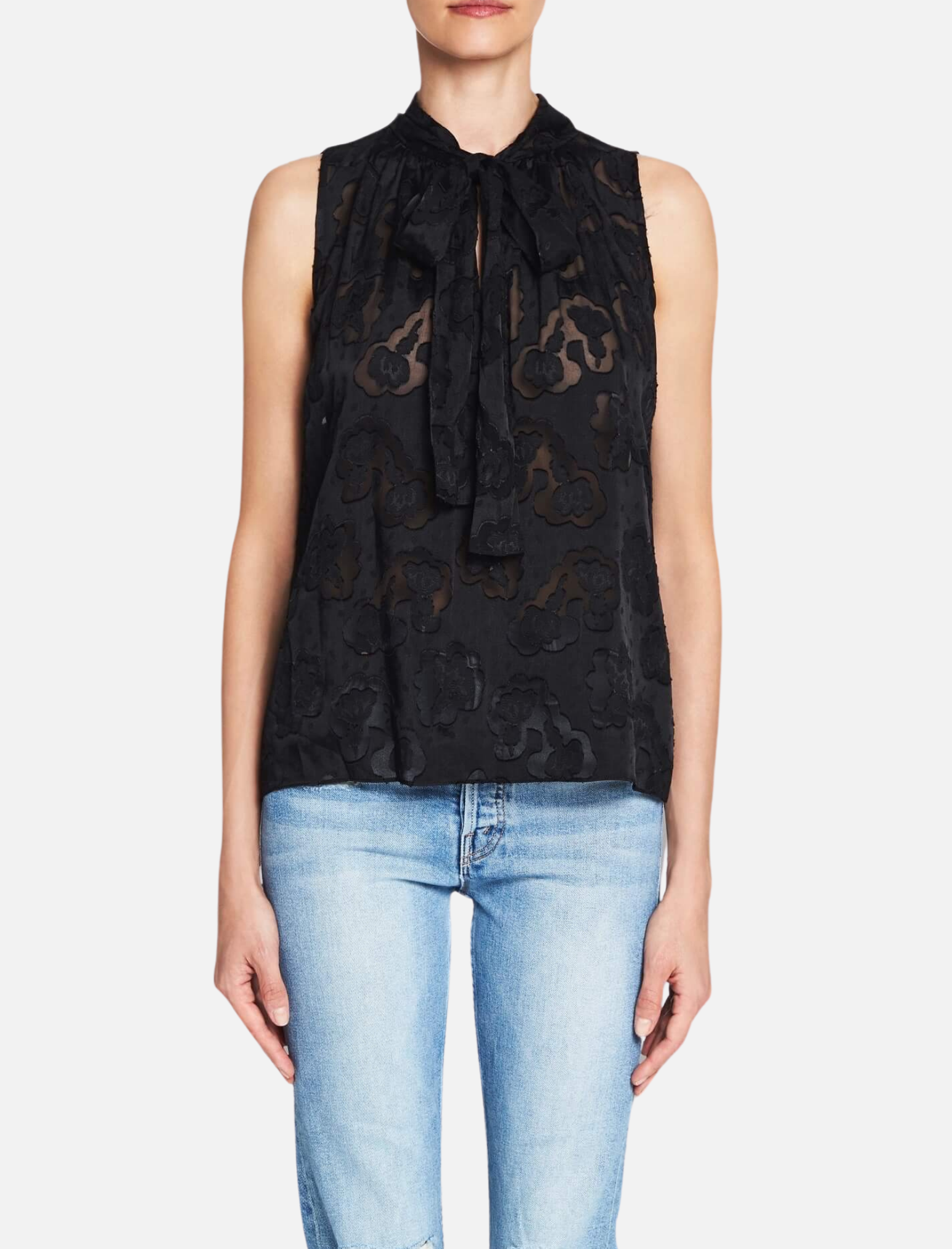 The Rebecca Taylor Short Sleeve Jacquard Scarf Top in Black is true to size