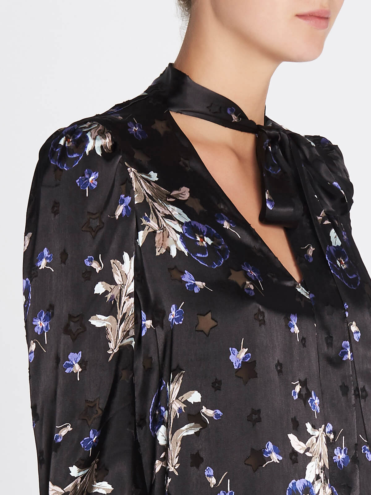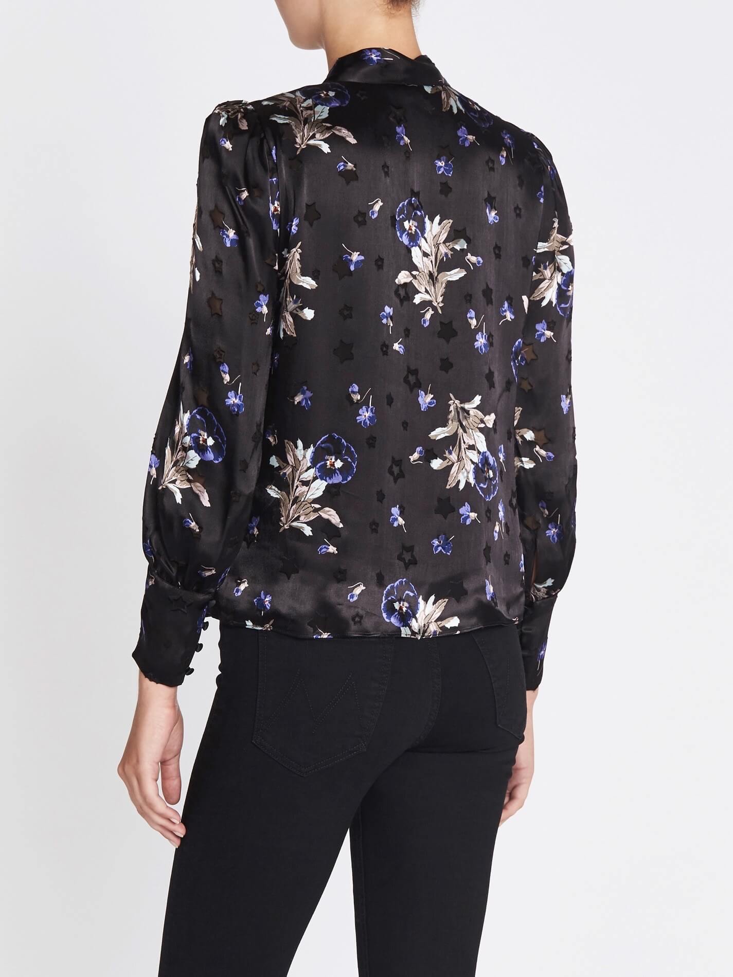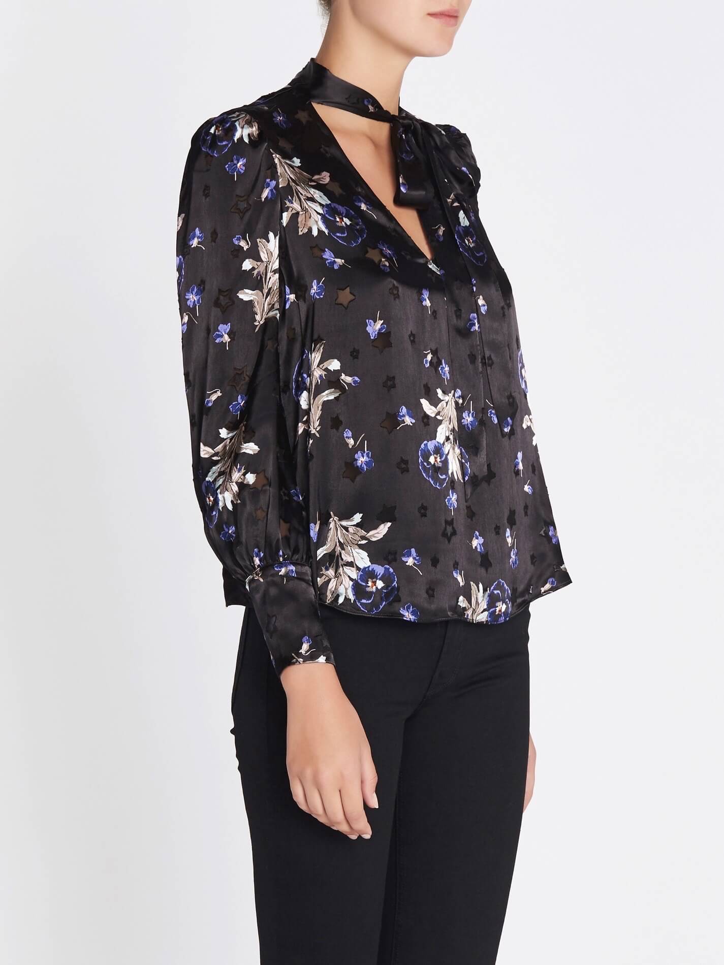 The Rebecca Taylor Violet Floral Satin Burnout Scarf Neck Top in Black Combo us made from 73% Rayon 27% Silk, Lining: 100% Polyester