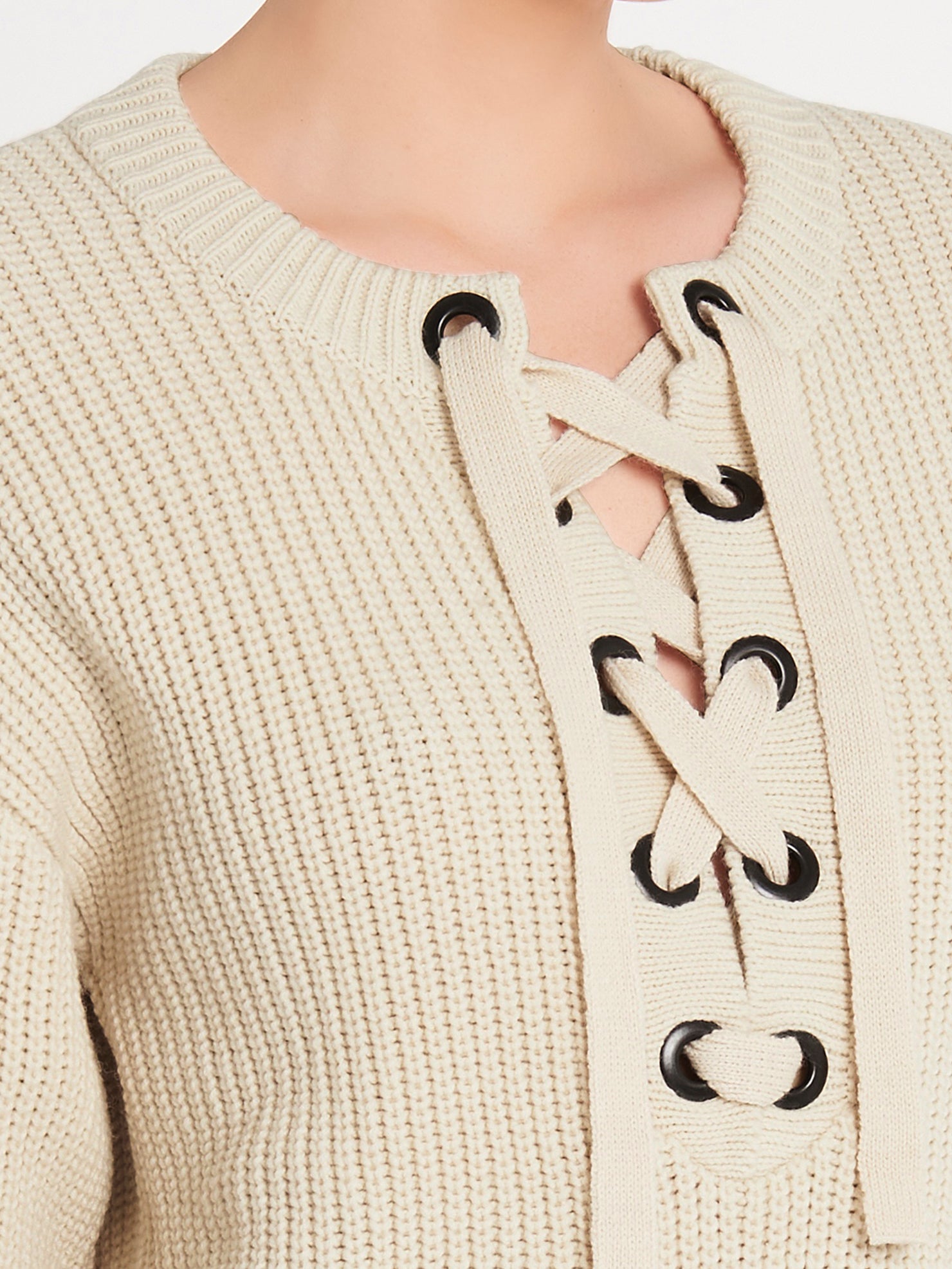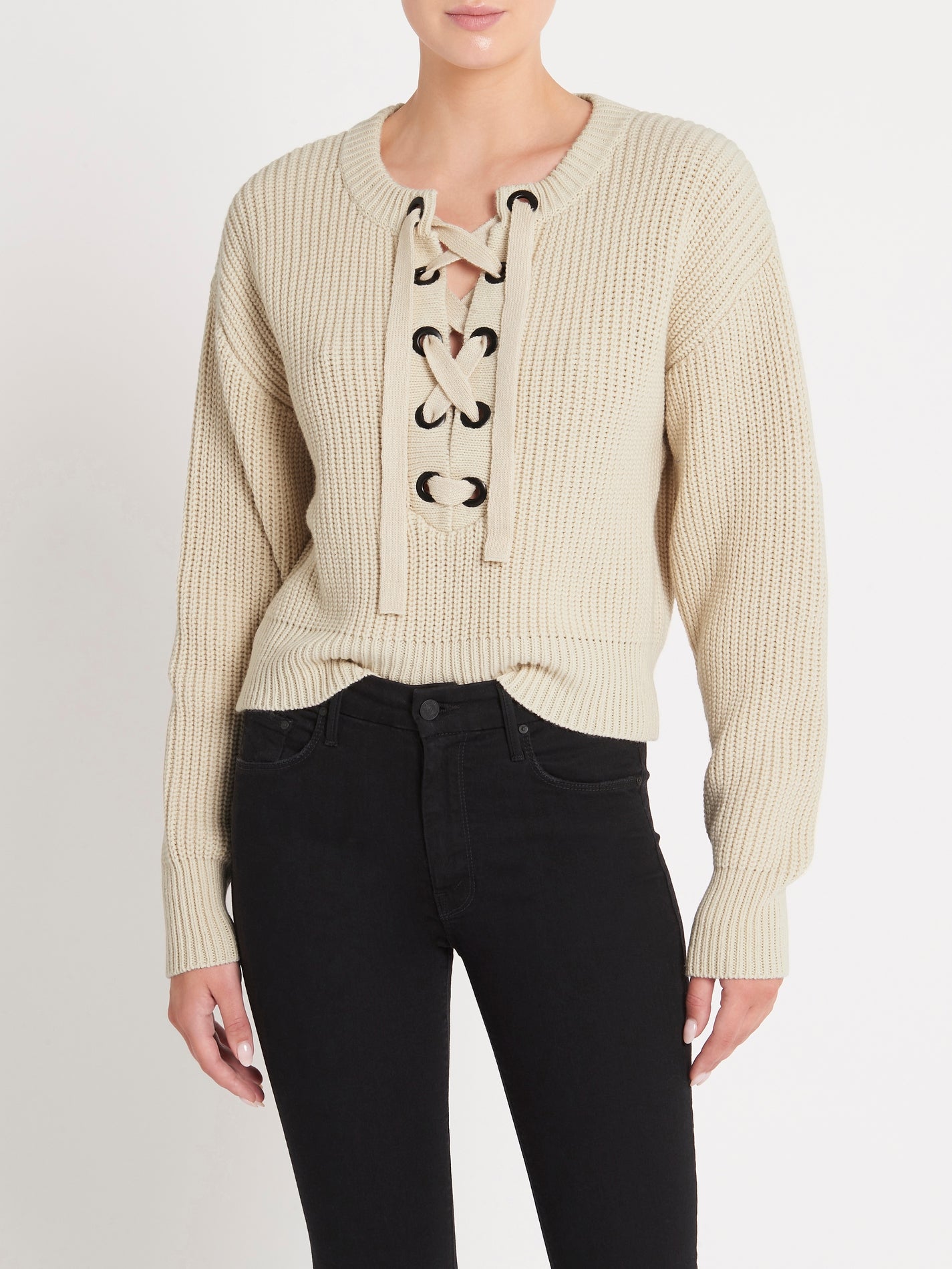 The Baum Und Pferdgarten Carra Knit in Whitecap Grey is effortlessly cool and unbelievably comfortable. This cropped, thick-knit jumper features dropped shoulders, wide sleeves and a lace up to ensure you nail the casual and stylish look every time. Pair it with wide leg pants or jeans for an easy everyday look.