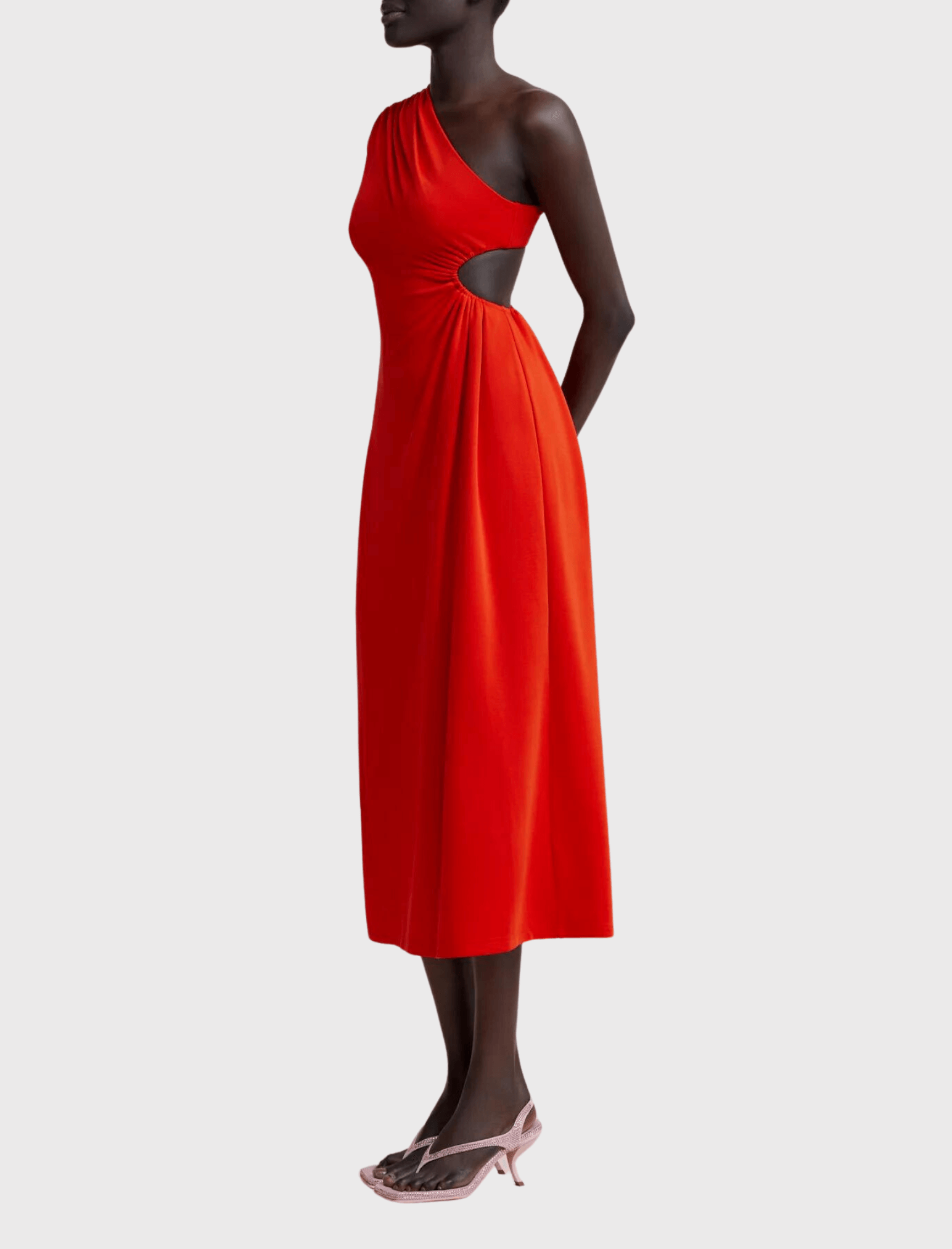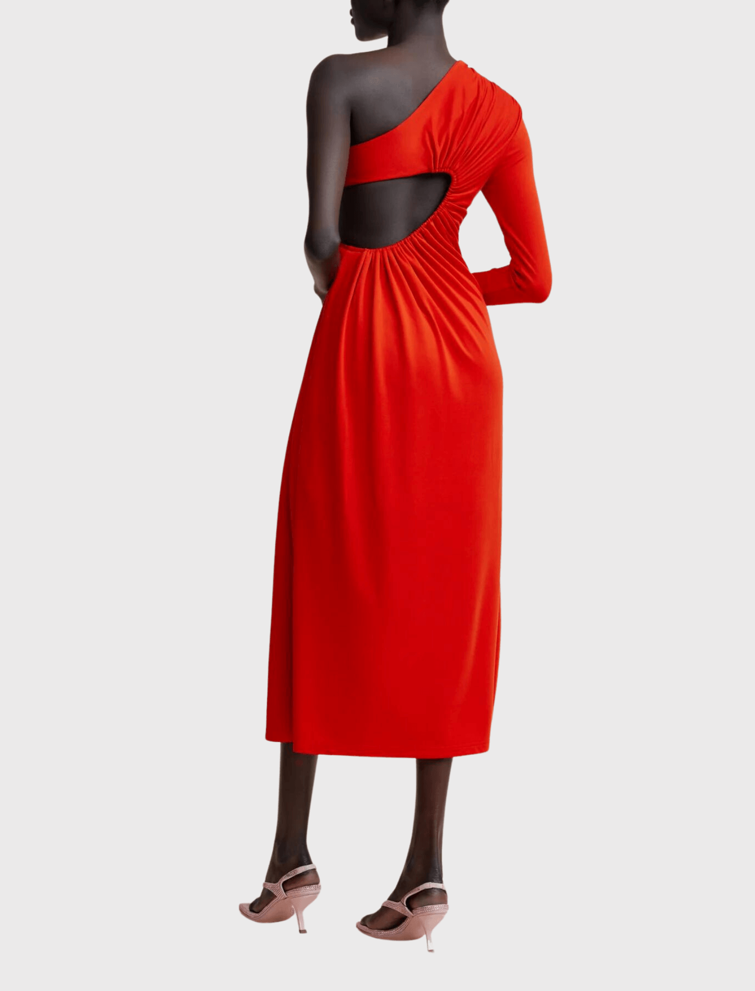 Crafted from a blend of stretch modal, this midi dress features a one-sleeve design, with an elasticated side bodice cut out and gathered fabrications that relax towards the hemline. The result is a timeless and elegant silhouette that exudes effortless luxury. The ultimate style piece for the modern woman